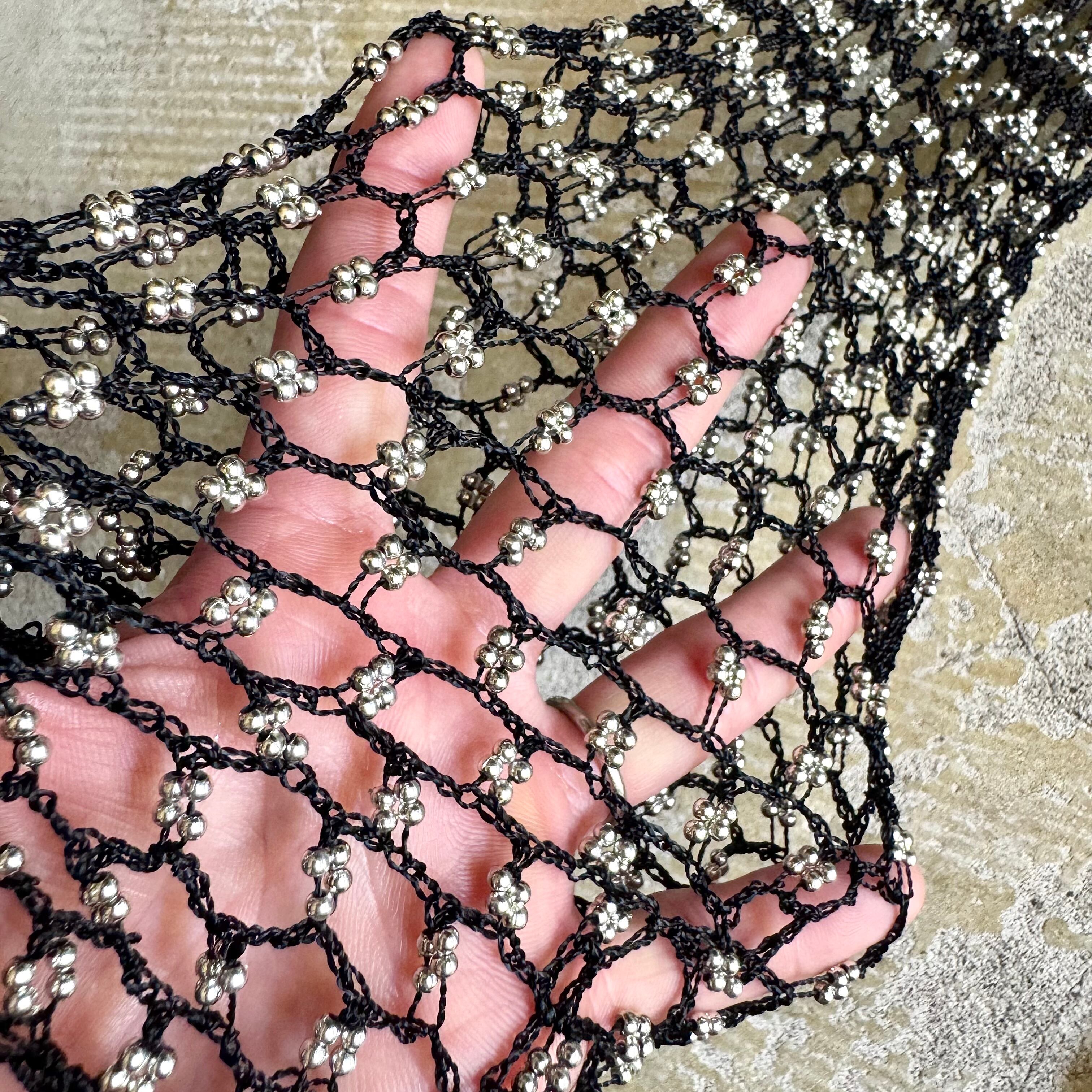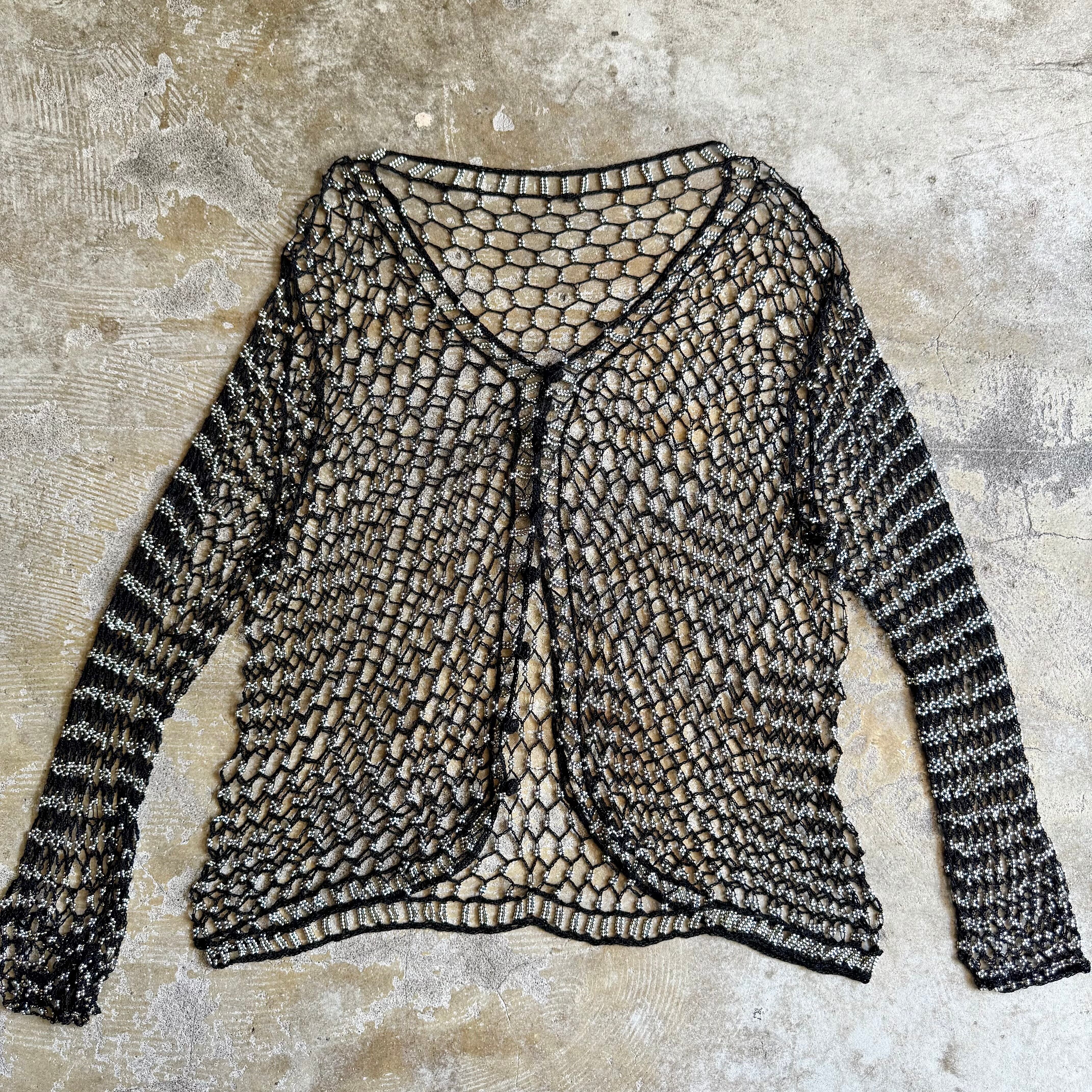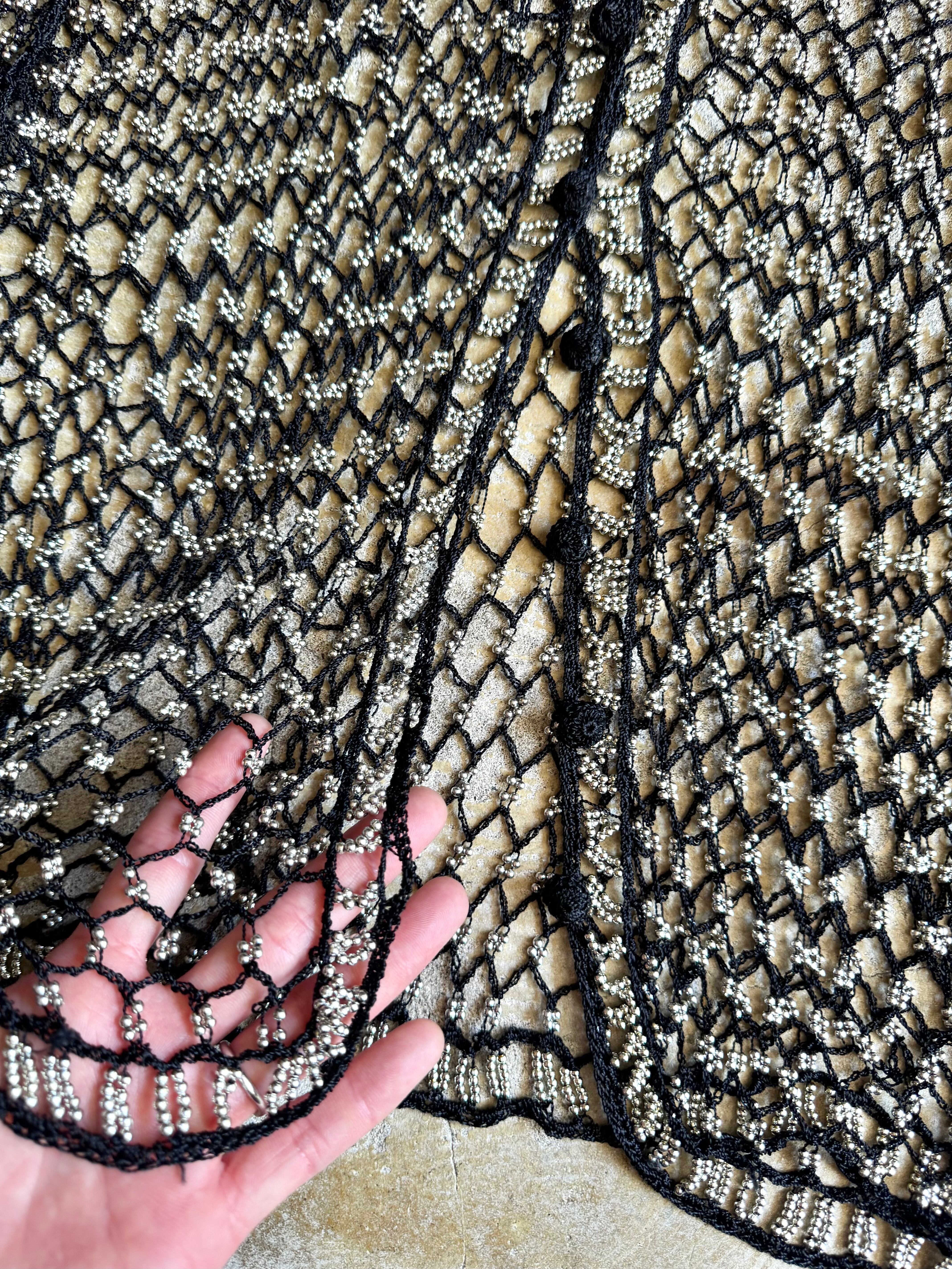 ブラックの鍵編みにシルバーのビーズが施されたカーディガン。Tシャツやワンピース等、様々なアイテムとのレイヤードで、通年でお楽しみいただけます。