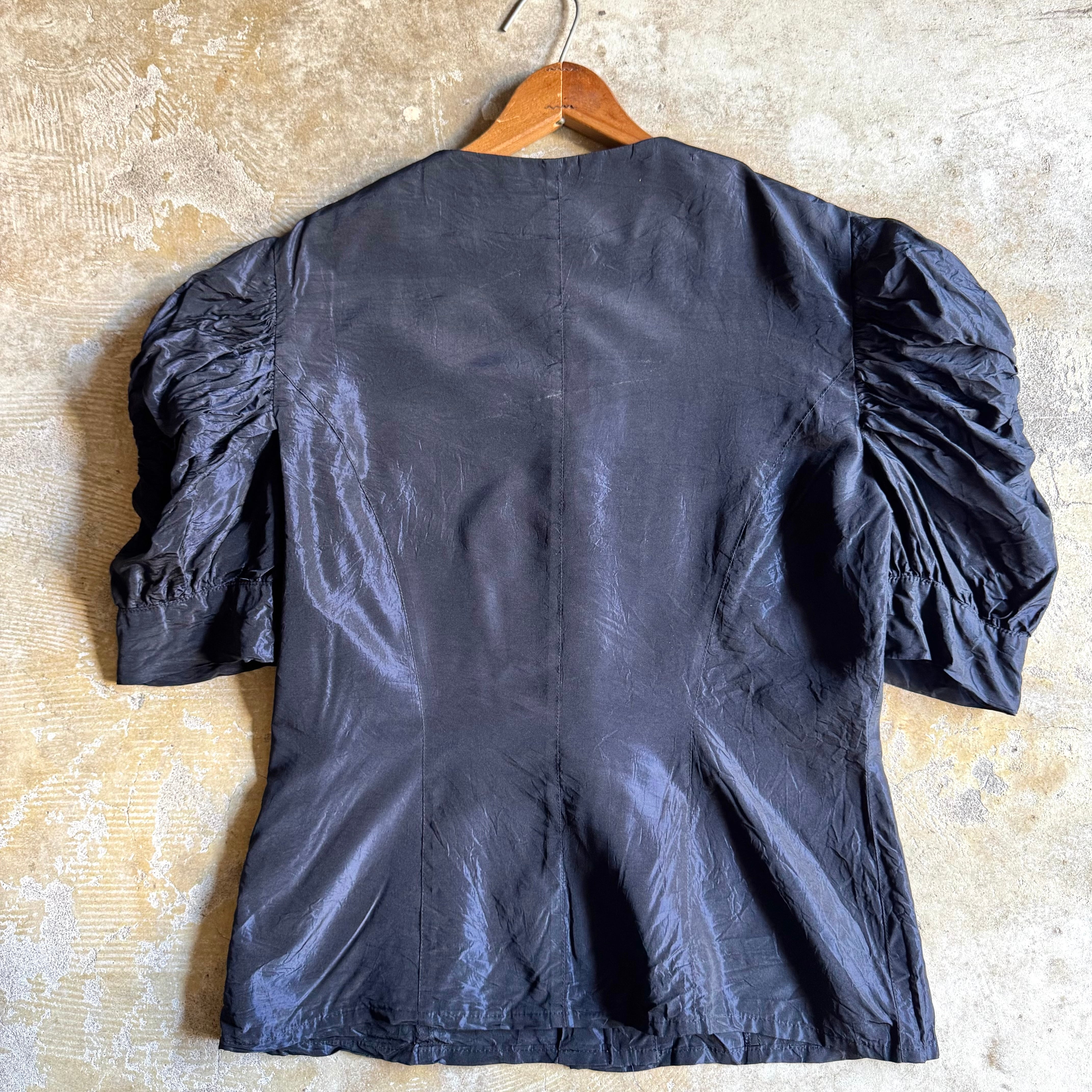 光沢感のあるブラックとボリュームのあるパフスリーブが印象的なこちら。すっきりとした首元の為か甘くなりすぎず、様々なコーディネートで活躍してくれそうです。デニムと合わせてカジュアルにお楽しみいただくのもオススメです。キラッと光るボタンもさりげないアクセントになっています。ハリのある、シャリッとした素材感です。