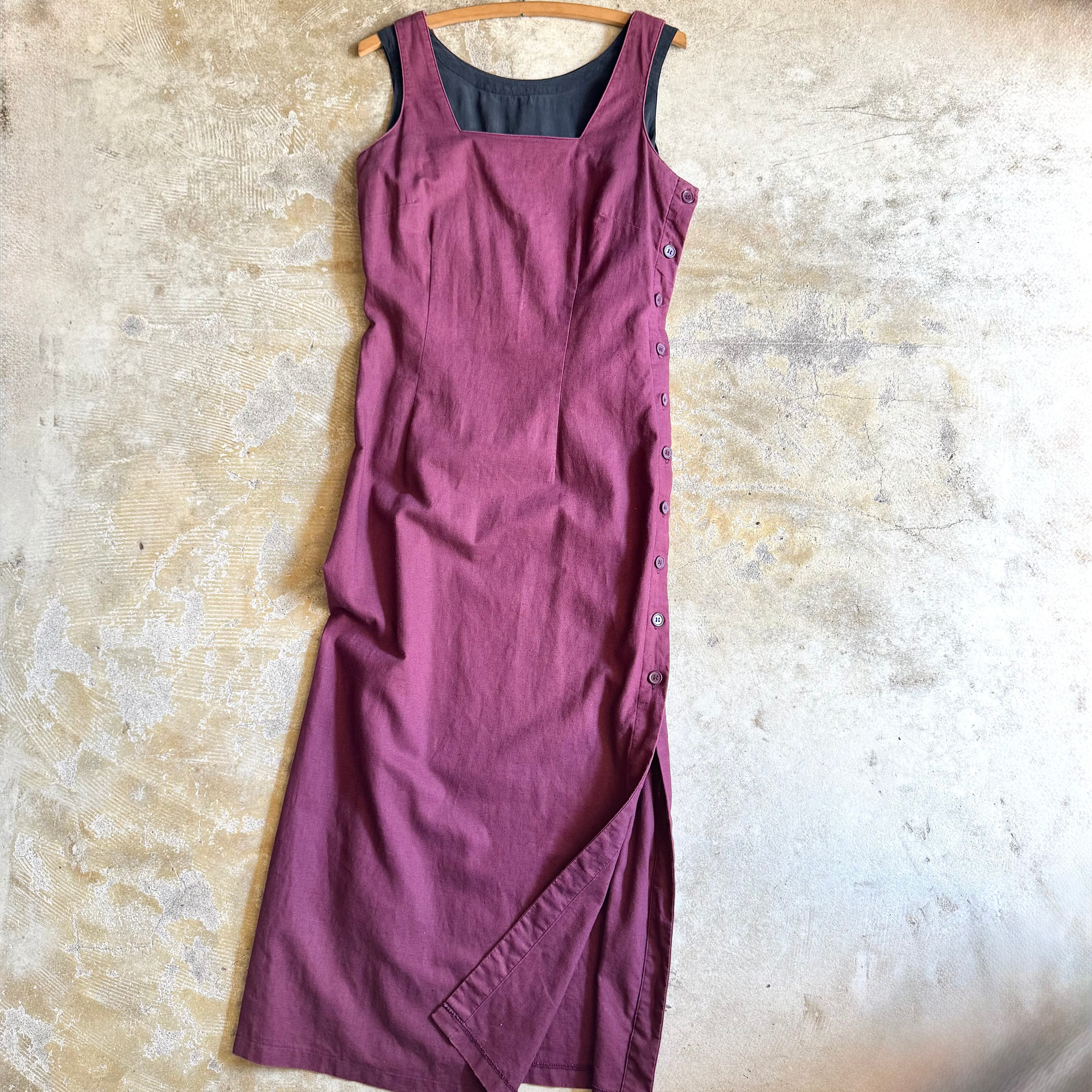 リネン混の柔らかくさらっとした素材感と、落ち着いたボルドー系の色合いがステキなノースリーブワンピース。スクエアにカットされた胸元とサイドボタンがさりげないアクセントになっています。ふんわり広がりすぎないストレートに近いシルエットが大人っぽい雰囲気です。単体ではもちろんですが、裾に近い箇所のボタンをあけてパンツとレイヤードするのもオススメです。さらりとしたコットンリネンの素材感です。裏地は付いていませんが透け感はありません。