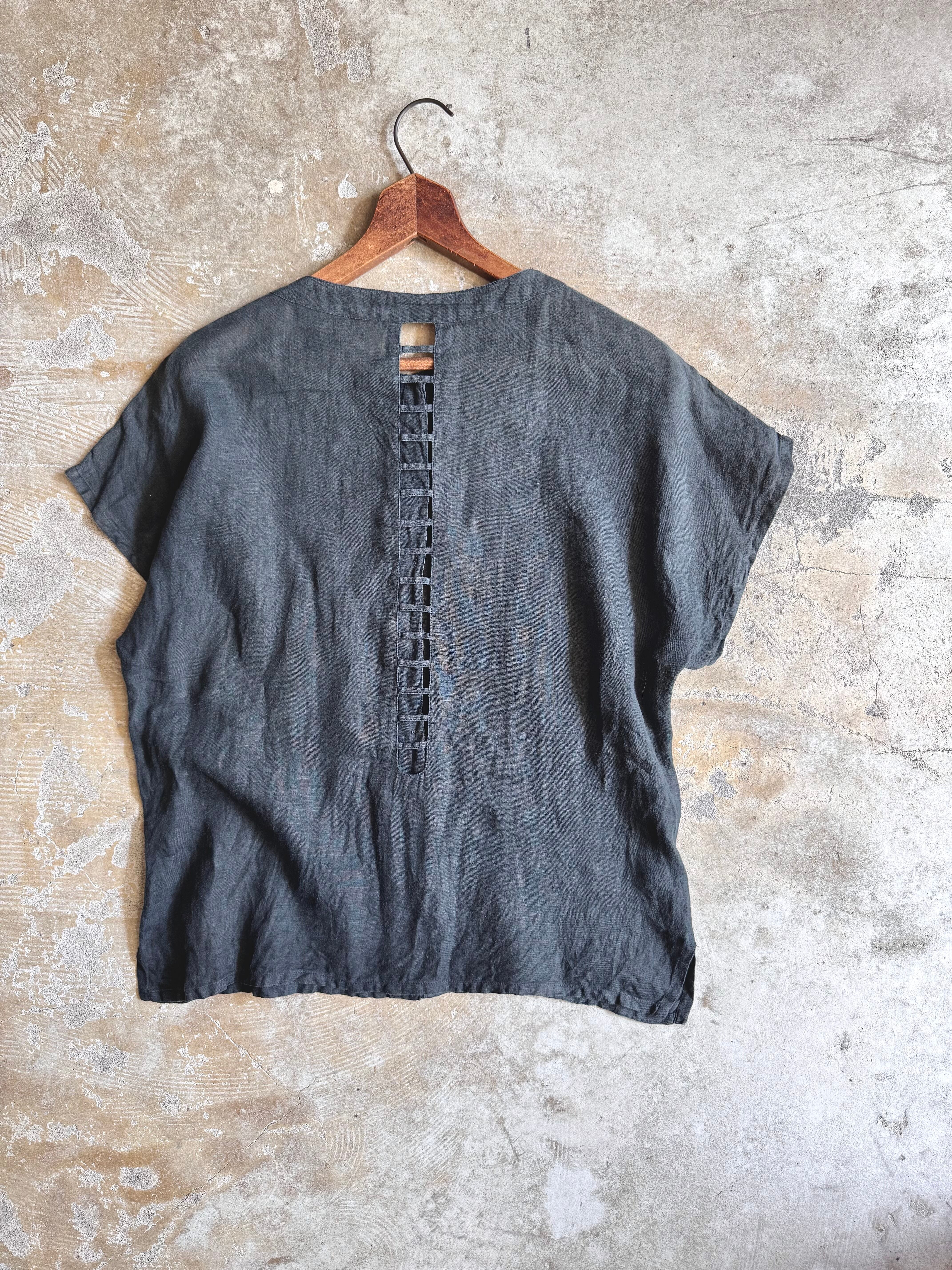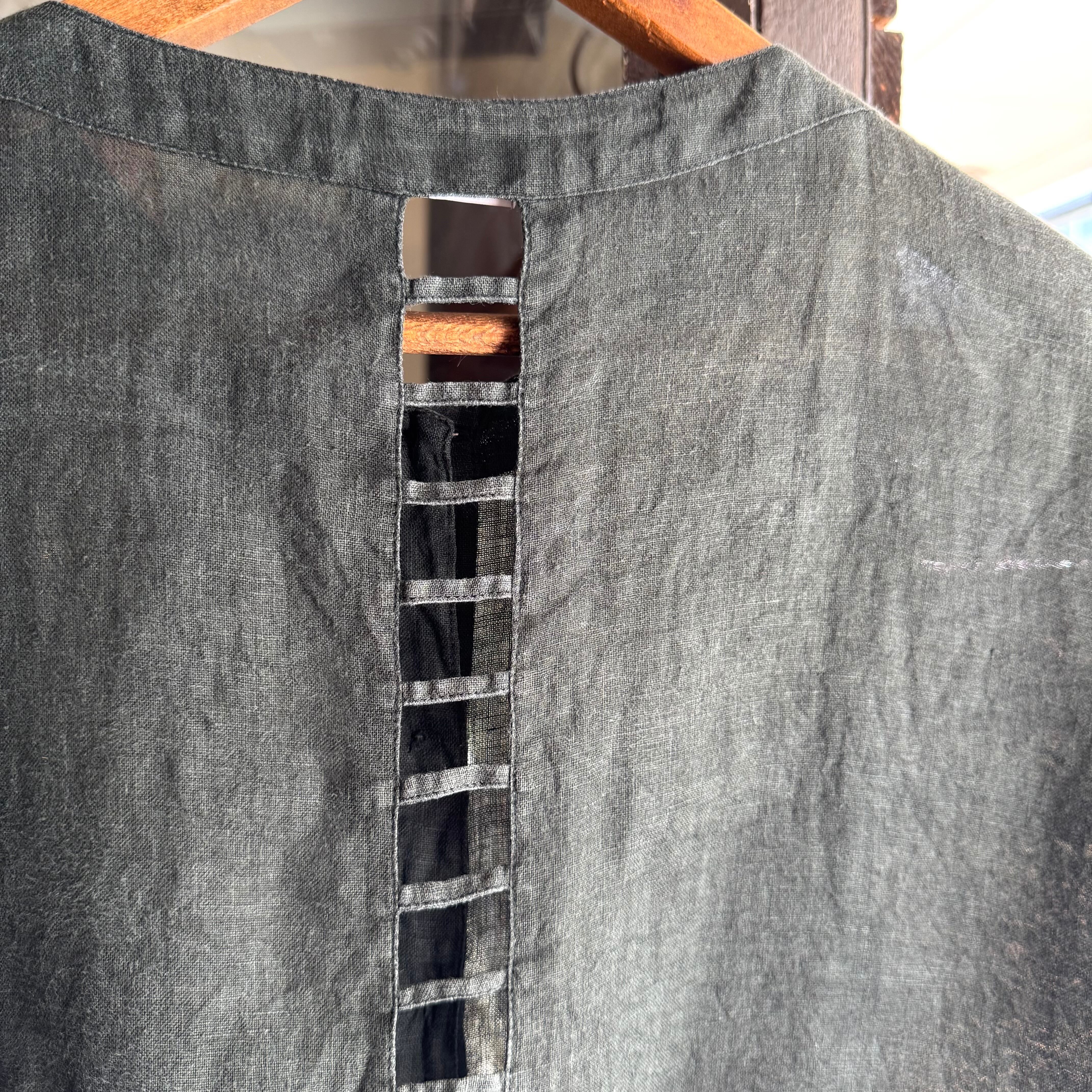 リネンらしいチャコールの色合いが大人っぽい雰囲気のノーカラーシャツ。さりげない肌見せも楽しめる背中のデザインが印象的です。肩に沿って自然に落ちる袖や、ゆったりとしたシルエットはシャツとしてはもちろん、ワンピース等にさっと羽織るスタイリングもオススメです。さらりとした柔らかなリネン素材です。