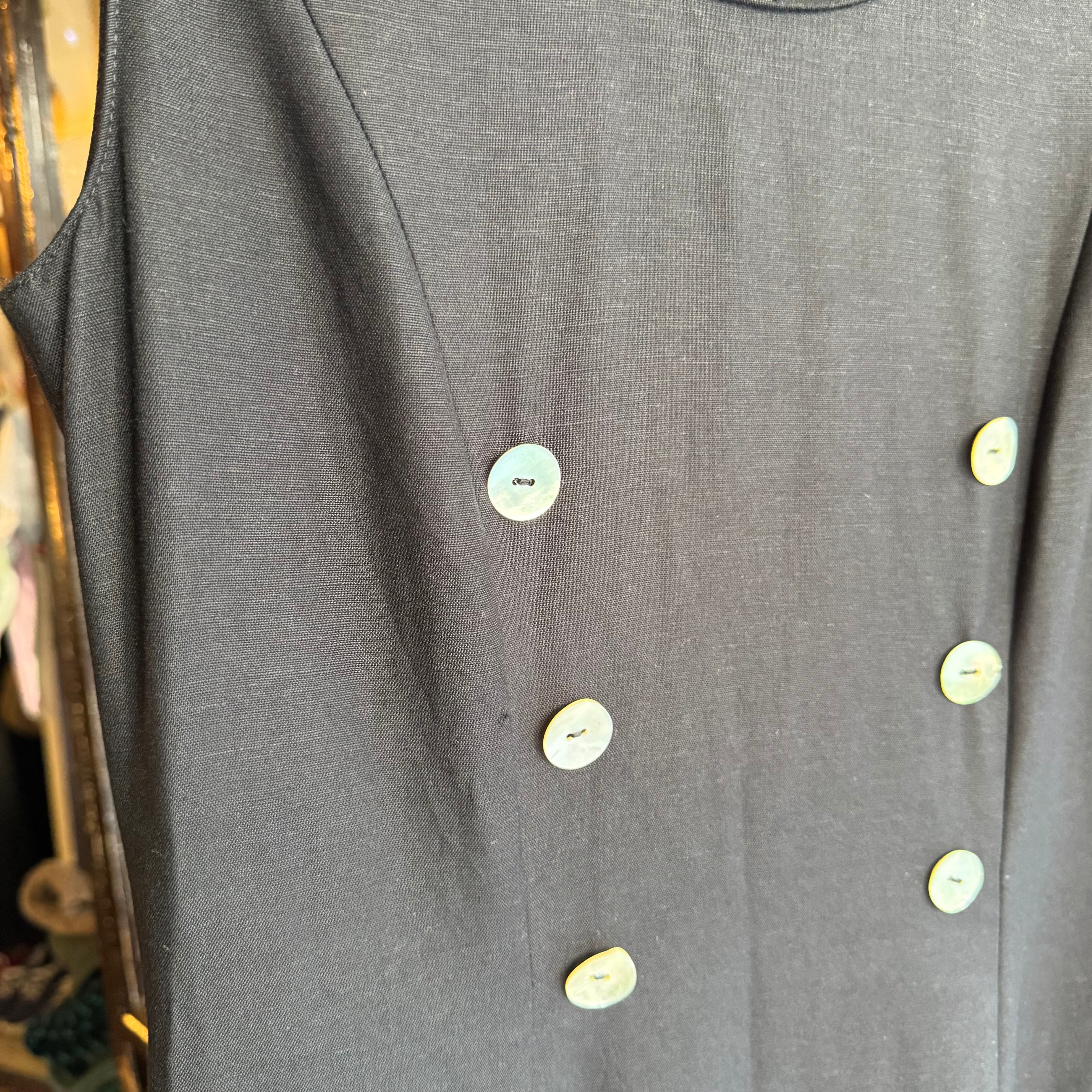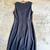 ブラックの色合いとシンプルなデザインが大人っぽい雰囲気のノースリーブドレス。フロントのシェルボタンがさりげないアクセントになっています。しっかり長めな丈と、ふんわり広がりすぎず自然に下に落ちるようなシルエット。パンツを合わせるコーディネートもオススメです。さらりとした、少し重みのあるしなやかな素材感です。裏地は付いていません。光の加減によっては少し透けることもある為、インナーやボトムスのご着用をお勧め致します。