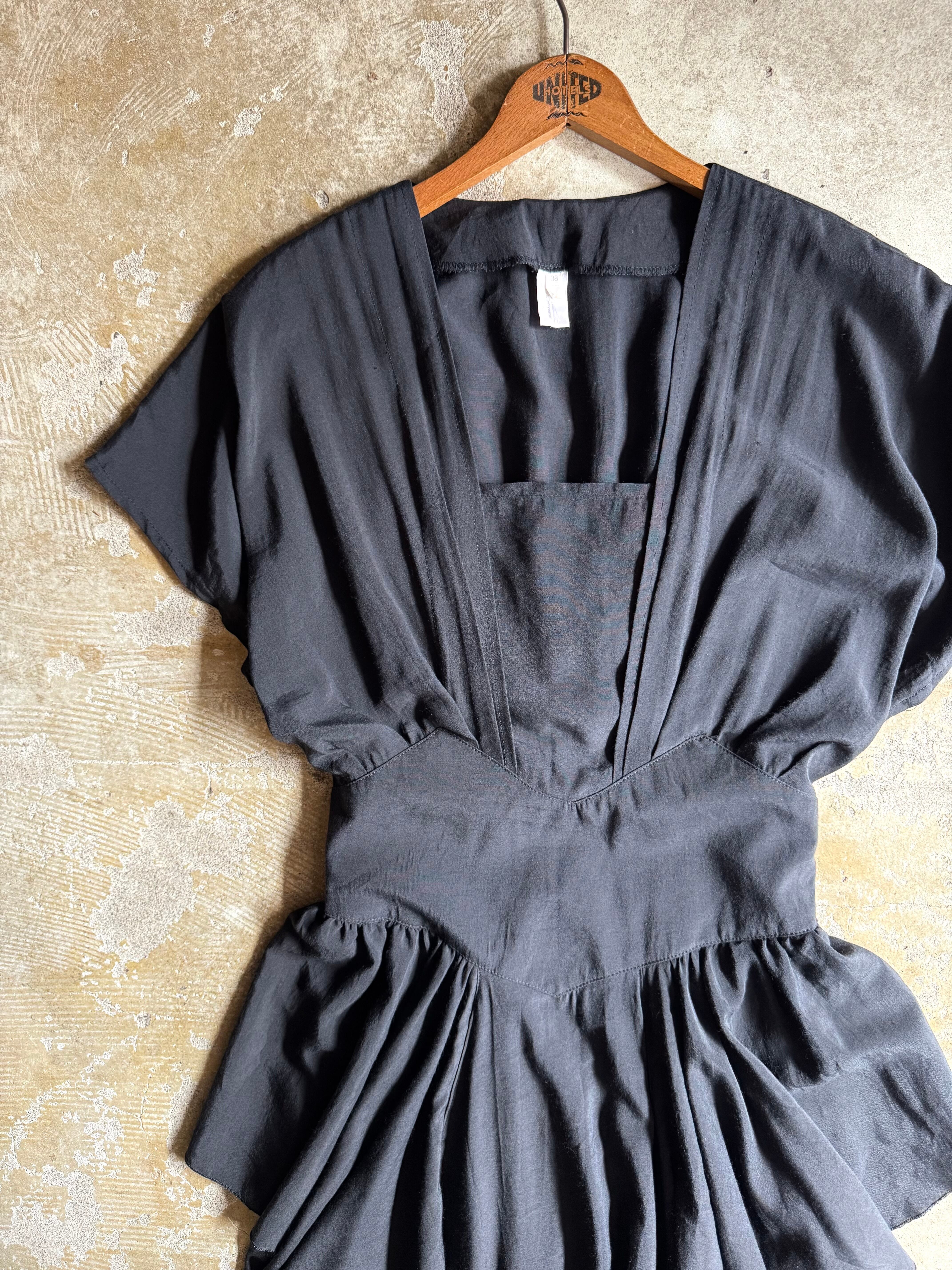 ブラックの色合いと、しなやかに揺れるフロントのドレープが印象的なブラックワンピース。ふんわり広がらず自然に下に落ちるシルエットが大人っぽく、普段使いはもちろん、きちんとしたお席でのドレスとしてもオススメです。長袖アイテムやパンツとのレイヤード等、様々な雰囲気でお楽しみいただけます。さらりとした柔らかくしなやかな素材感です。裏地は付いていません。ほぼ透け感はありませんが、光の当たり方によっては少し透けることもある為、インナーやボトムスのご着用をお勧めします。
