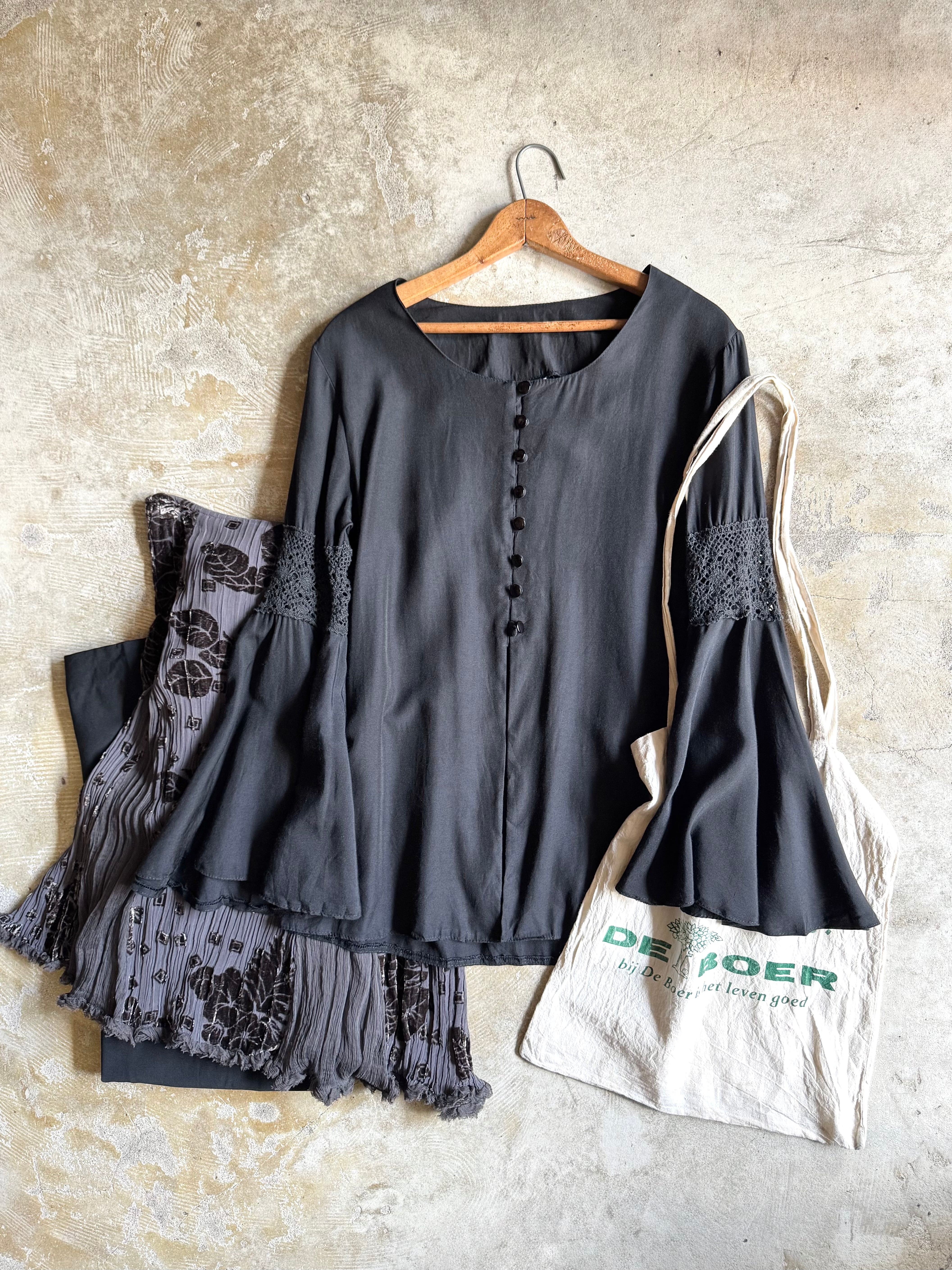 シックなブラックの色合いが落ち着いた雰囲気のブラウスジャケット。袖のさりげない透け感と、肘のあたりからしなやかに揺れるフレアスリーブ。きれいめに女性らしくはもちろん、デニム等とカジュアルにコーディネートするのもオススメです。さらりとした軽めな素材感なので、ブラウス感覚でお楽しみいただけます。