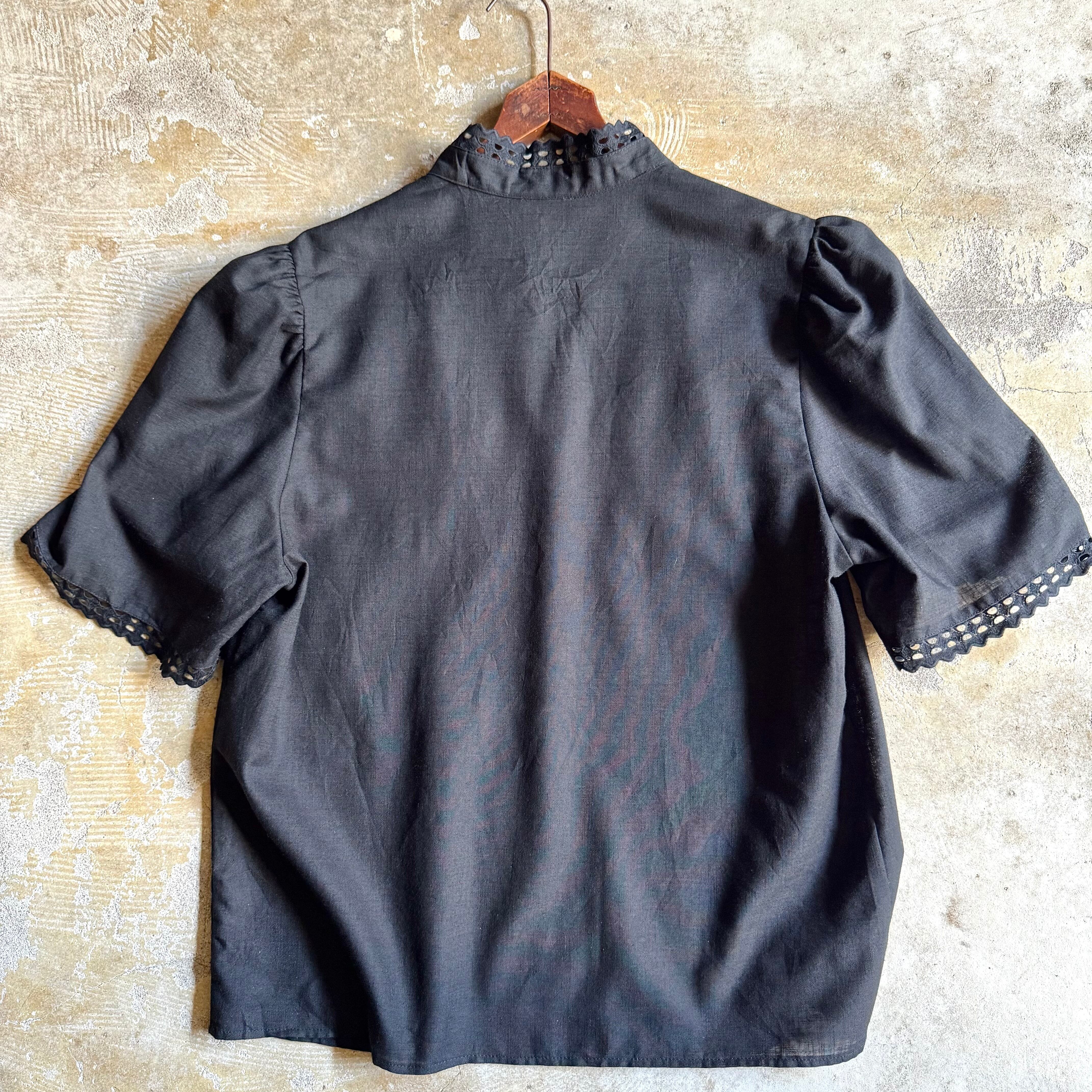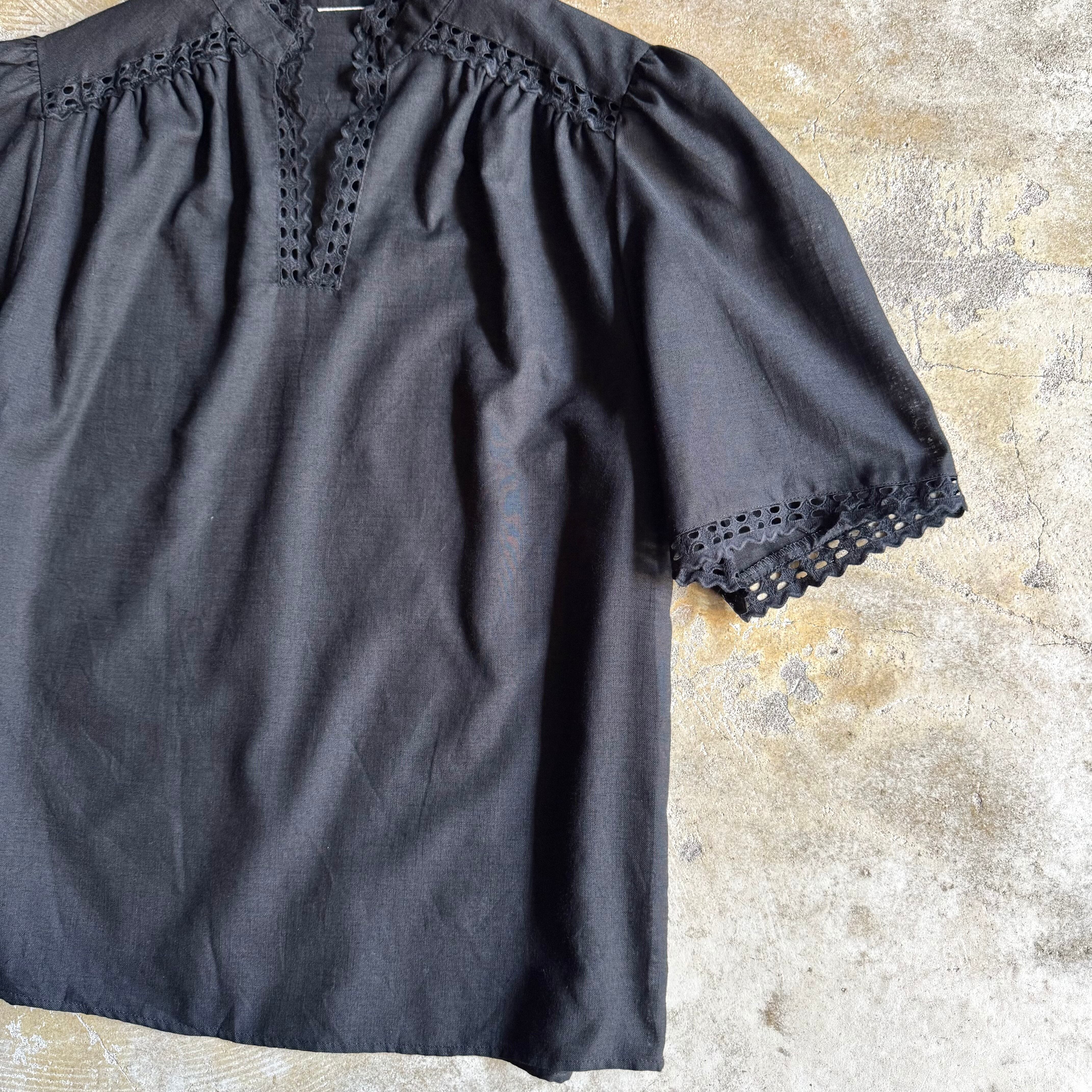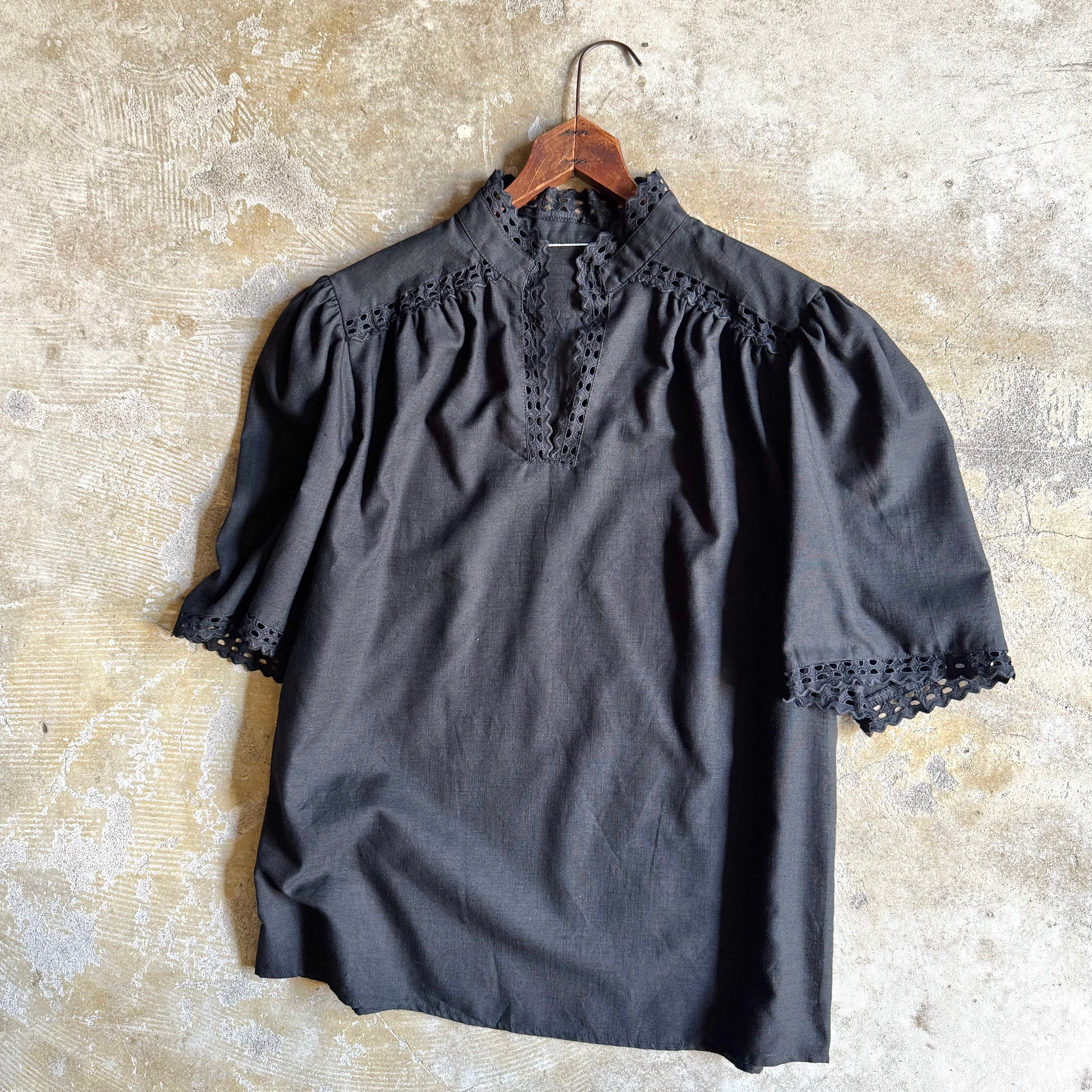 スタンドカラーのすっきりとした首元と、程よいパフスリーブが印象的なプルオーバーブラウス。ブラックなので甘くなりすぎず、大人っぽい雰囲気でお楽しみいただけます。デニムと合わせたカジュアルなコーディネートもオススメです。表記がありませんが、コットンリネンのような少しハリのある、さらりとした素材感です。