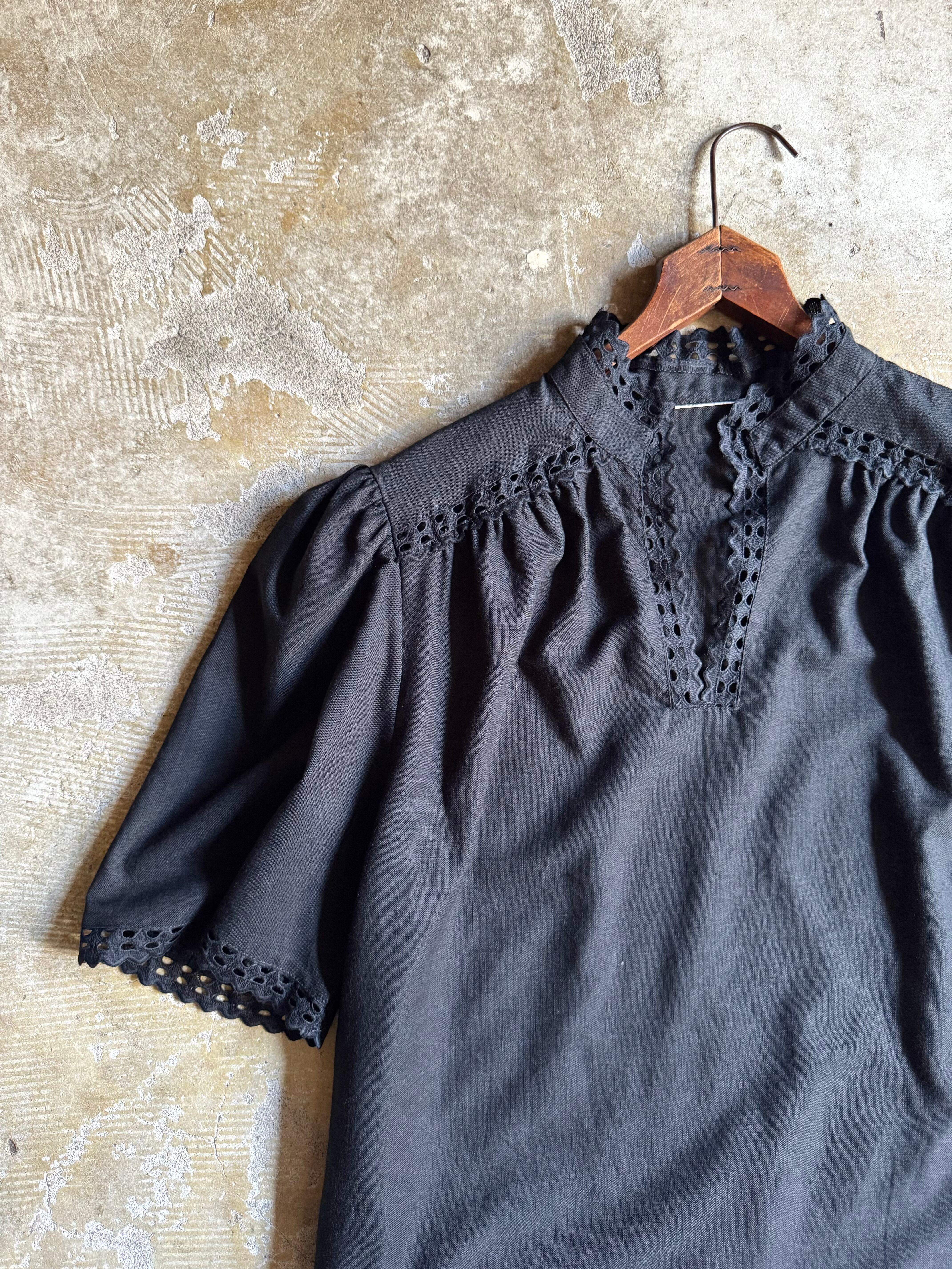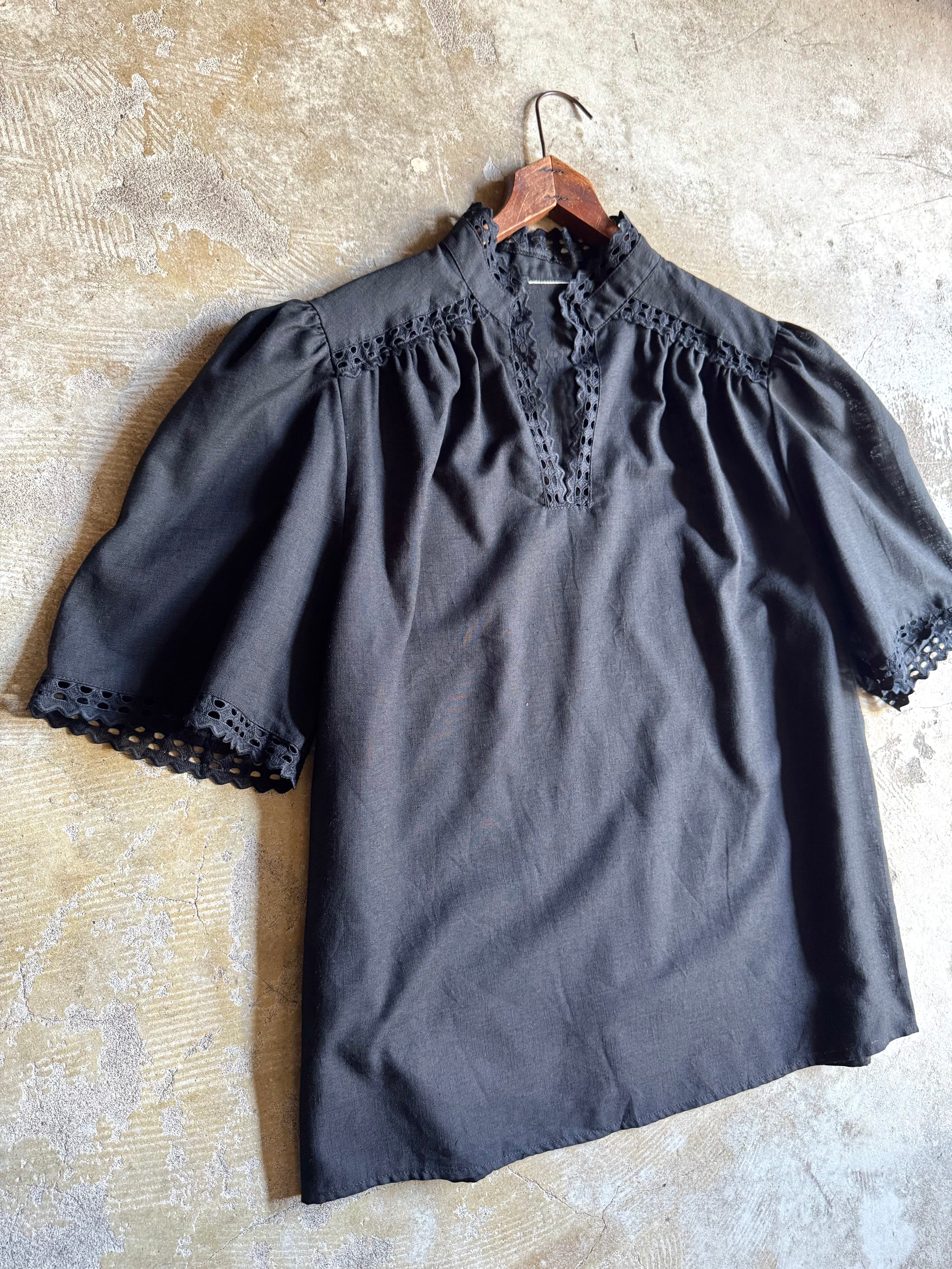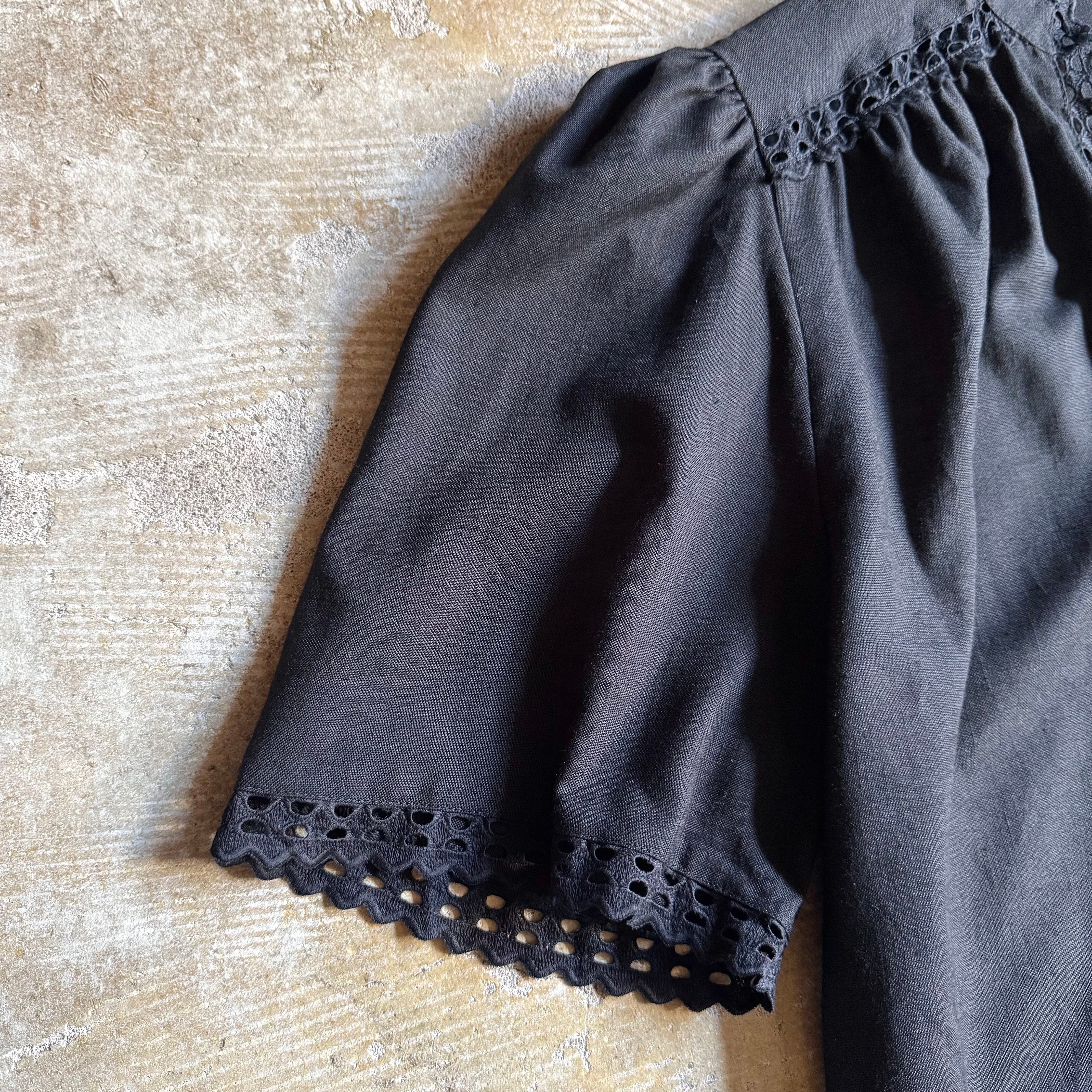 スタンドカラーのすっきりとした首元と、程よいパフスリーブが印象的なプルオーバーブラウス。ブラックなので甘くなりすぎず、大人っぽい雰囲気でお楽しみいただけます。デニムと合わせたカジュアルなコーディネートもオススメです。表記がありませんが、コットンリネンのような少しハリのある、さらりとした素材感です。