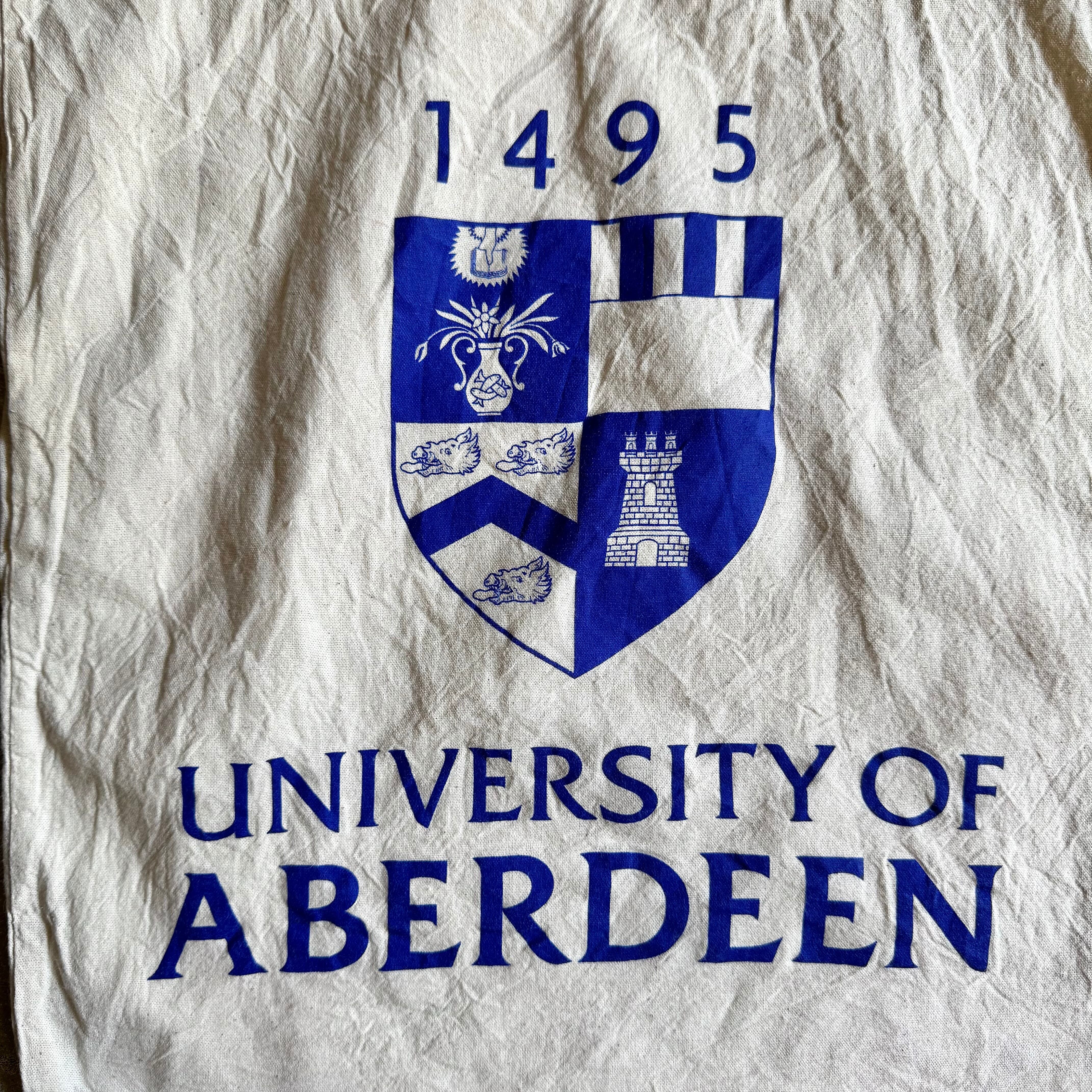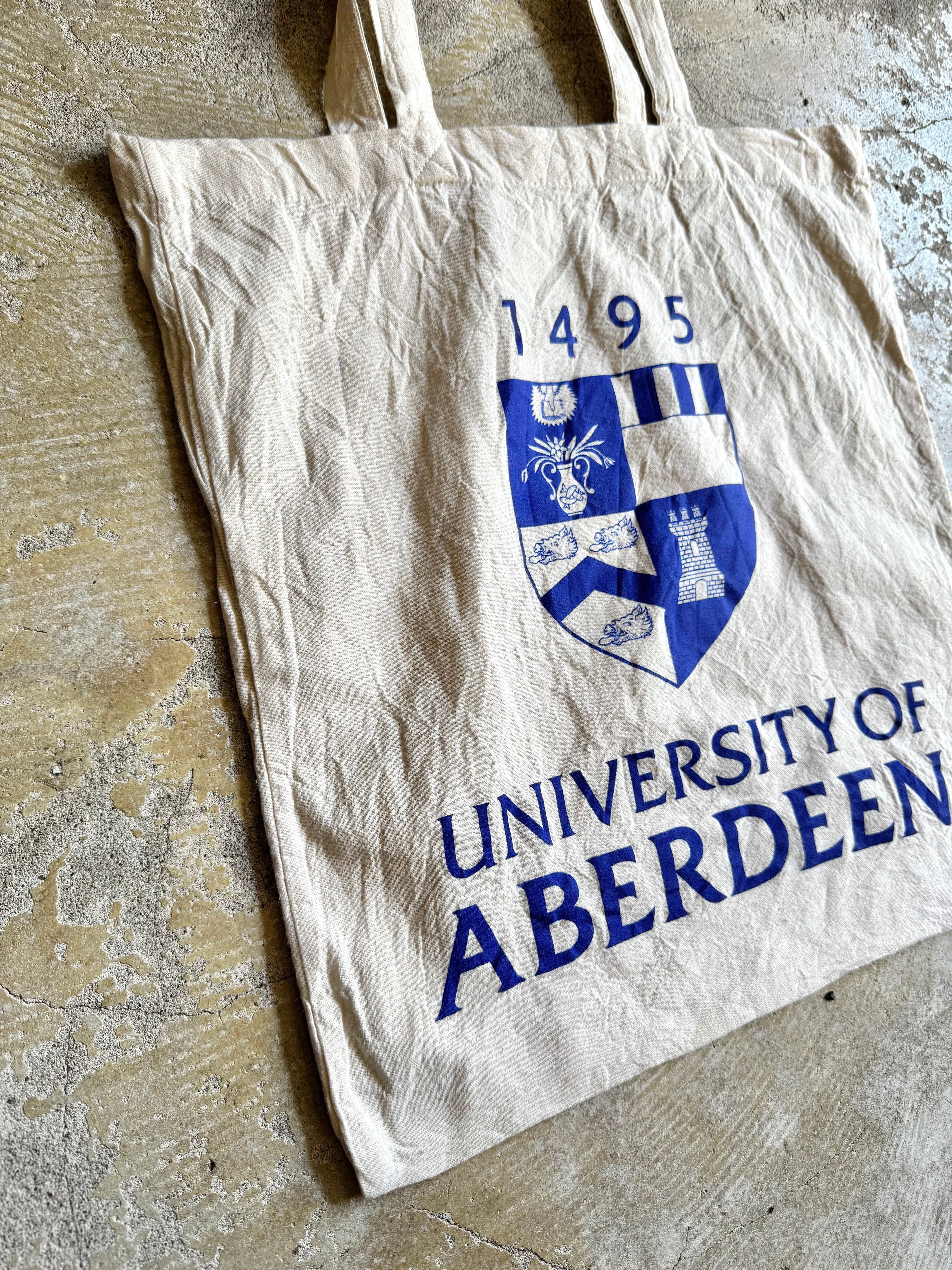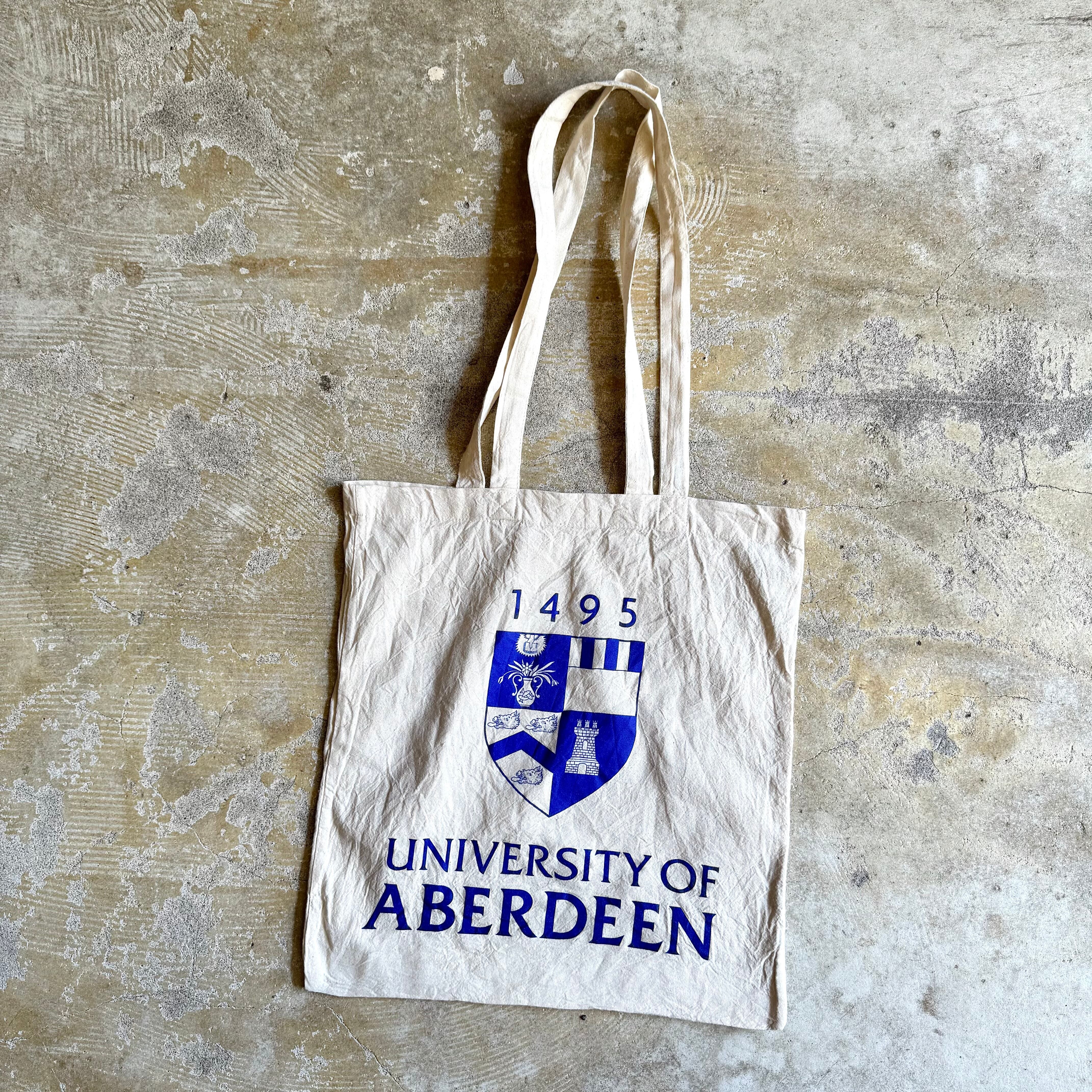メインバッグとしても、ショッピングバッグとしてもお使いいただけるユーロ エコバッグ。こちらは【UNIVERSITY OF ABERDEEN】のロゴとエンブレムがセンスよくプリントされています。肩がけが可能な持ち手の長さも魅力的です。肌触りのよいコットン素材です。