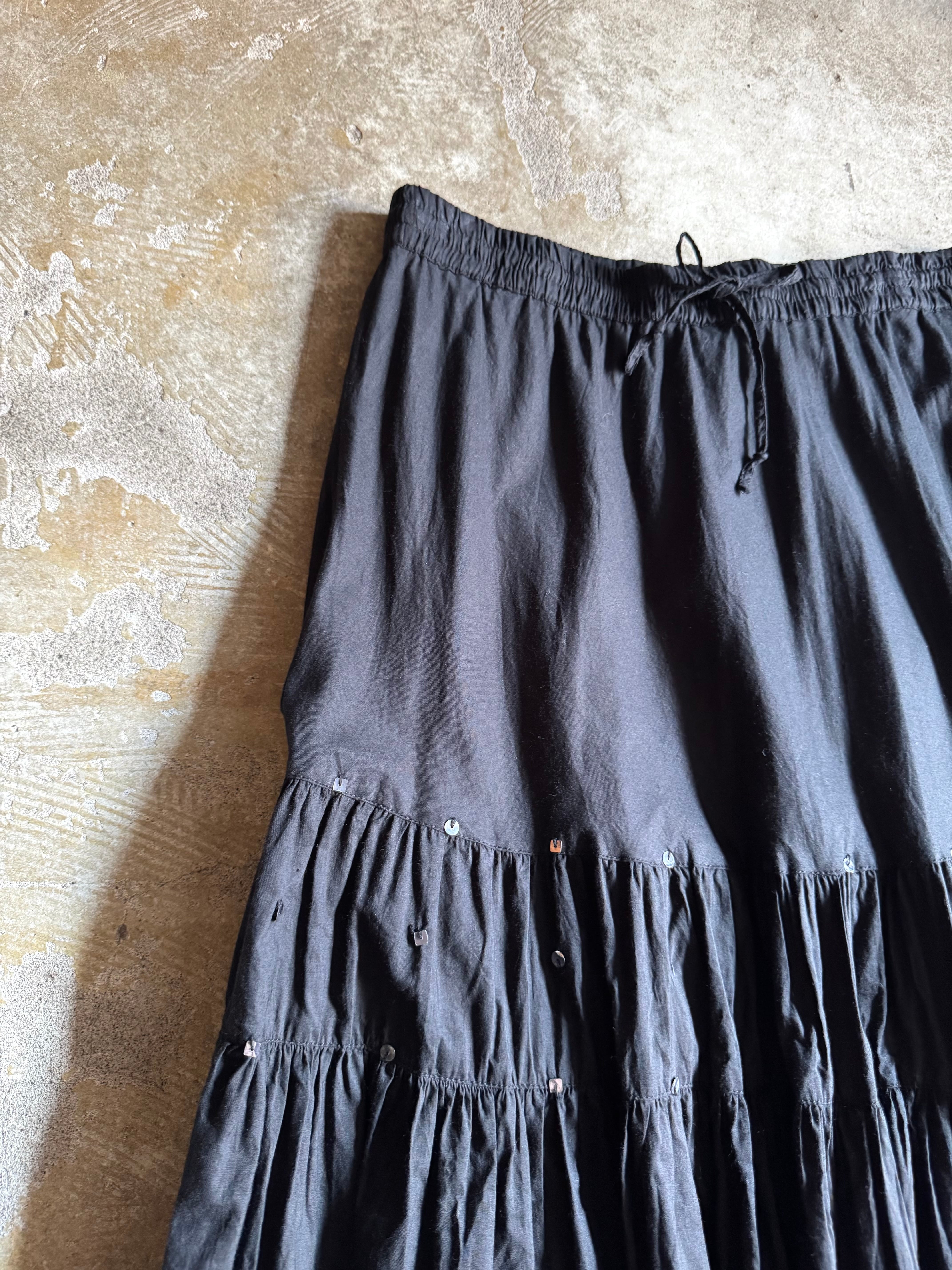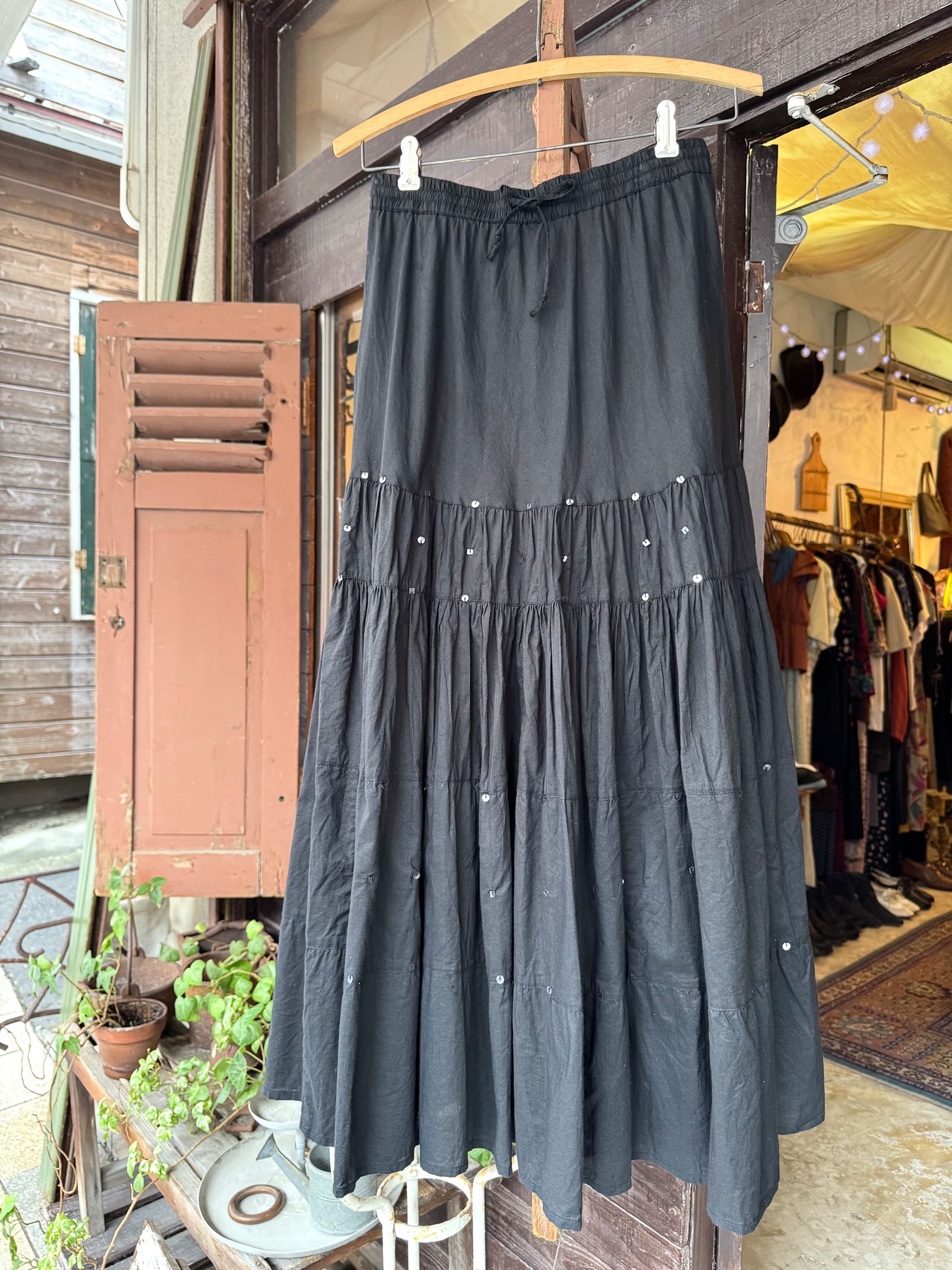 ブラックコットンのさらりとした素材感と、ボリュームのあるティアードが素敵なロングスカート。散りばめられた丸や四角のスパンコールが、日の当たる角度によって、控えめにキラッと光ります。生地をたっぷり使っていますが、ふんわり広がりすぎず自然にしなやかに下に落ちる大人っぽいシルエット。単体ではもちろん、パンツとのレイヤードでお楽しみいただくのもオススメです。裏地が付いています。