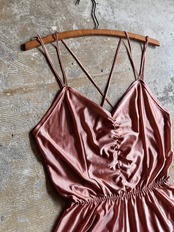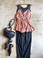 少しくすんだサーモンピンクのような色合いが印象的なこちら。キャミソールではなく、キャミソールロンパースになります。ボトムスにパンツをインしたり、ボトムスを上からレイヤードしてキャミソール部分だけを活かしたコーデにしたりと、意外にたくさんの着回しが可能です。少し光沢のある、さらりとしたしなやかな素材感です。裏地は付いていません。インナーやボトムスと併せてお楽しみください。