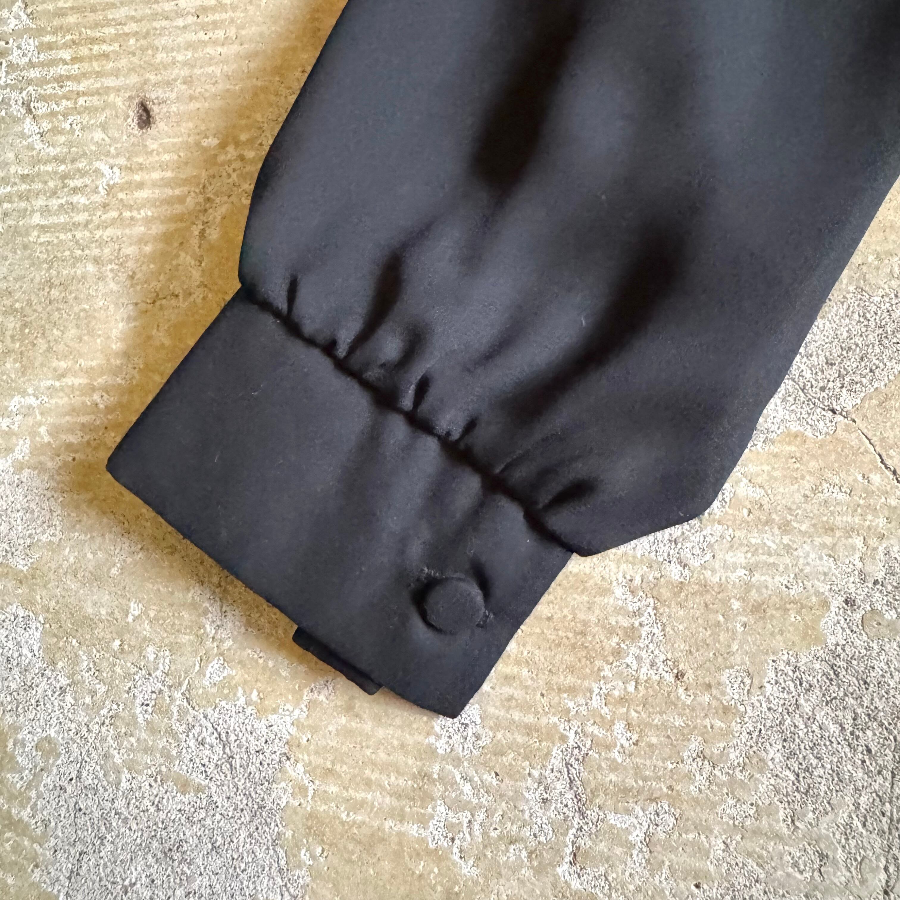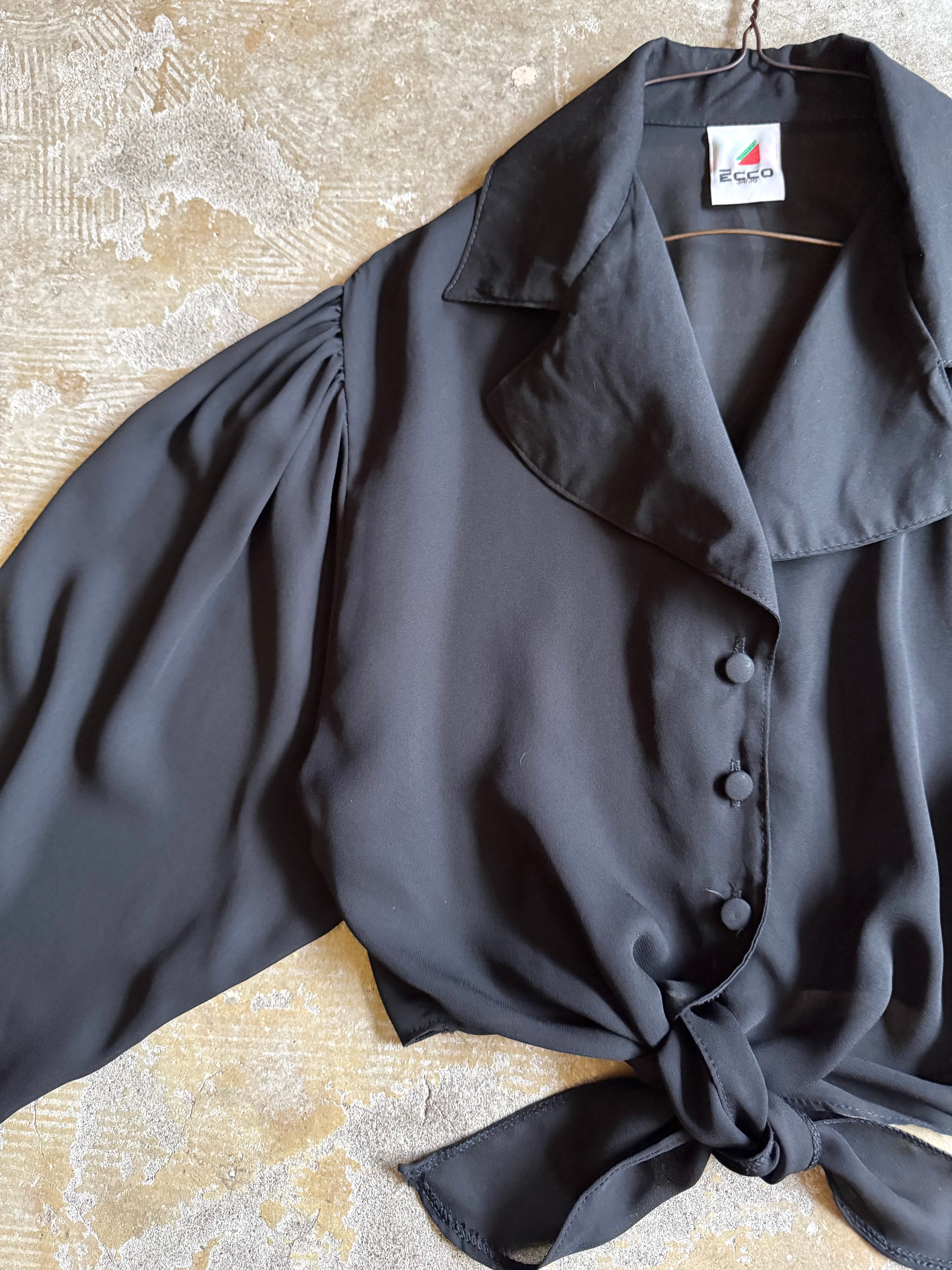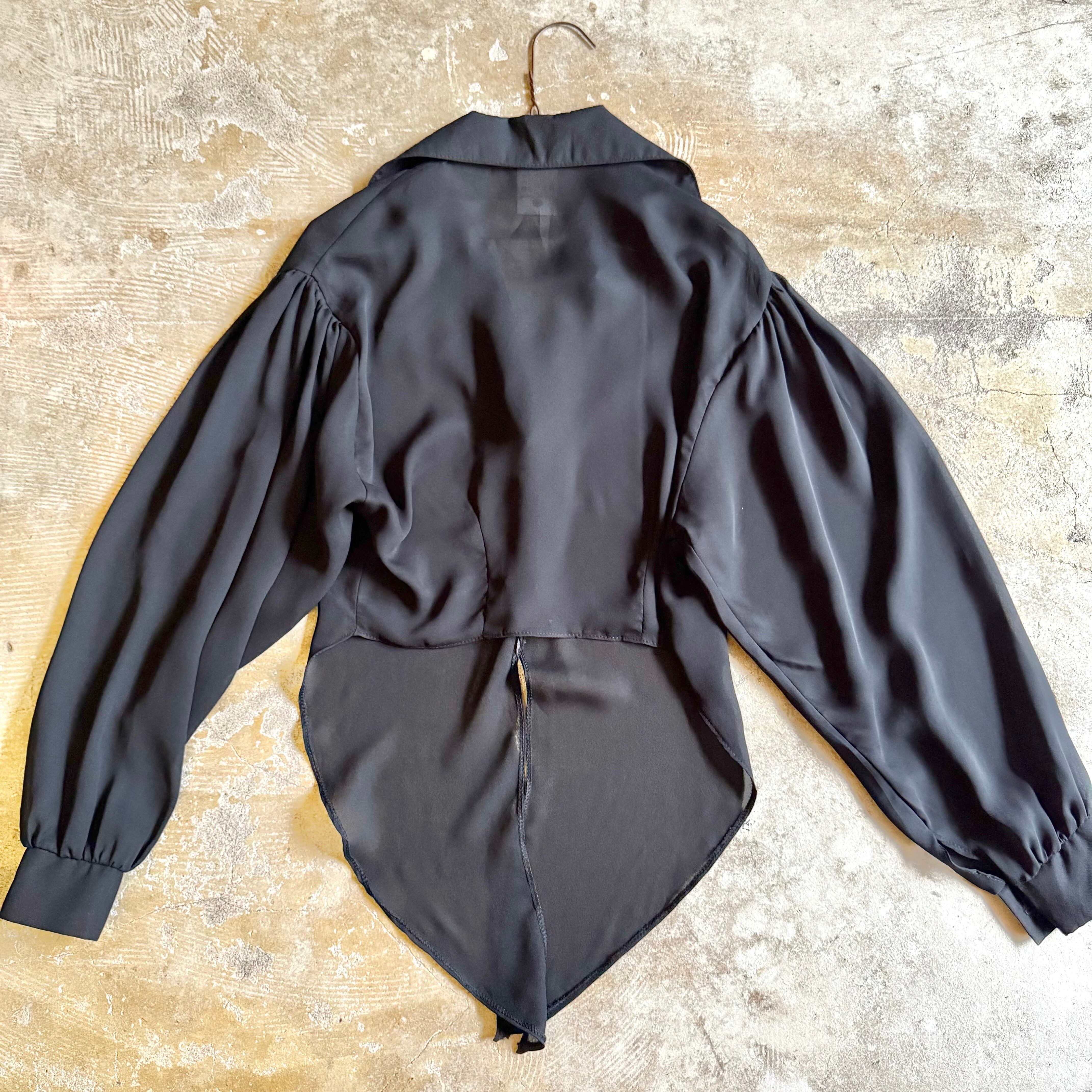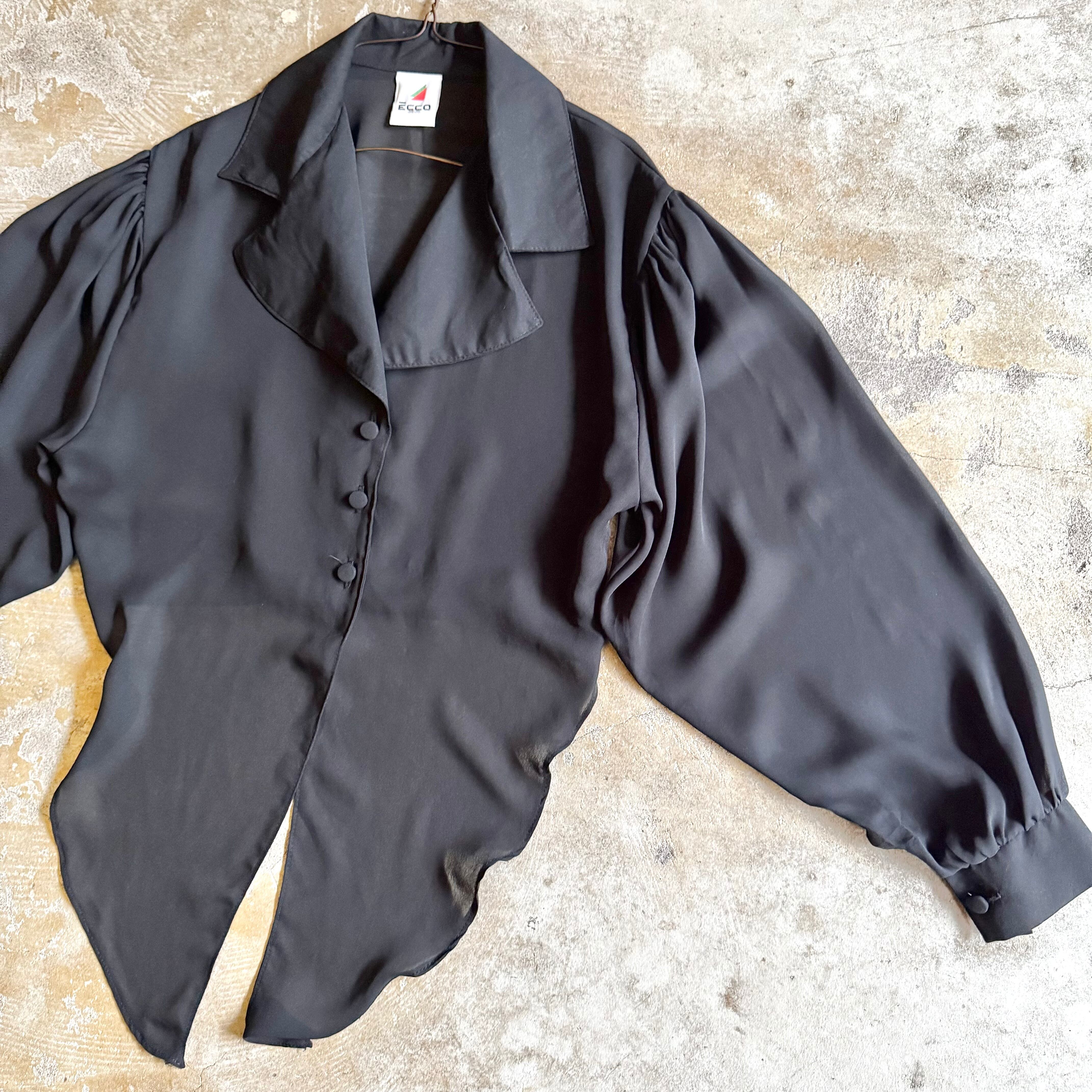 オープンカラーのすっきりとした首元と、程よいパフスリーブが印象的なブラッククロップドシャツ。透け感を活かして、Tシャツやワンピース等、様々なアイテムとのレイヤードでお楽しみいただけます。さらりとしたしなやかな素材感です。