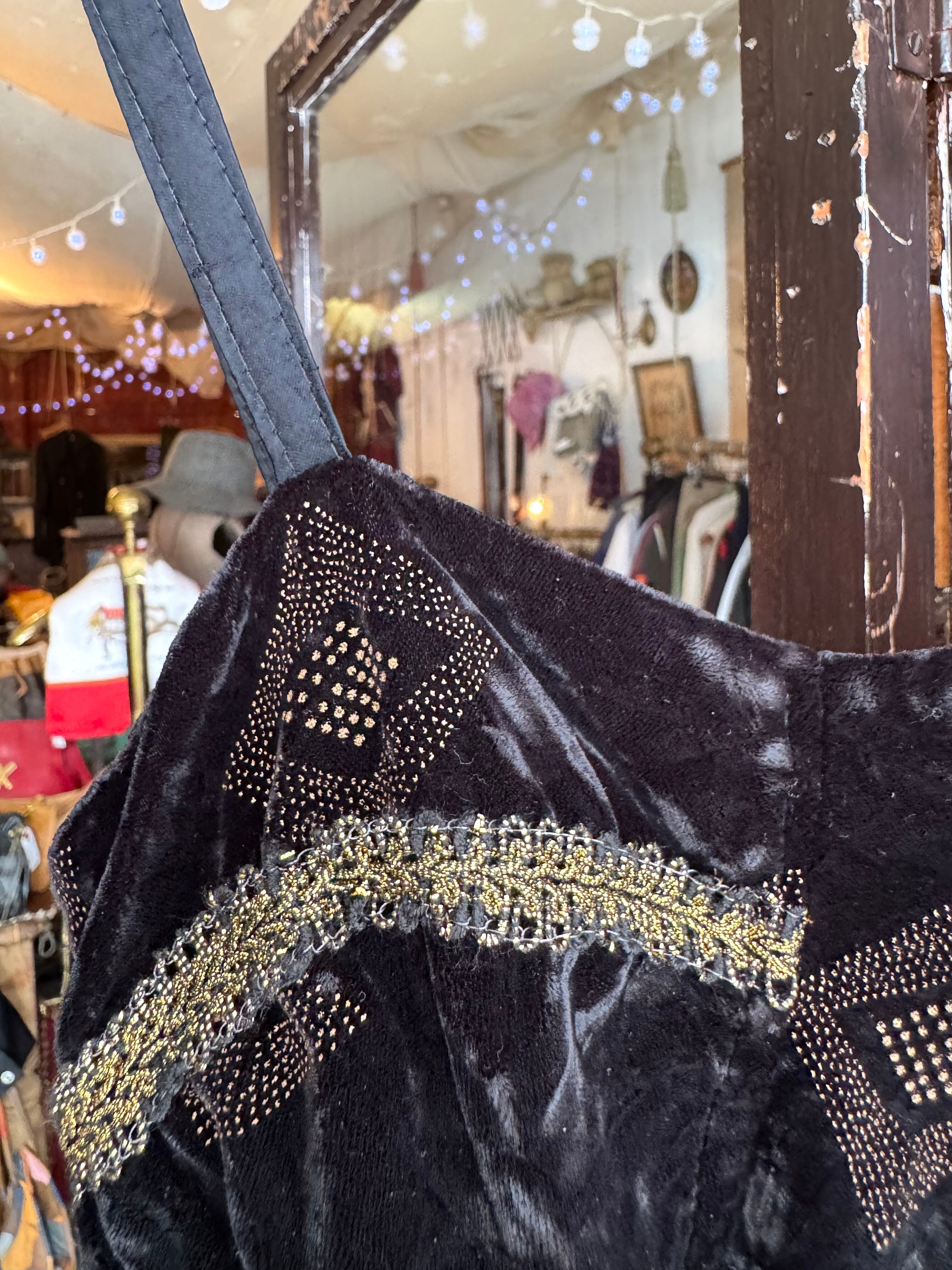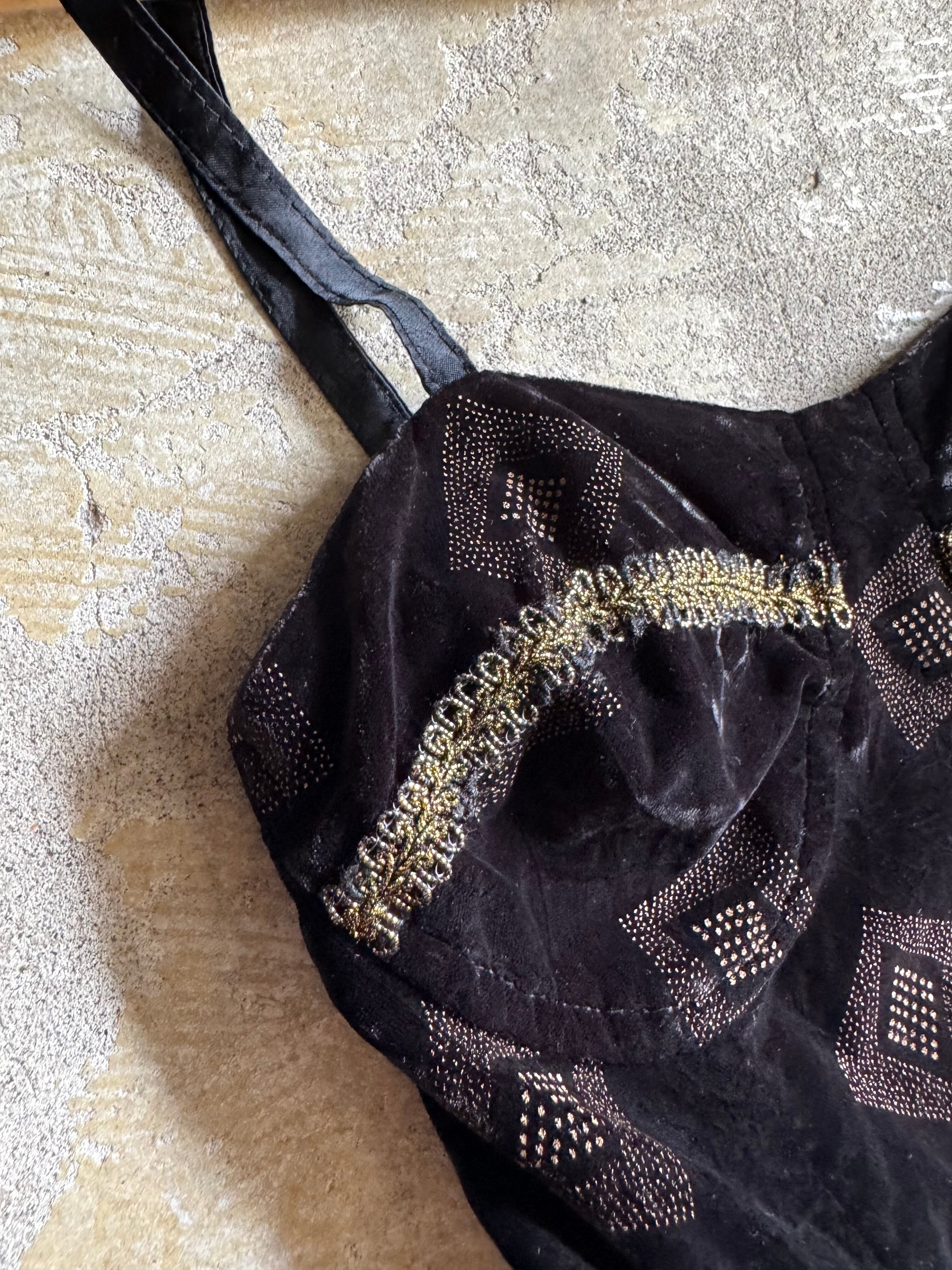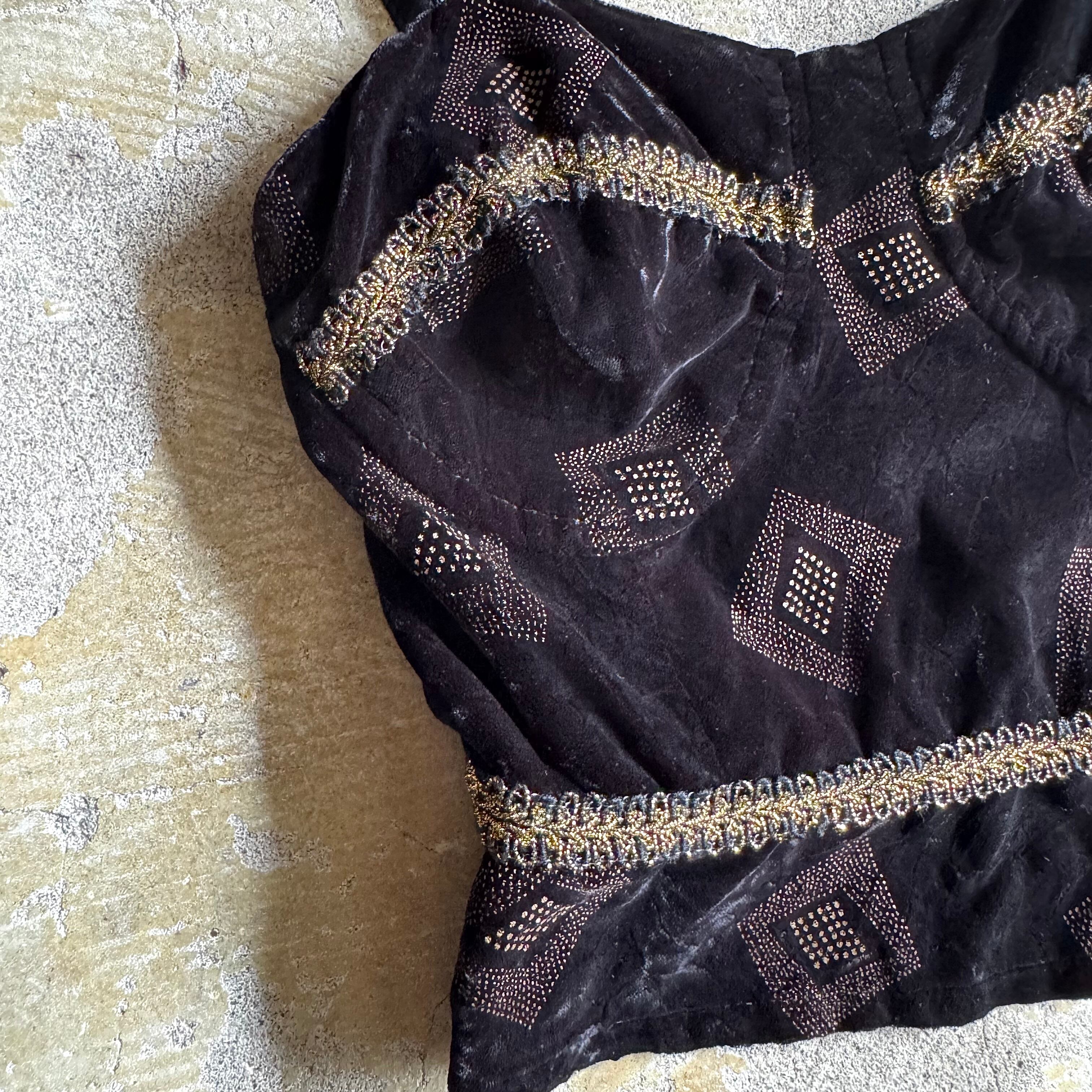 ブラックベロアに施されたゴールドの装飾が素敵なキャミソールトップス。短めな丈がブラウスやTシャツ、ワンピース等様々なアイテムと合わせやすく、きれいめにもカジュアルにも、幅広い雰囲気のコーディネートで活躍してくれそうです。フロント部分が柔らかなベロア素材になります。