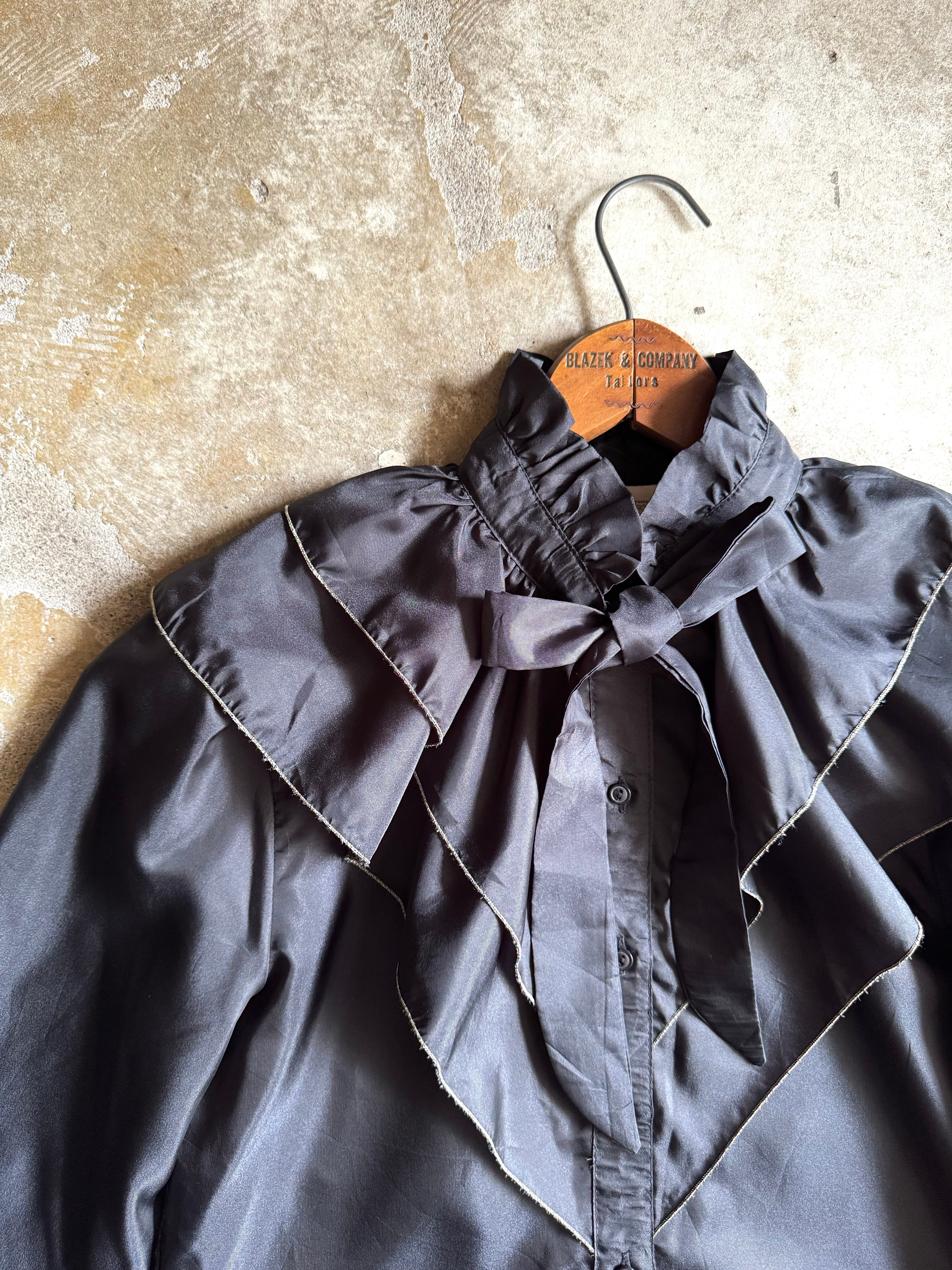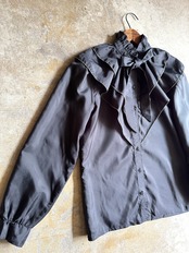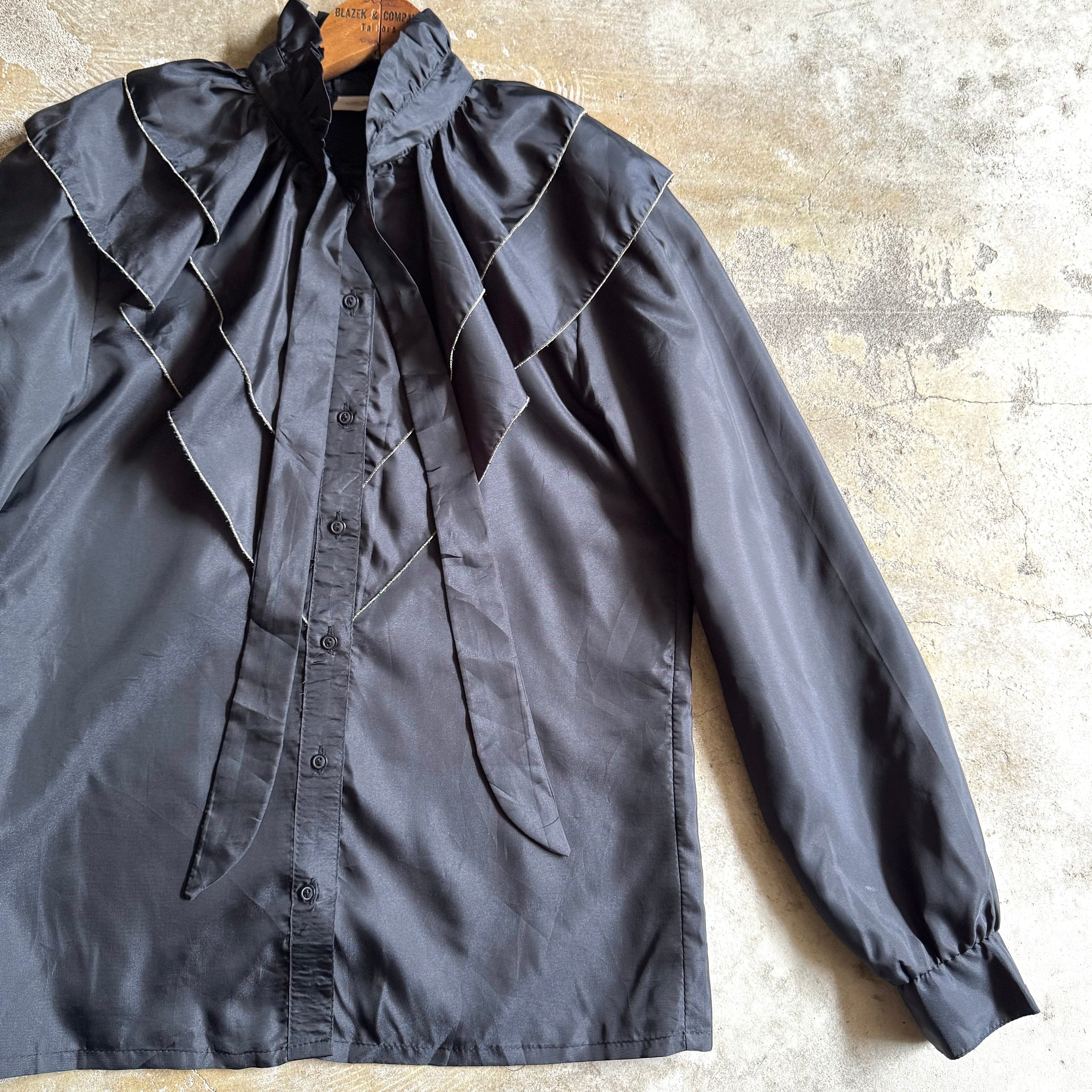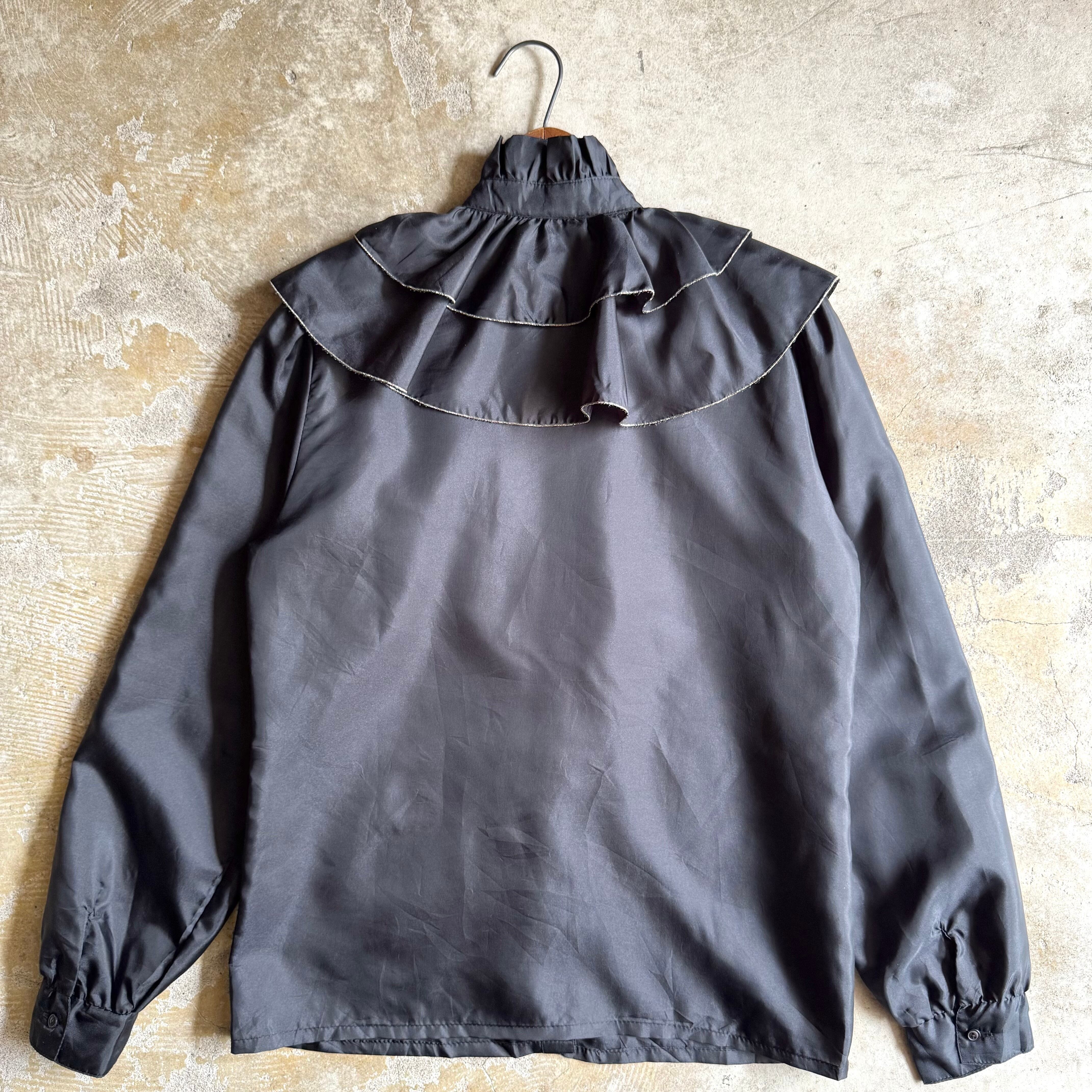 落ち着いたブラックの色合いと、肩にかかるフリルが素敵なブラウス。少し光沢のあるさらりとした素材感です。すっきりとしたスタンドカラーの首元や、フリルにあしらわれたゴールドのさりげないパイピング等、大人っぽいディテールが印象的です。首元のタイはリボン結びにしたり、ボウタイのように下げたりと、結び方次第で雰囲気を変えてお楽しみいただけます。デニム等とカジュアルにコーディネートするのもオススメです。