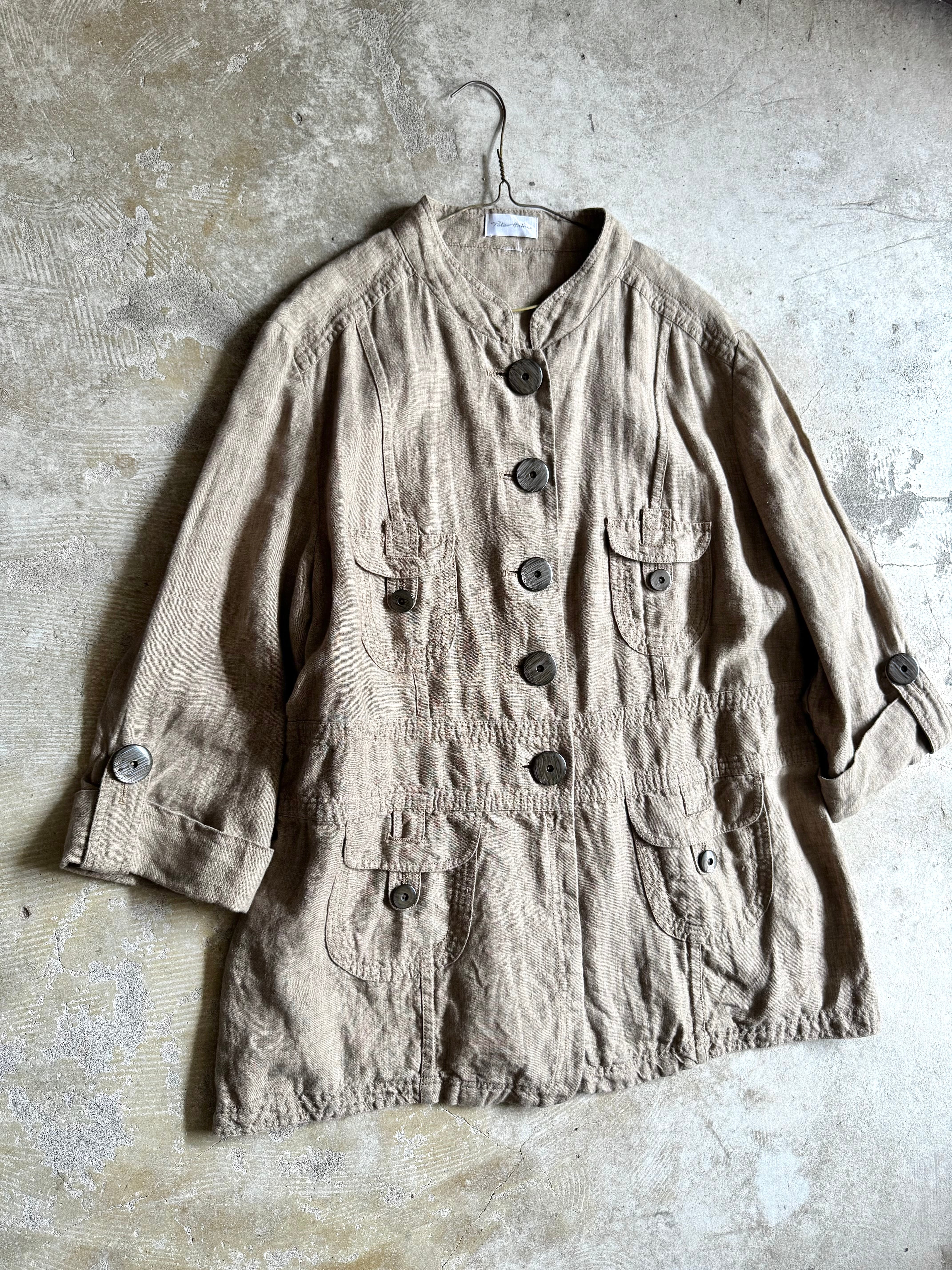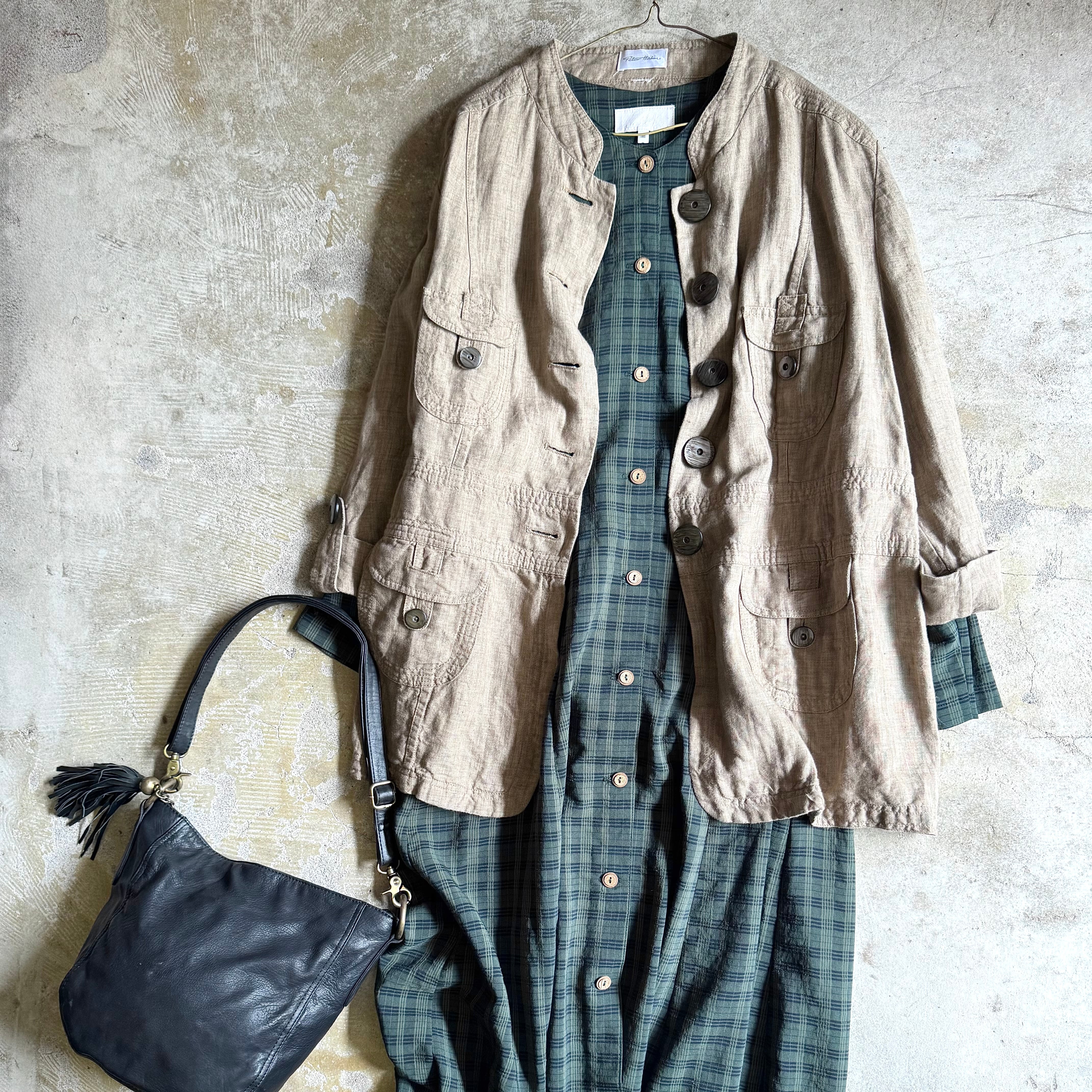 リネン特有の落ち着いたベージュ系の色合いと、スタンドカラーのデザインが大人っぽい雰囲気のジャケット。フロントと袖口の大きめなボタンやポケット等、少し凝ったディテールが印象的です。カチッとしすぎない、ゆったりとしたシルエット。様々なアイテムと相性が良く、お好みのコーディネートでお楽しみいただけます。少し手首が出る袖丈もふんわりと軽やか。肌触りの良いさらりとしたリネン素材です。