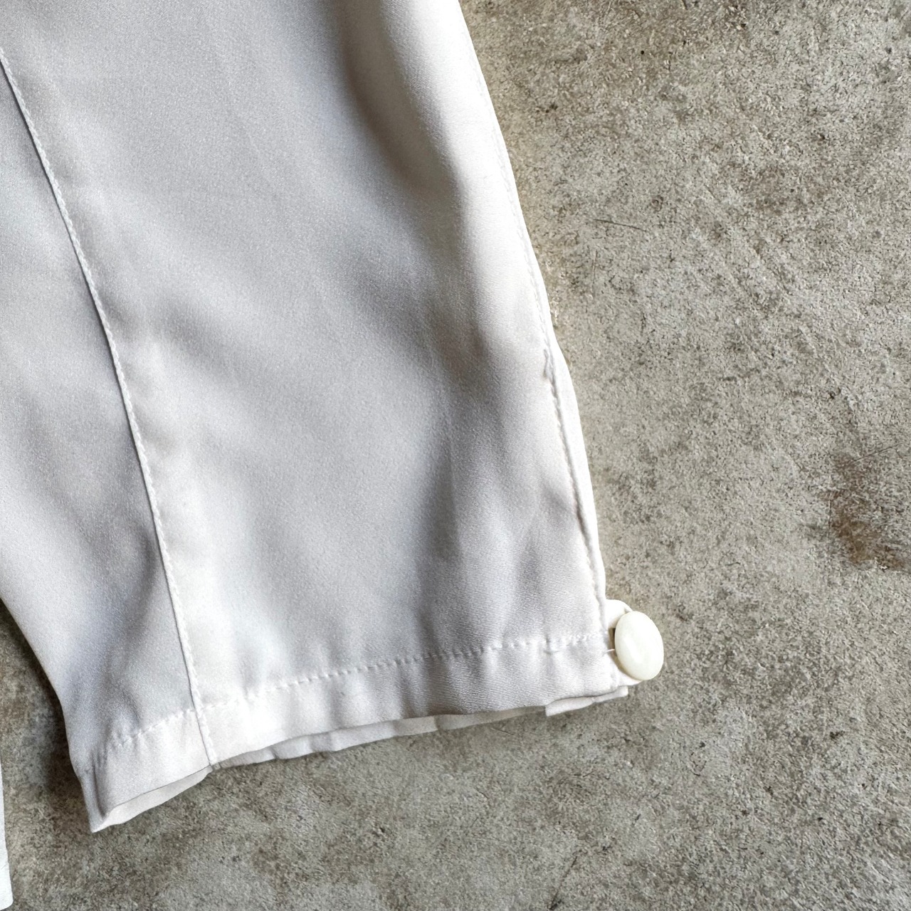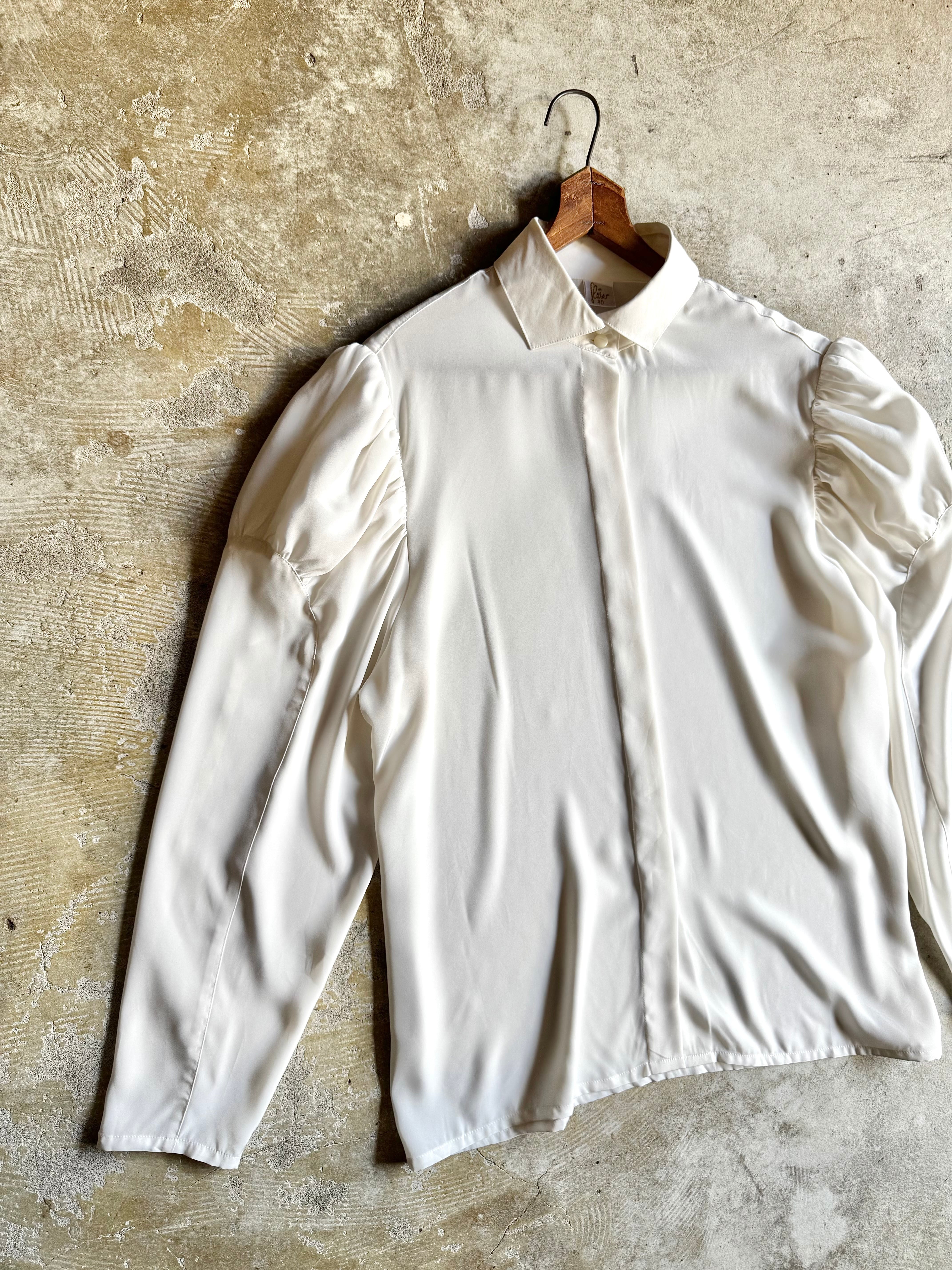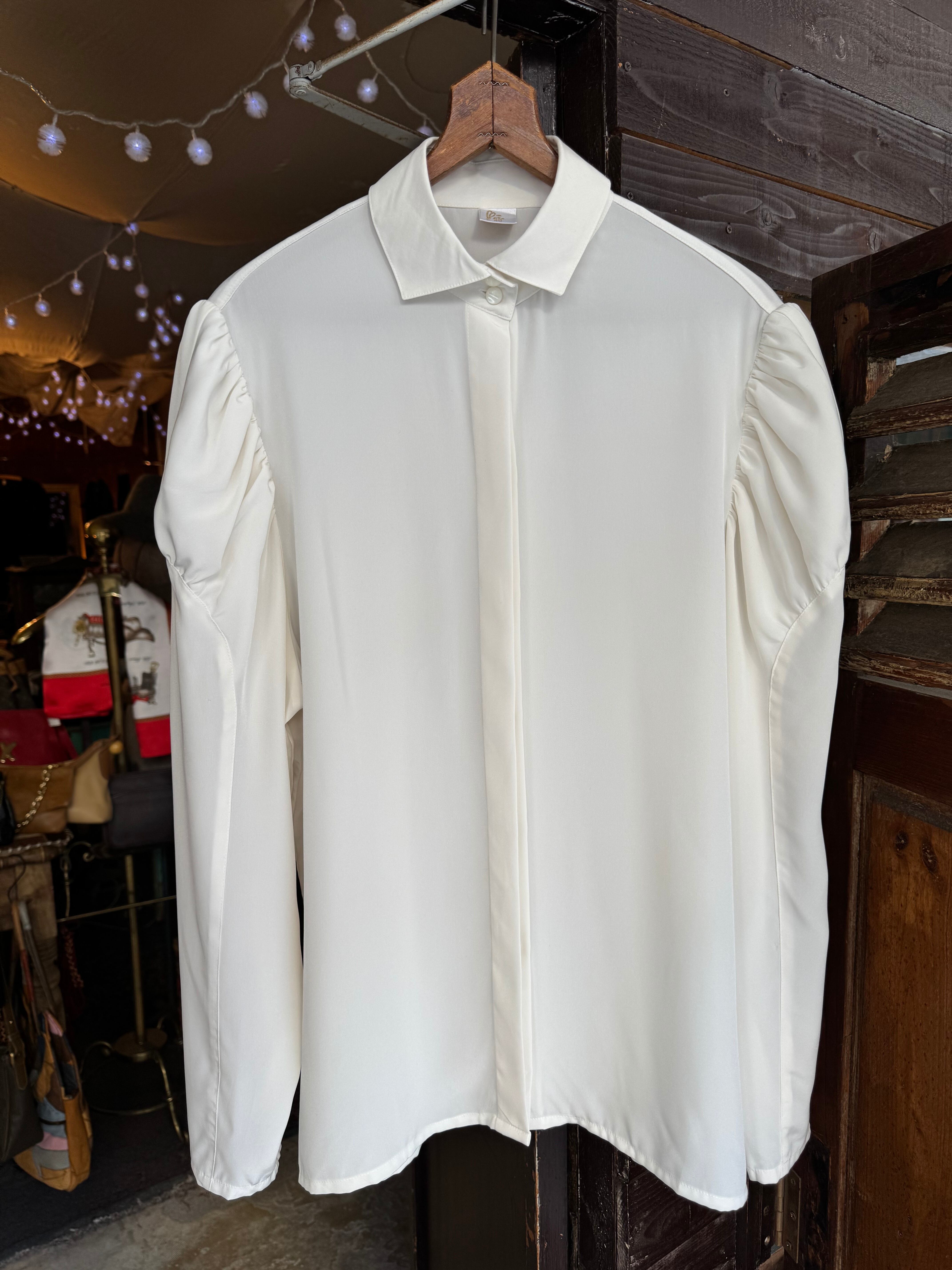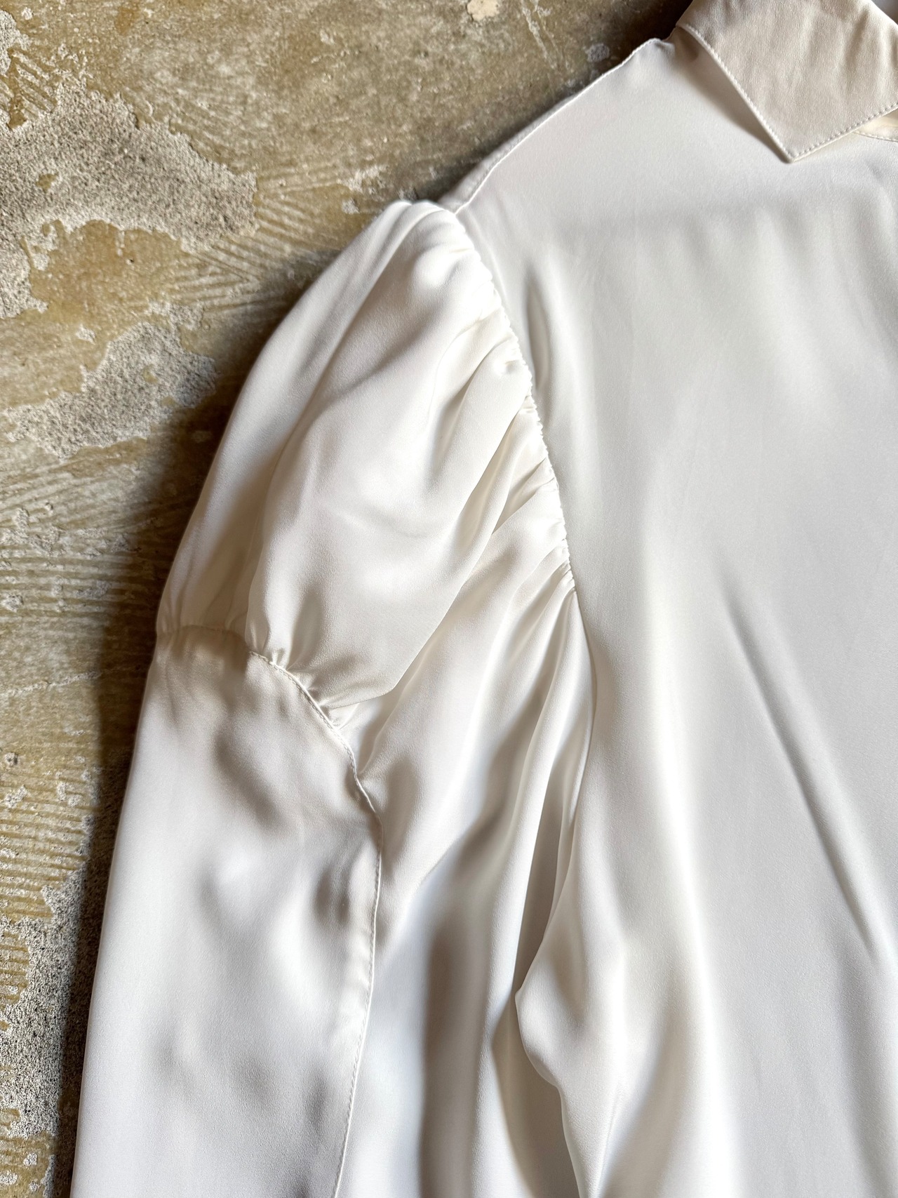 ほぼホワイトに近い、優しいアイボリー系の色合いが素敵なブラウス。肩の程良いパフスリーブが、シンプルなデザインのアクセントになっています。とろみのある、しなやかな素材感が大人っぽく、きれいめにはもちろん、デニム等とカジュアルにコーディネートするのもオススメです。