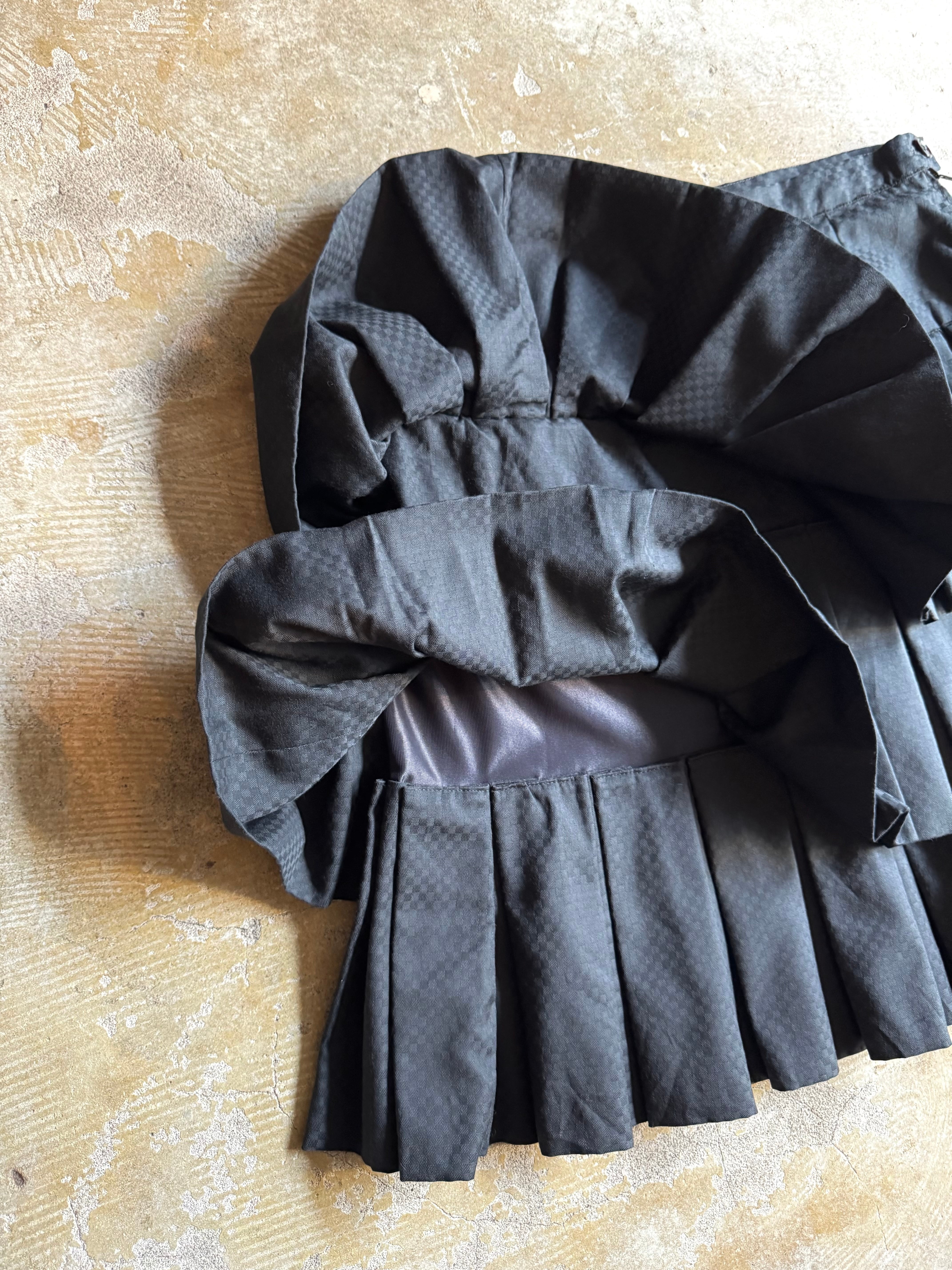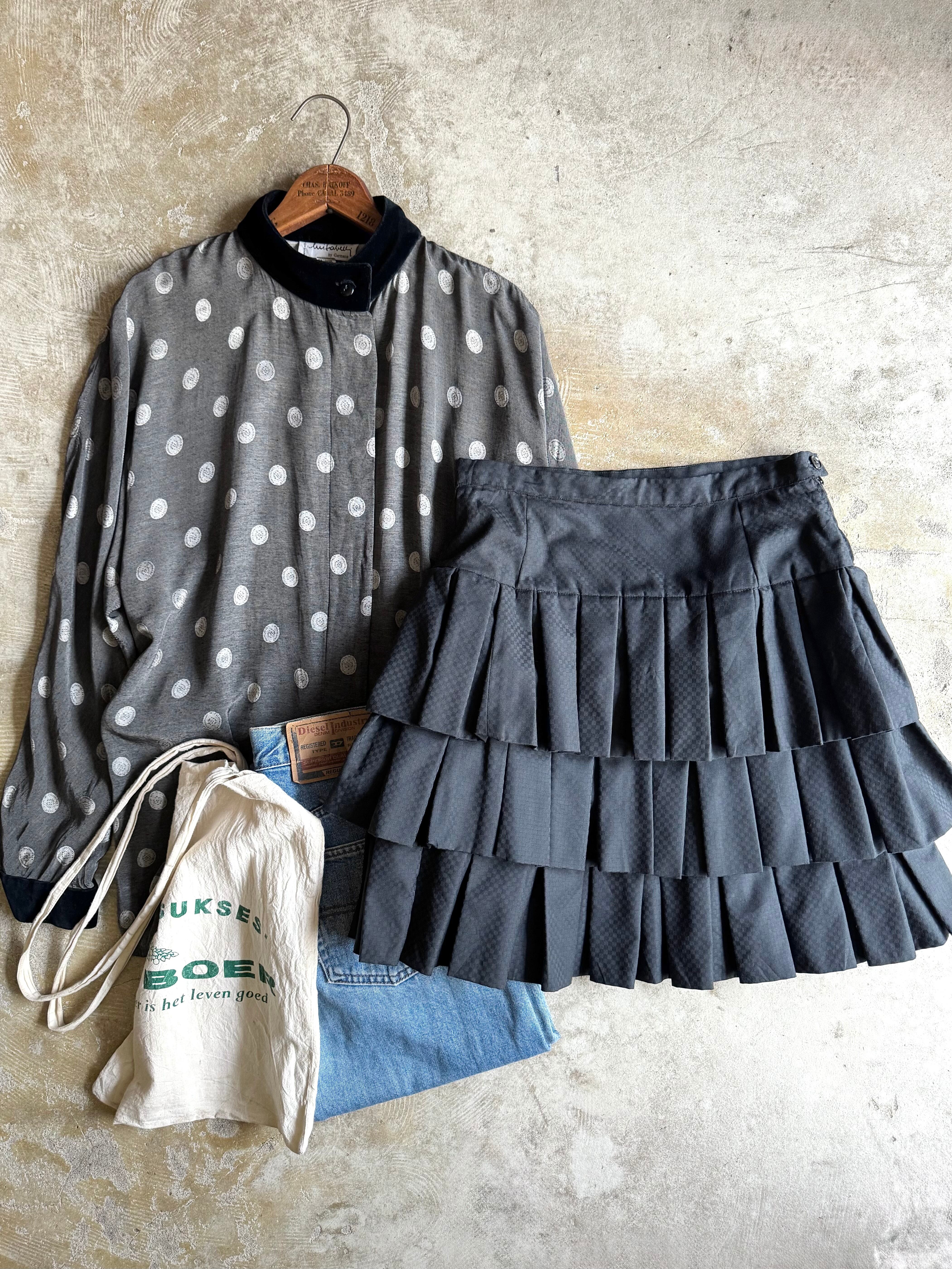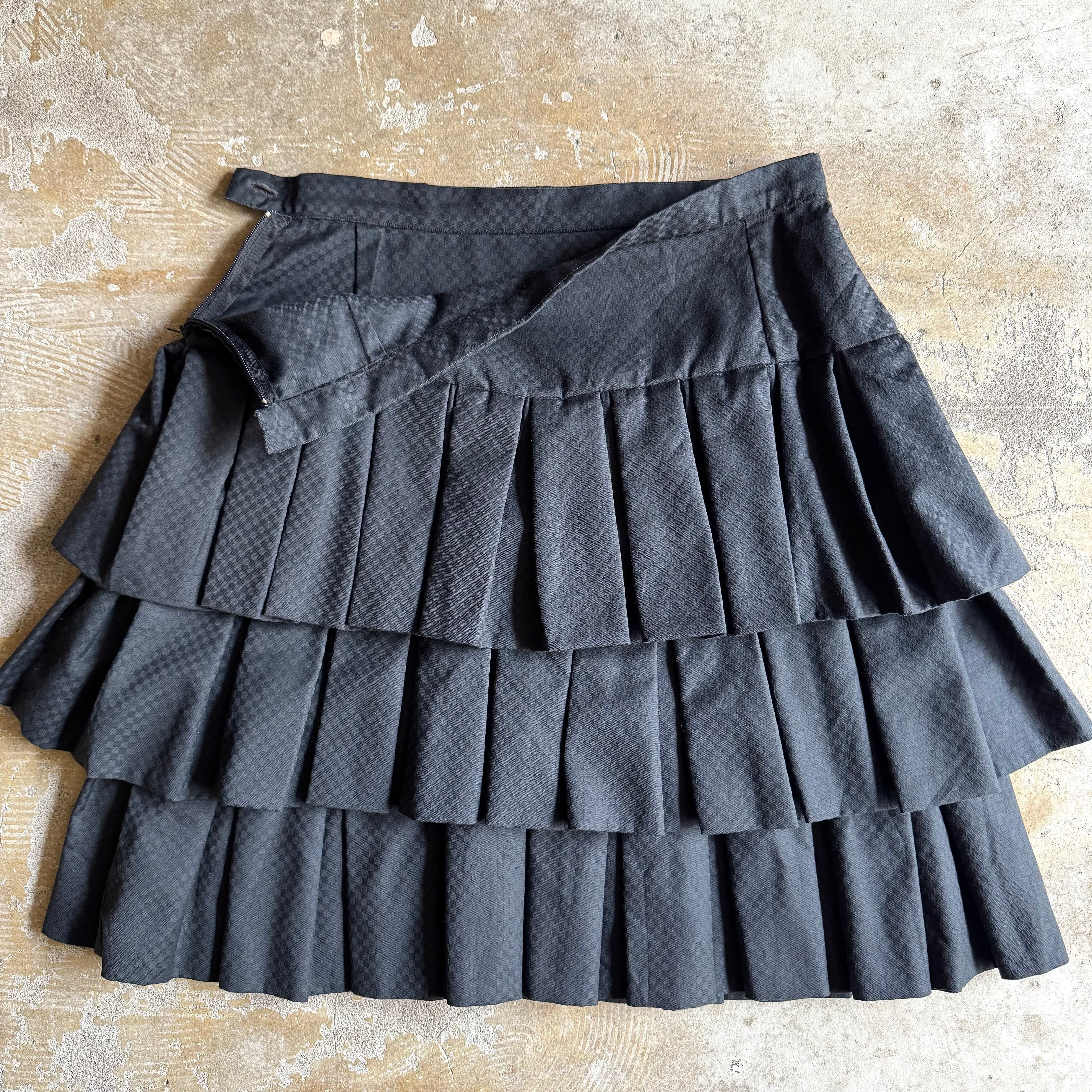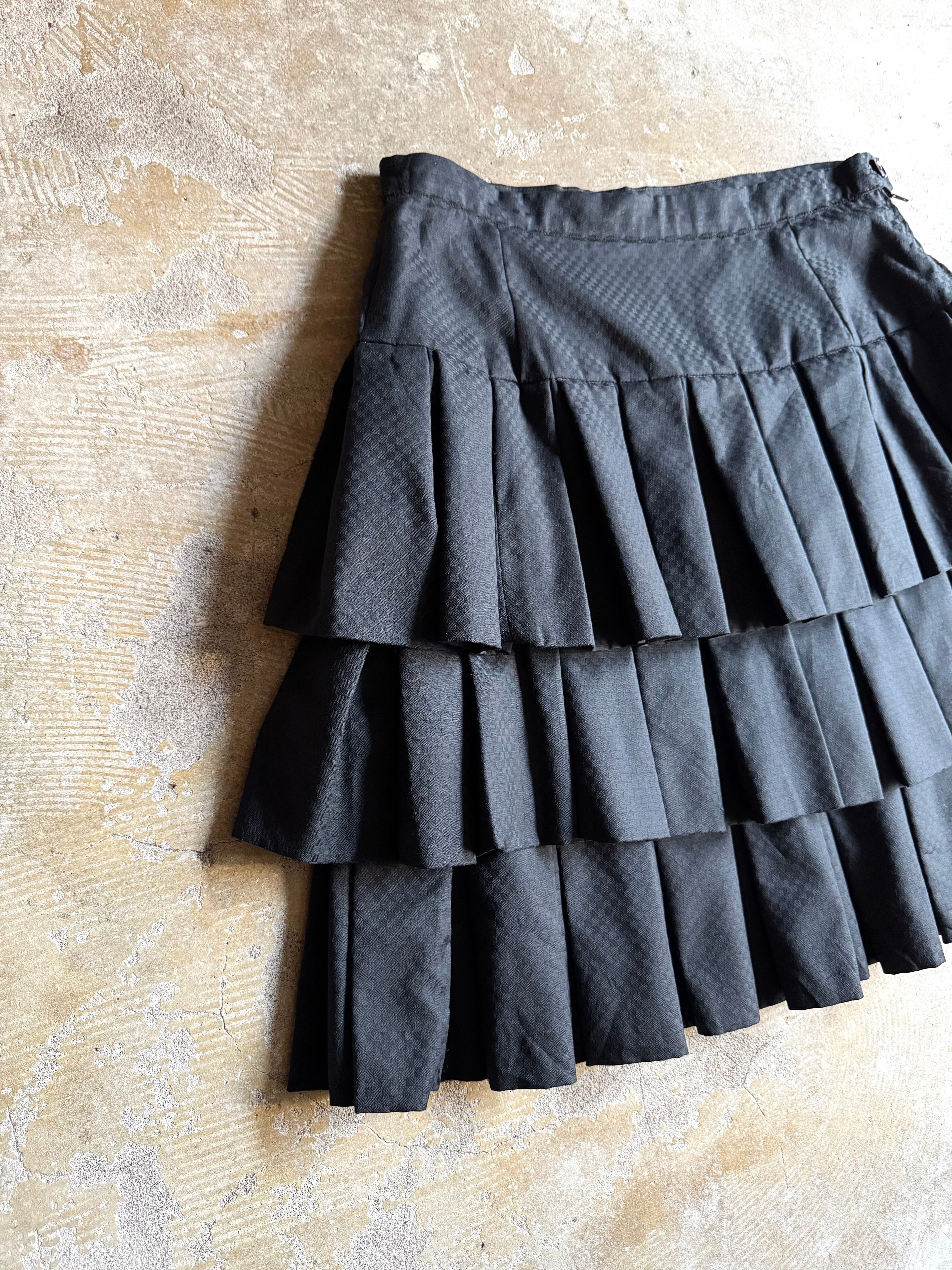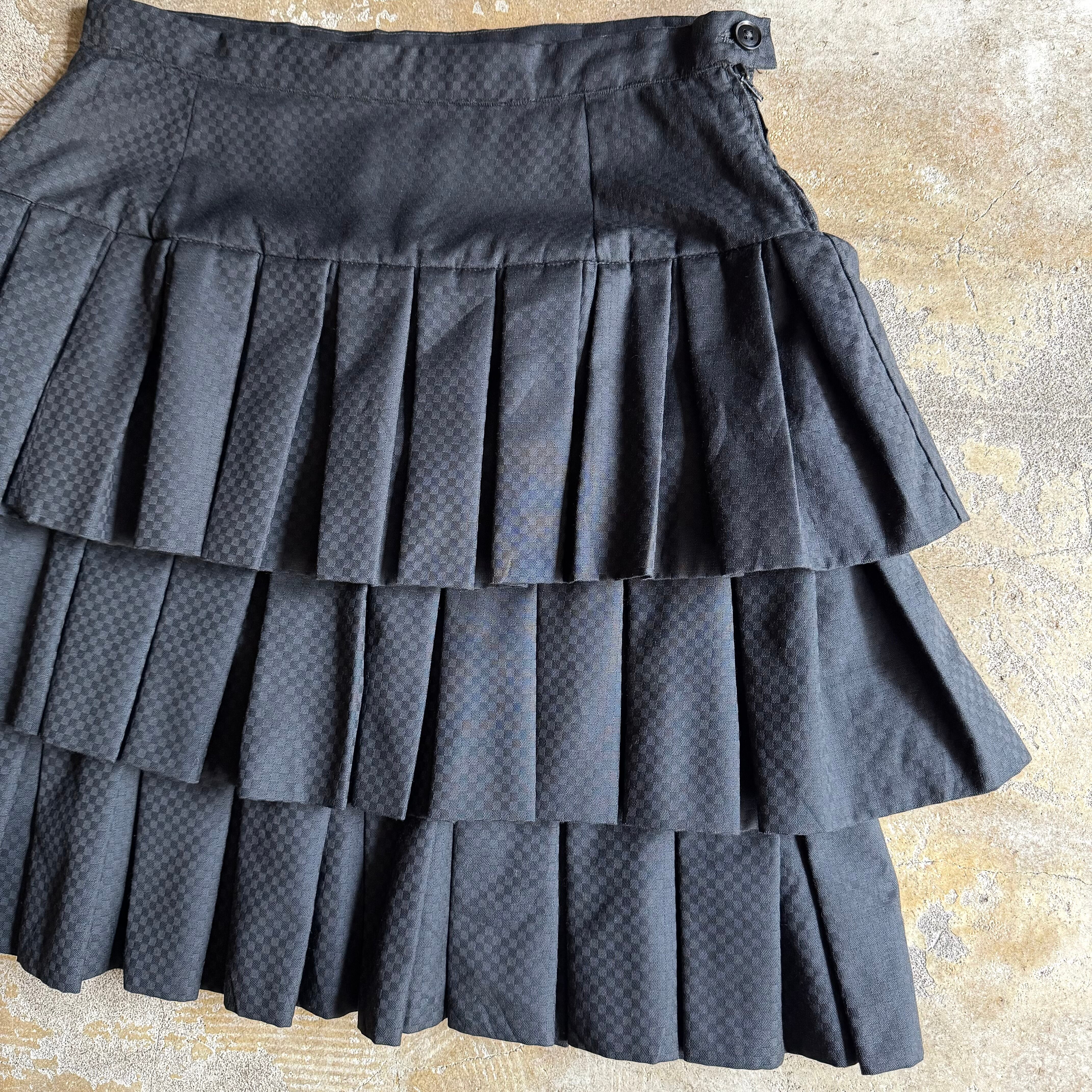 たっぷり生地を使ったボリュームのあるボックスプリーツを、更に重ね合わせたティアードスカート。ずっしりとした重みのあるシルエットは、意外にもふんわりしすぎず大人っぽい雰囲気です。単体ではもちろん、パンツとのレイヤードでお楽しみいただくのもオススメです。ブラックよりもチャコールに近い色合いで、細かなブロックチェックの地模様があります。裏地は付いていませんが透け感ありません。