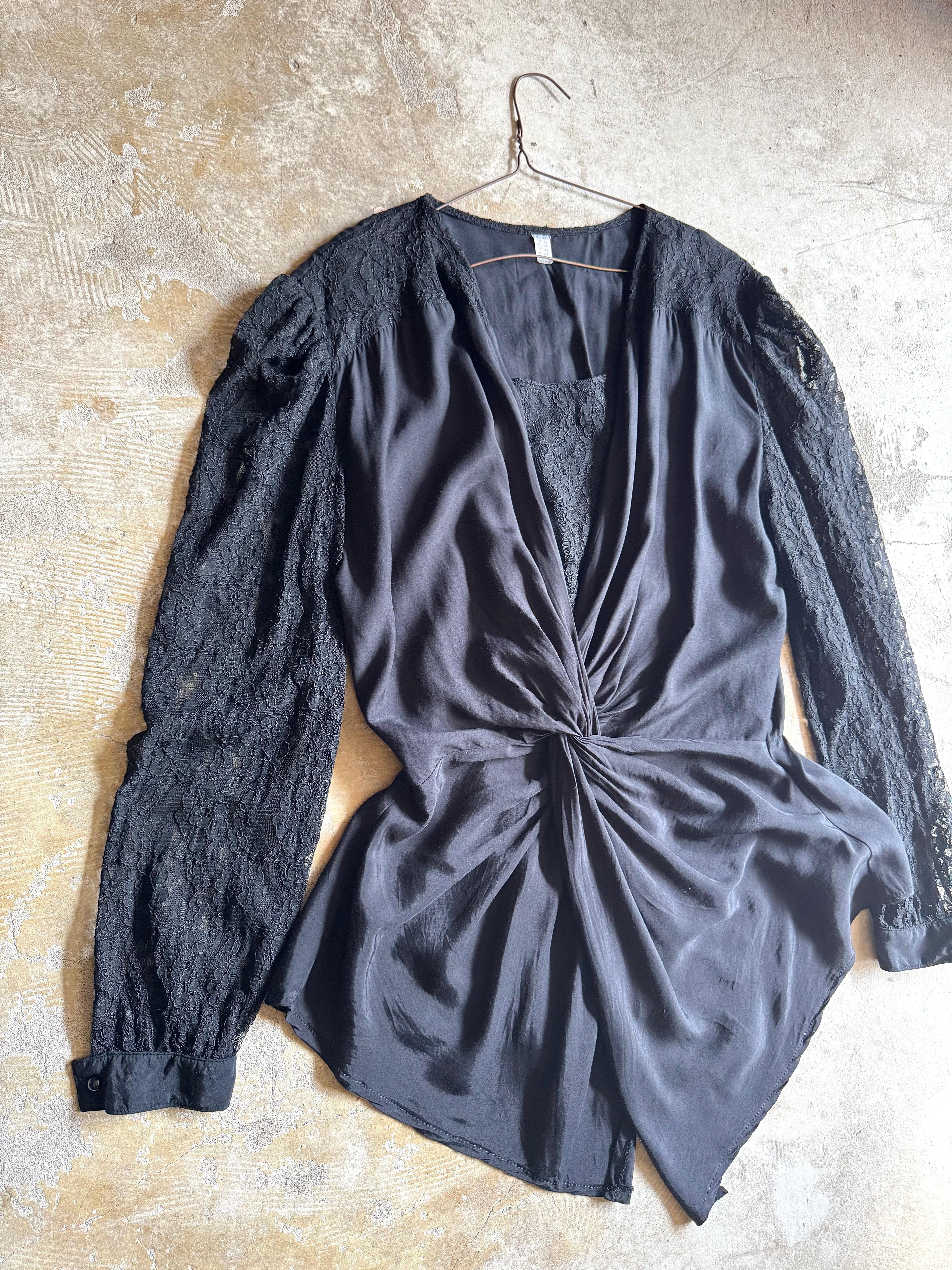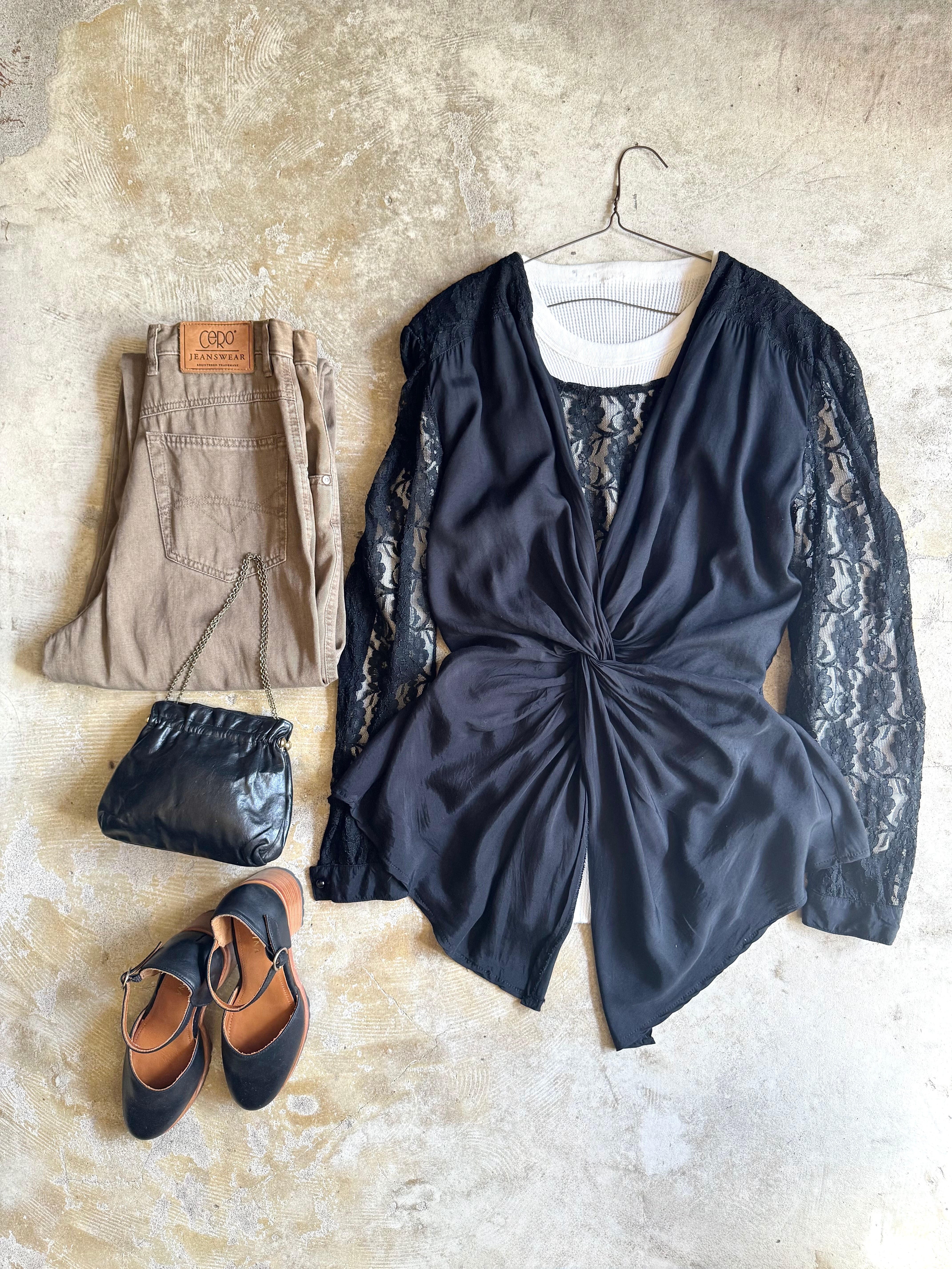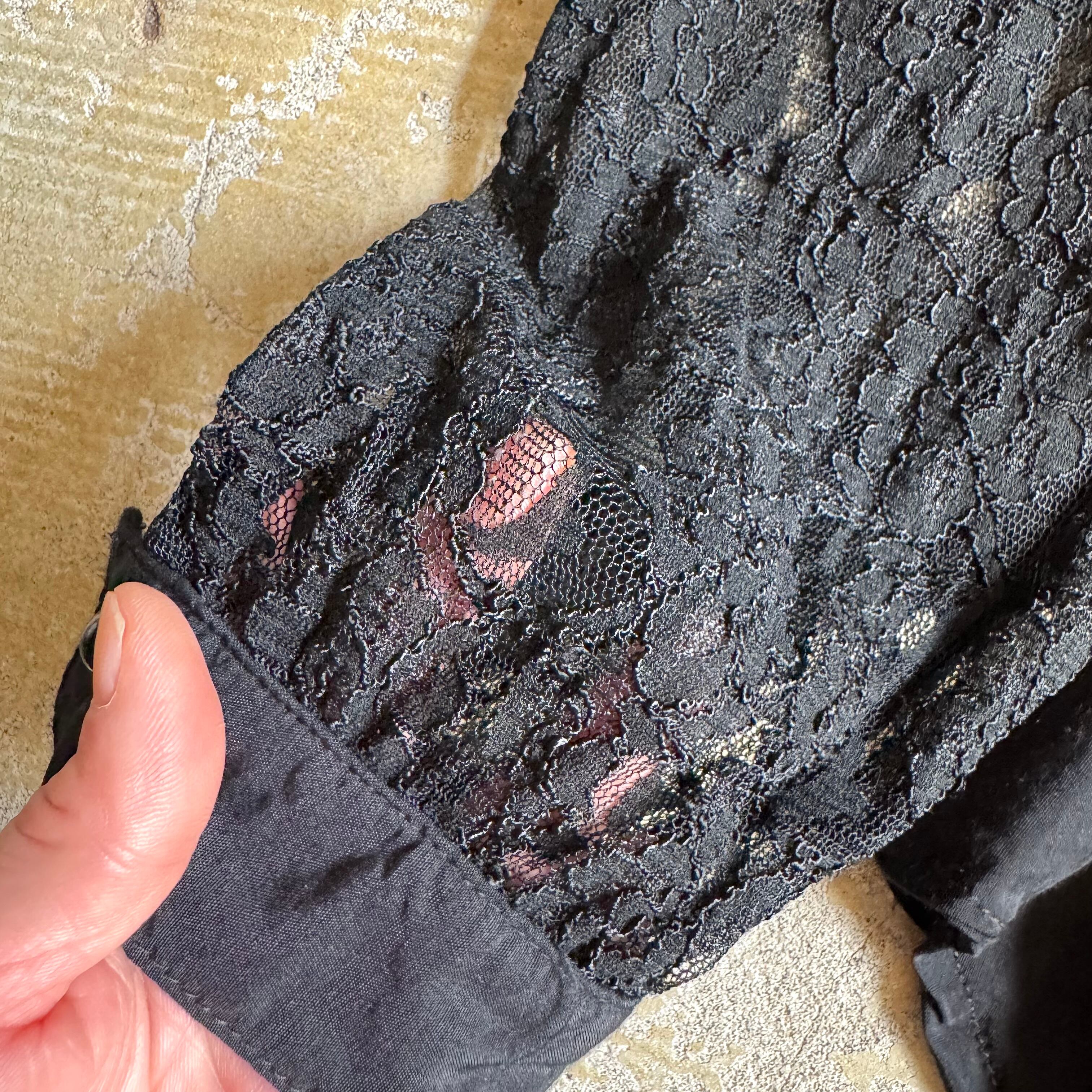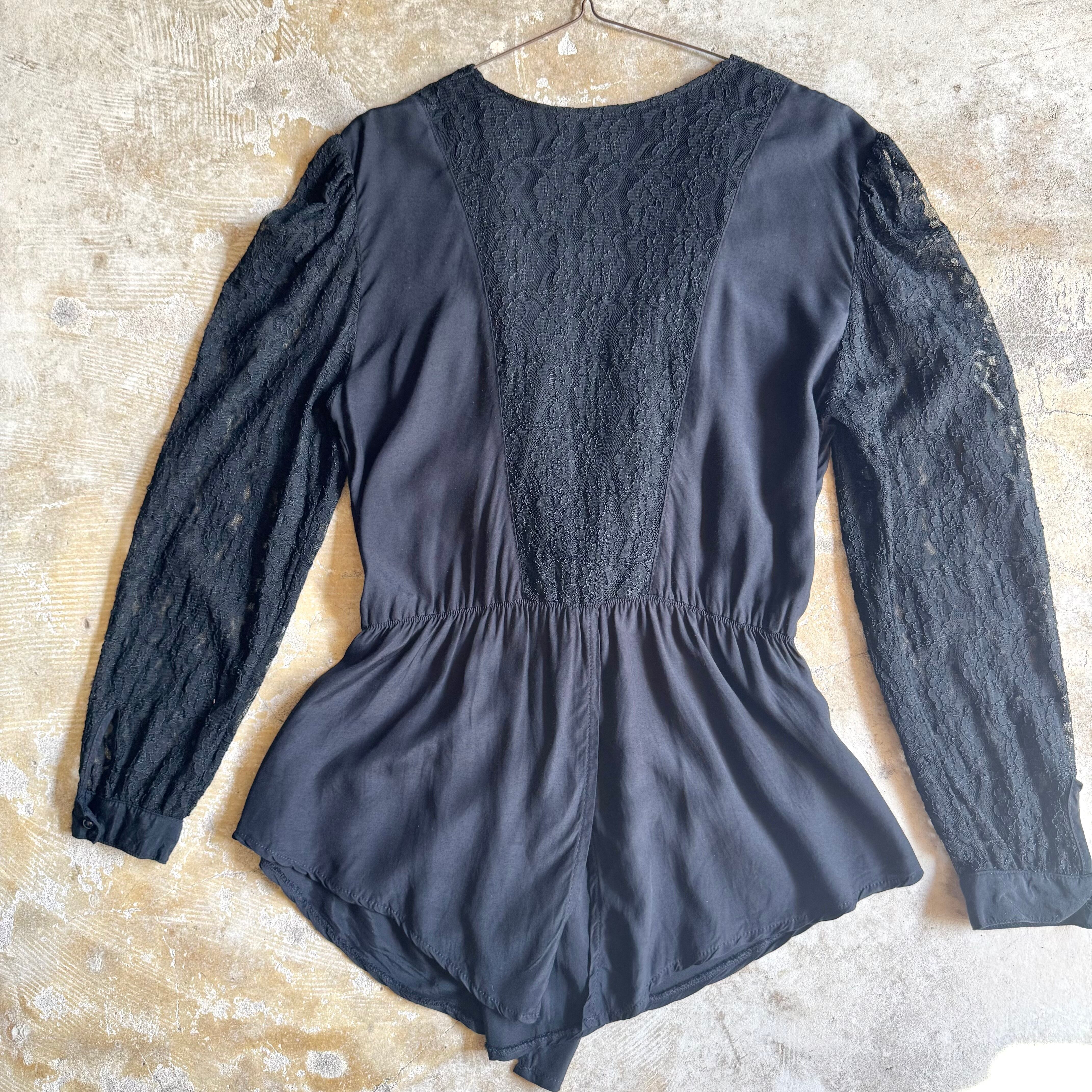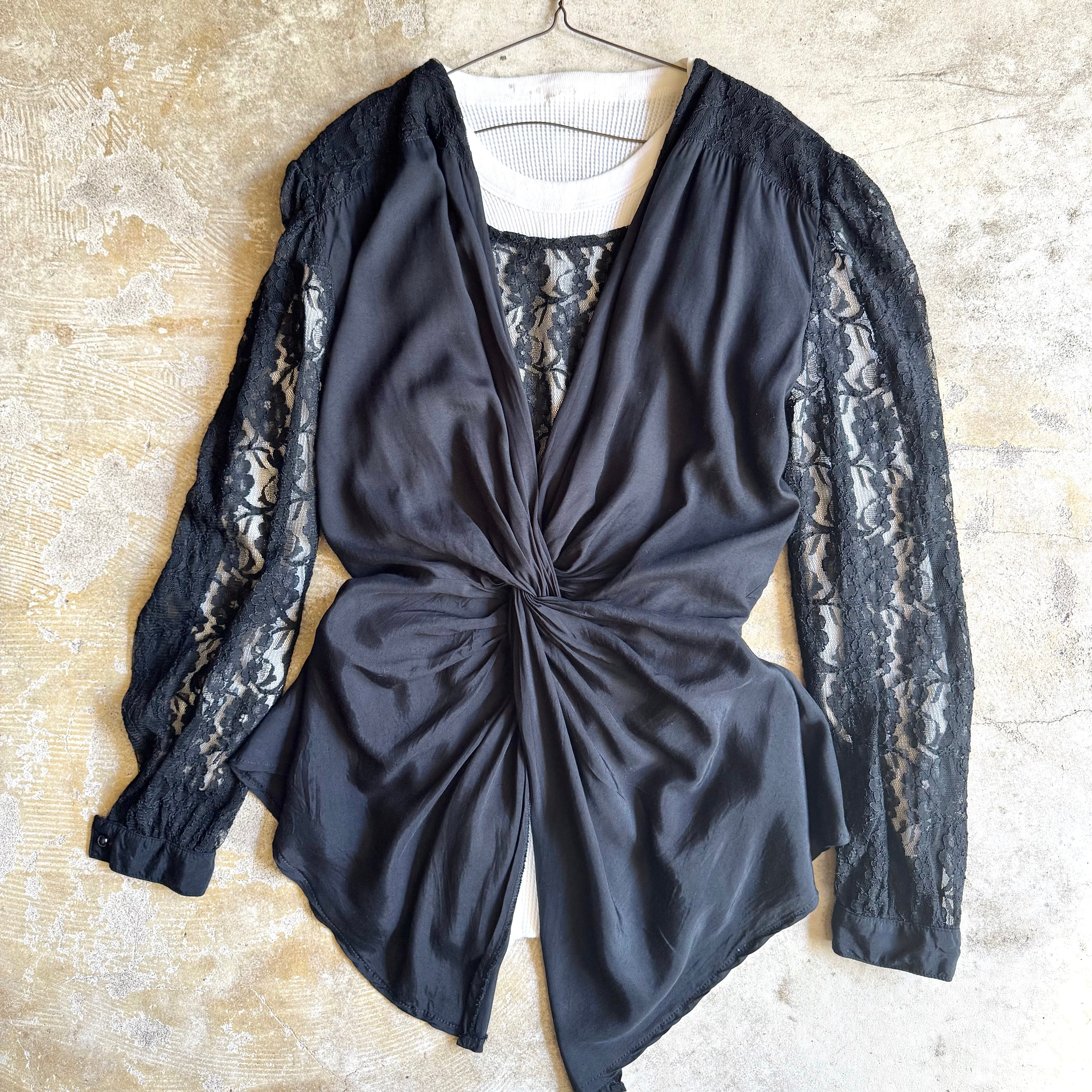 落ち着いたブラックの色合いと、カシュクールのデザイン、胸元と袖のレースの透け感が素敵なプルオーバートップス。ウエストで軽くブラウジングされ、ペプラムのようなシルエットになります。レース部分の透け感を活かしたレイヤードで、カジュアルにもきれいめにも様々な雰囲気でお楽しみいただけます。さらりとしたしなやかな素材感です。背中のレース部分には透け感はありません。