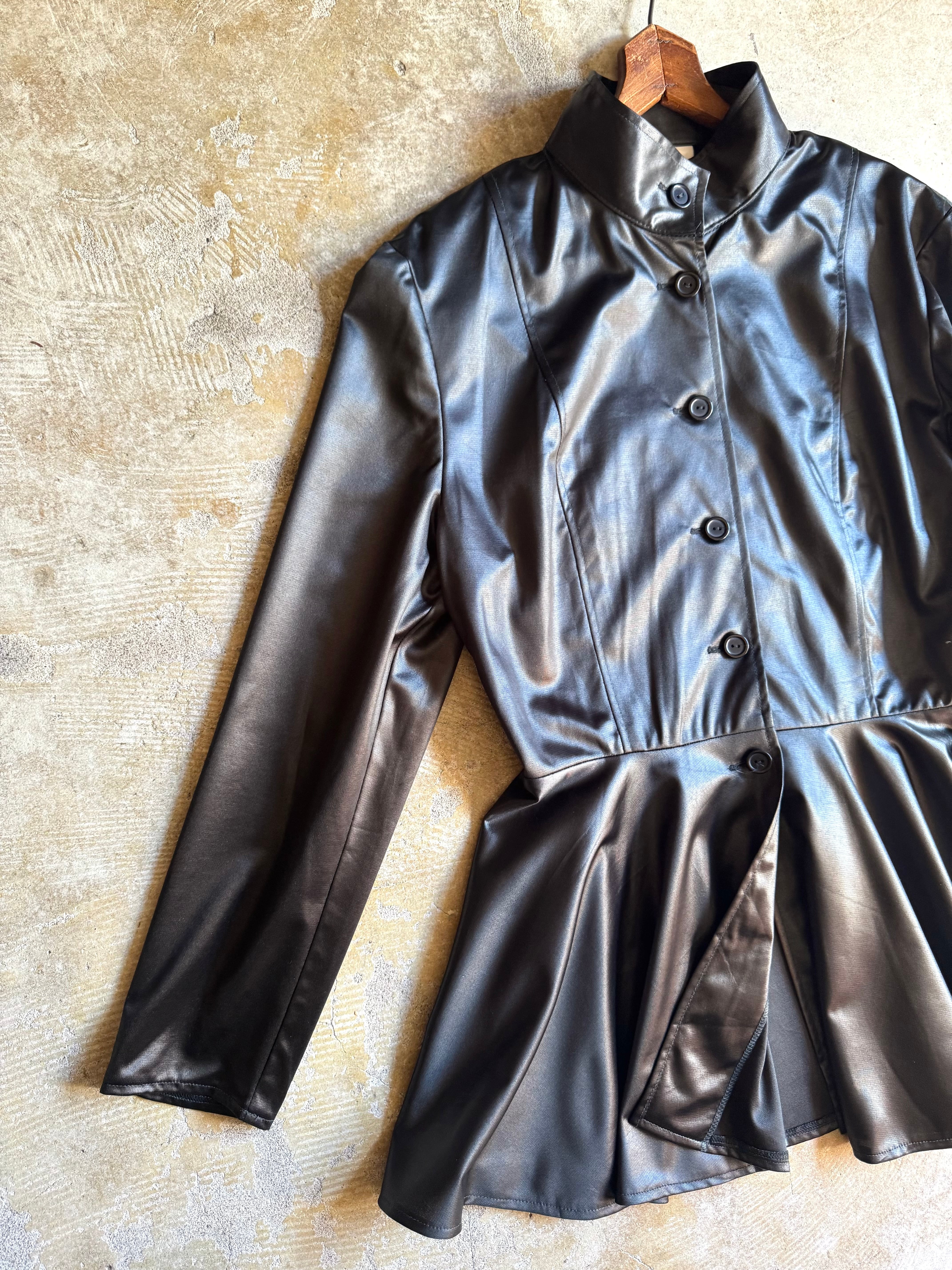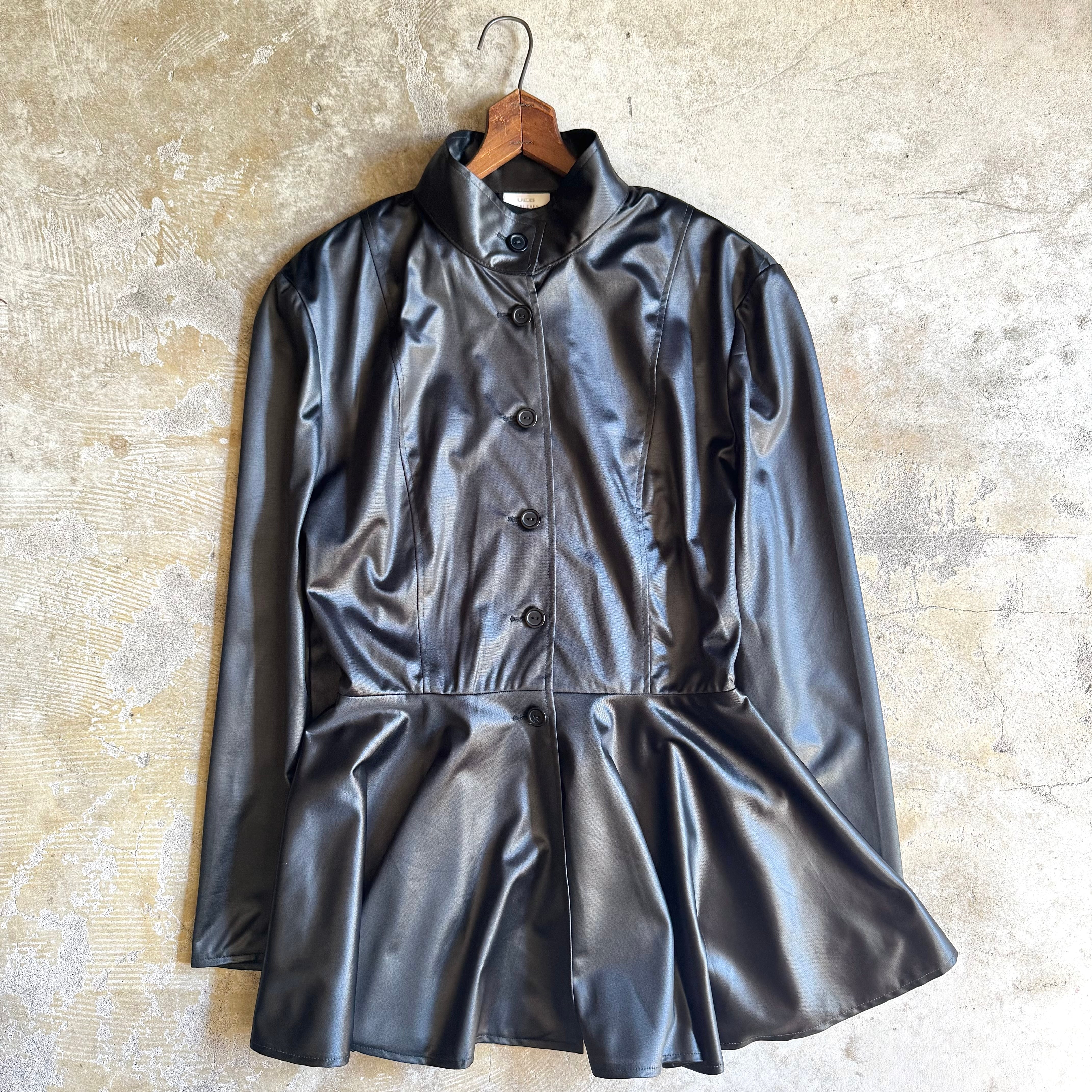 光沢のあるシックなブラックの色合いと、すっきりとしたスタンドカラーが素敵なジャケット。ウエストで切り替えとなる、しなやかなペプラムのデザインが印象的です。シャツ感覚で軽く使え、Tシャツ等にふわっと羽織るカジュアルなスタイリングもオススメです。表示が欠損していますが、ポリエステル素材と思われます。