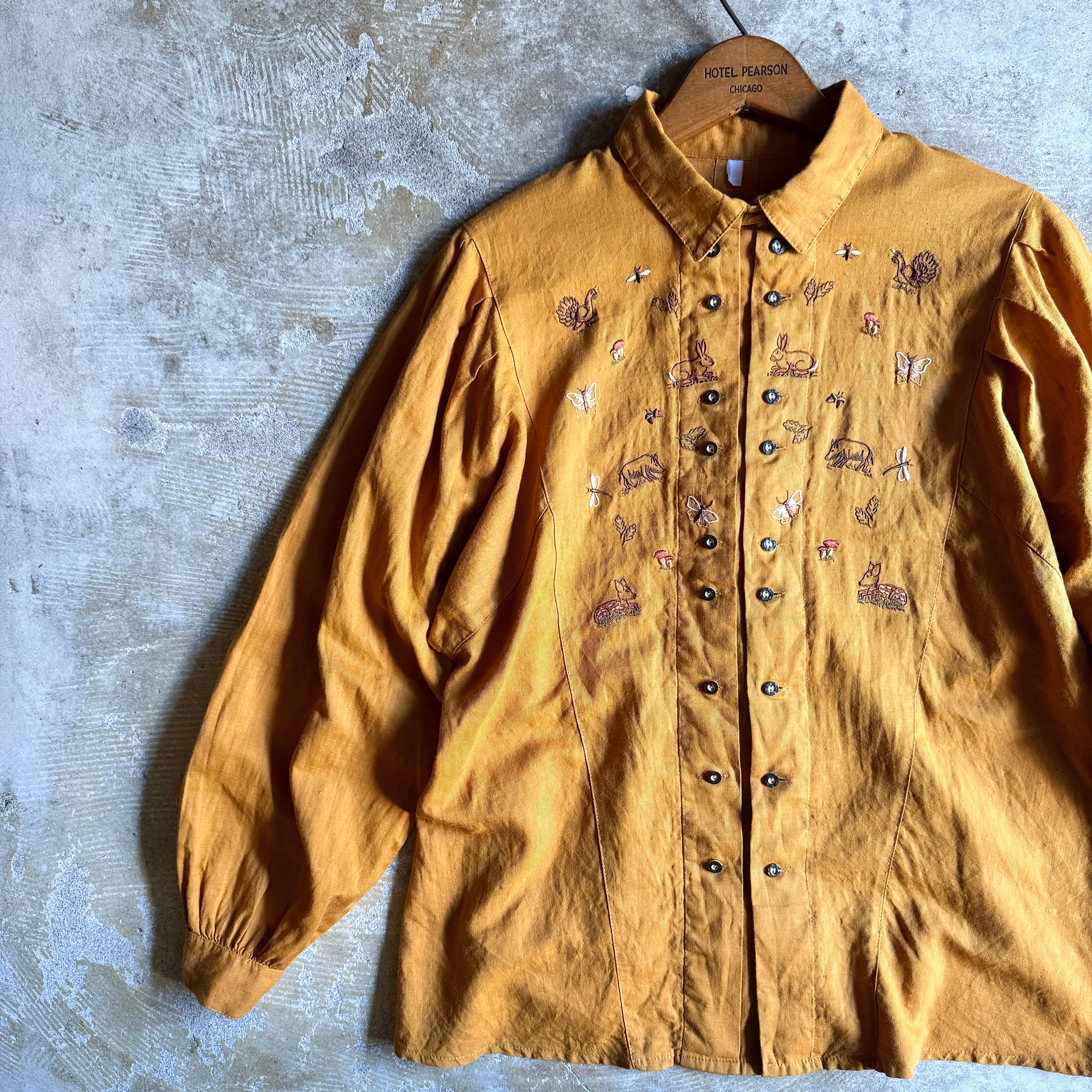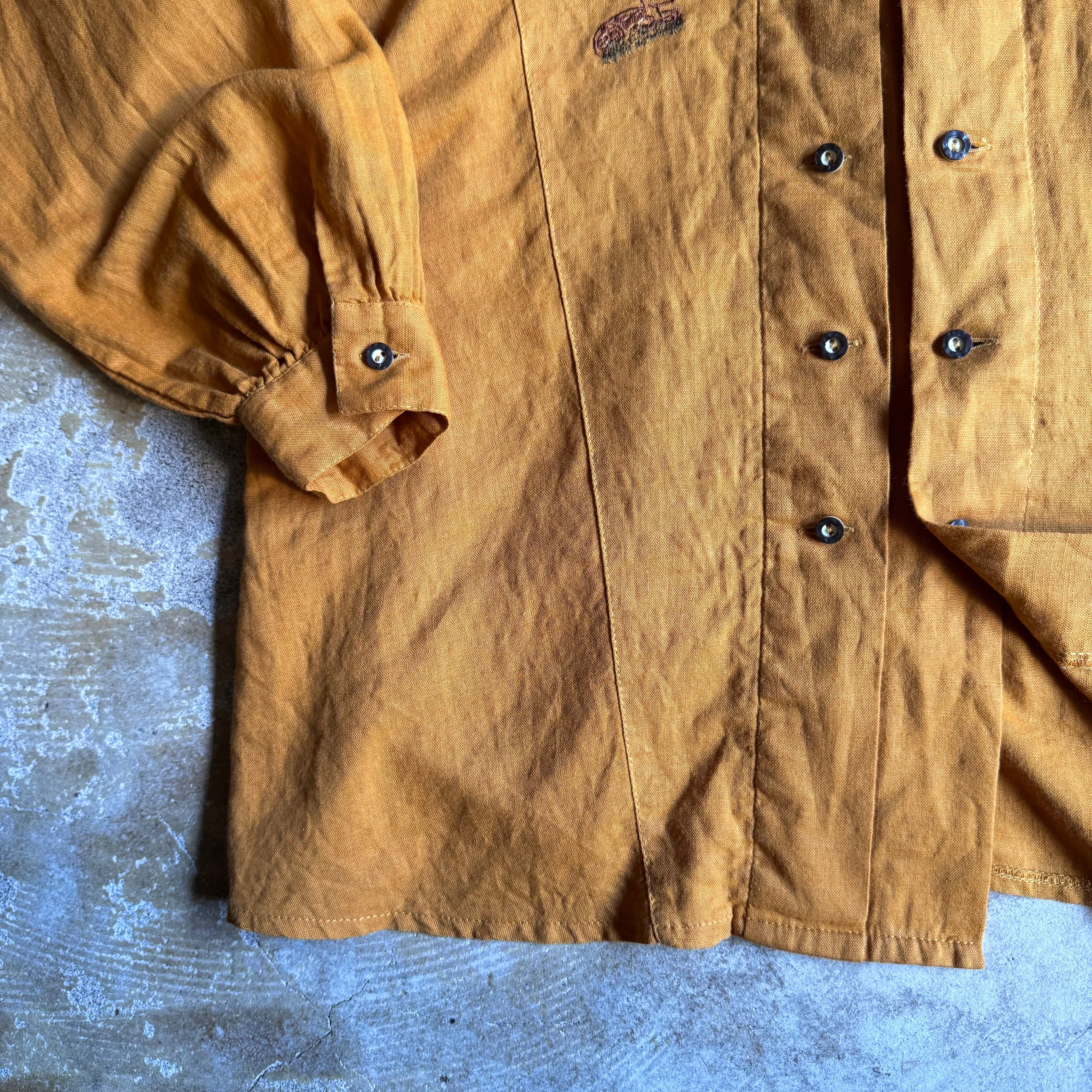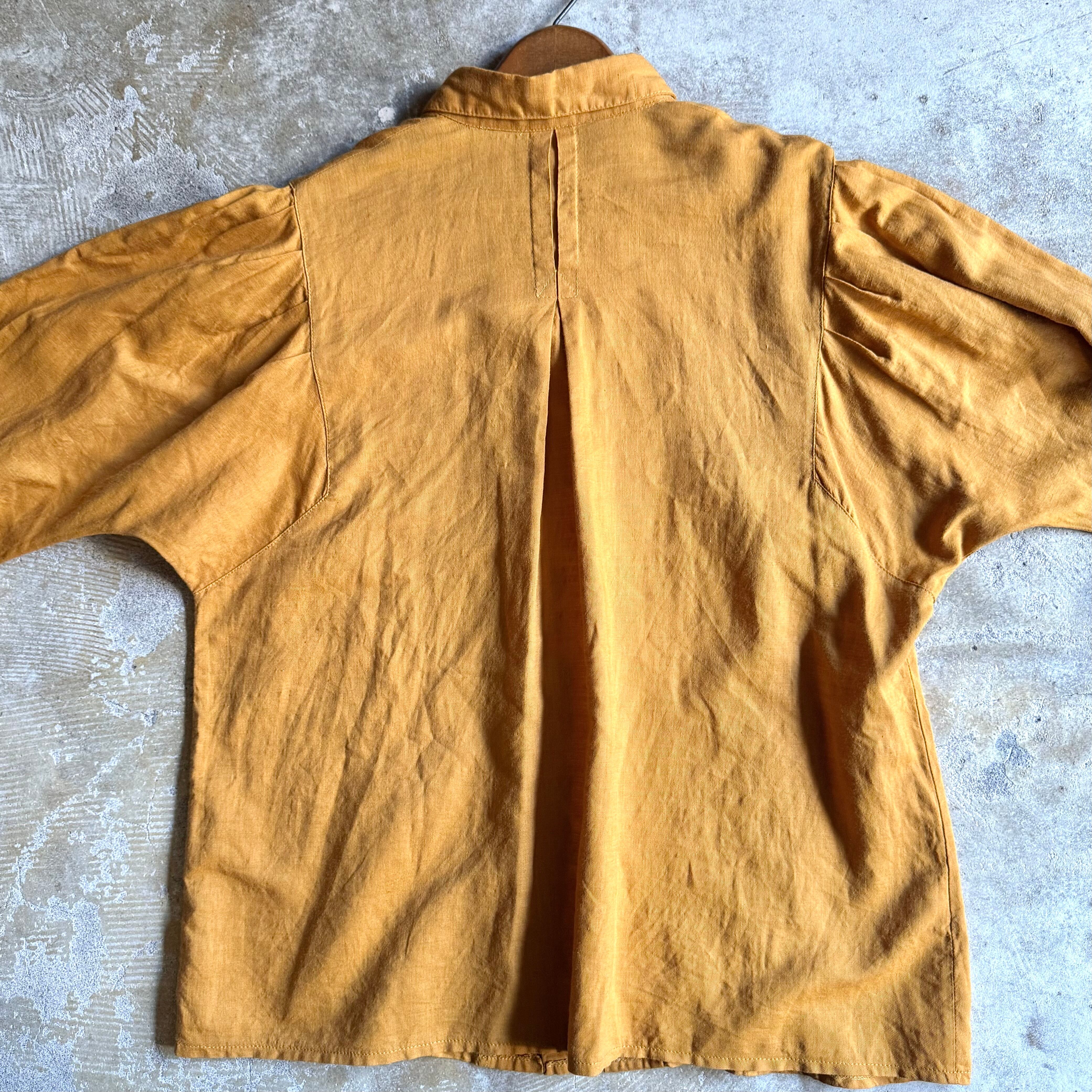 マスタード系の色合いが落ち着いた雰囲気のブラウス。ゆったりとした程良いボリュームのパフスリーブや、フロントのボタンのデザイン、そして胸元の刺繍等、チロルらしい凝ったディテールを持ちつつ、様々なアイテムとさらっと合わせやすいシンプルなシルエットが魅力的な1着です。肌触りの良い柔らかくさらりとした、しなやかな素材感です。