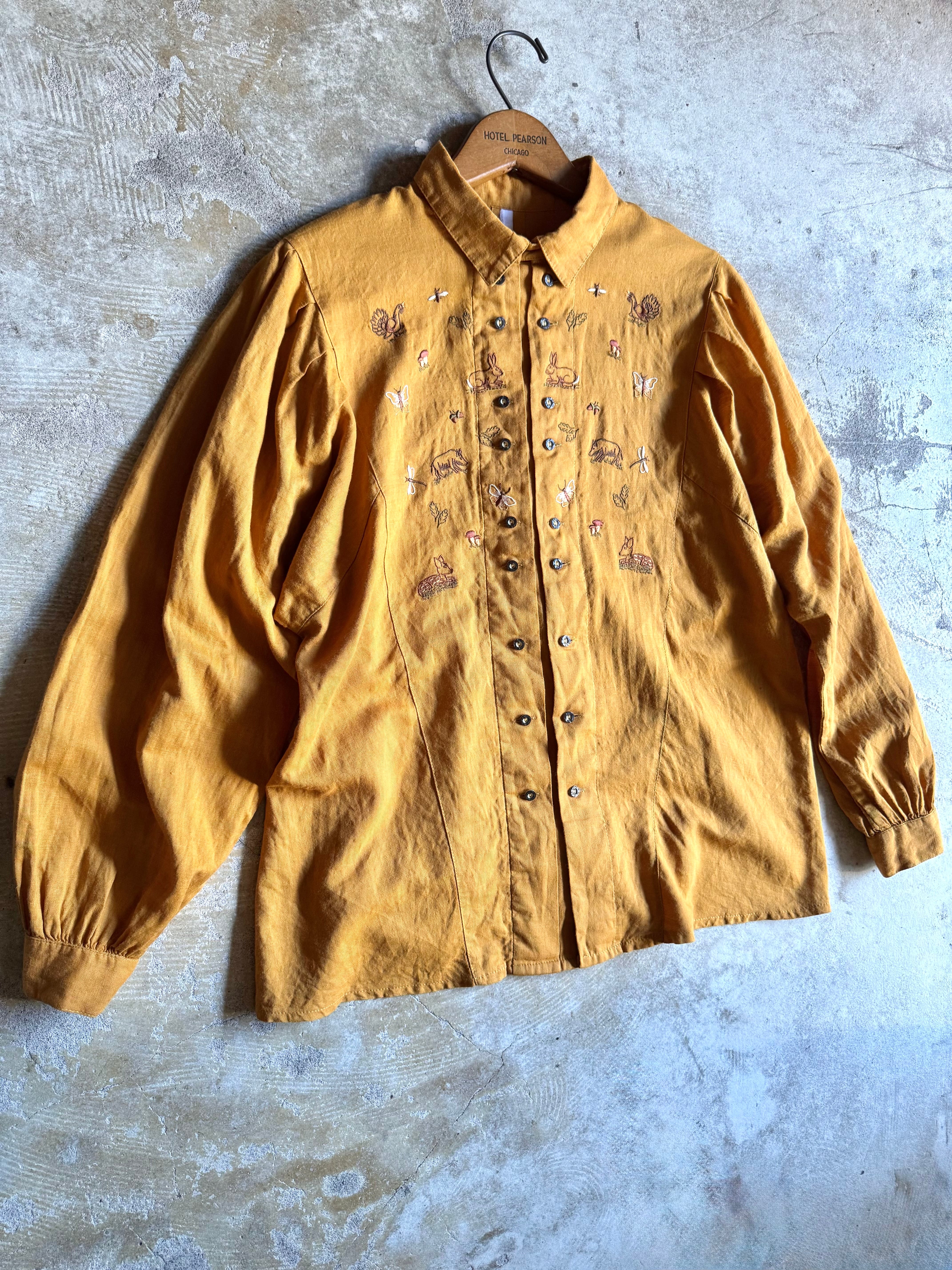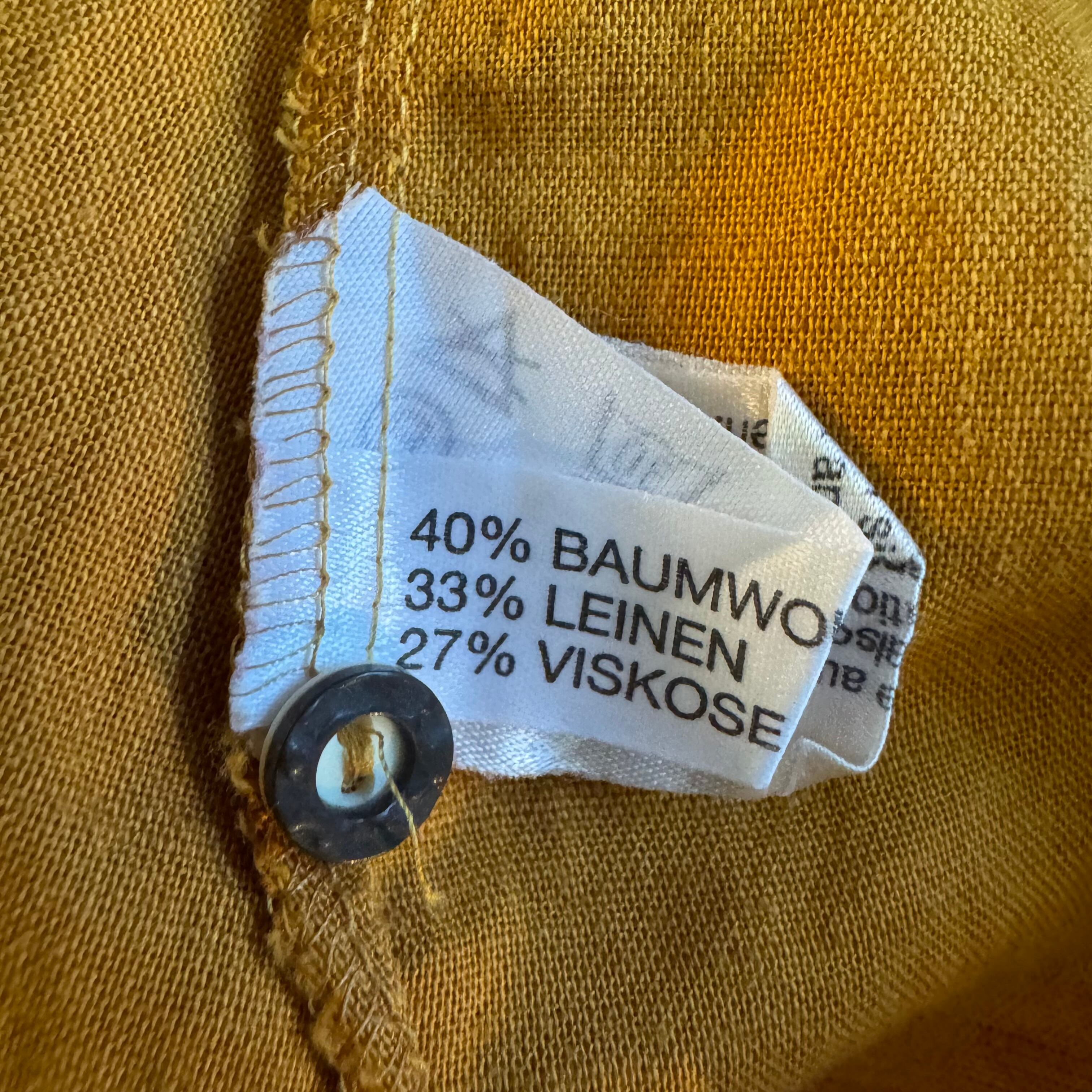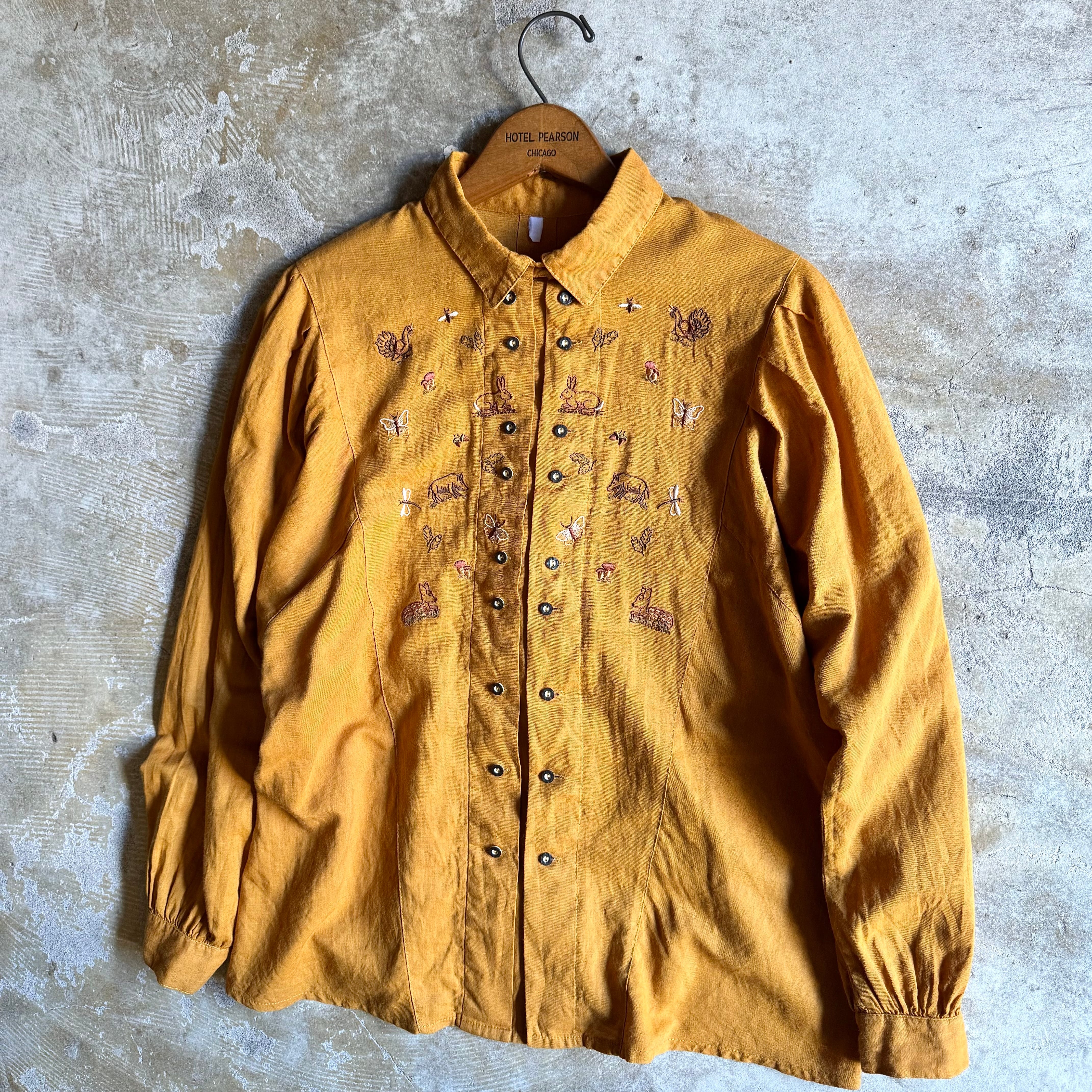 マスタード系の色合いが落ち着いた雰囲気のブラウス。ゆったりとした程良いボリュームのパフスリーブや、フロントのボタンのデザイン、そして胸元の刺繍等、チロルらしい凝ったディテールを持ちつつ、様々なアイテムとさらっと合わせやすいシンプルなシルエットが魅力的な1着です。肌触りの良い柔らかくさらりとした、しなやかな素材感です。