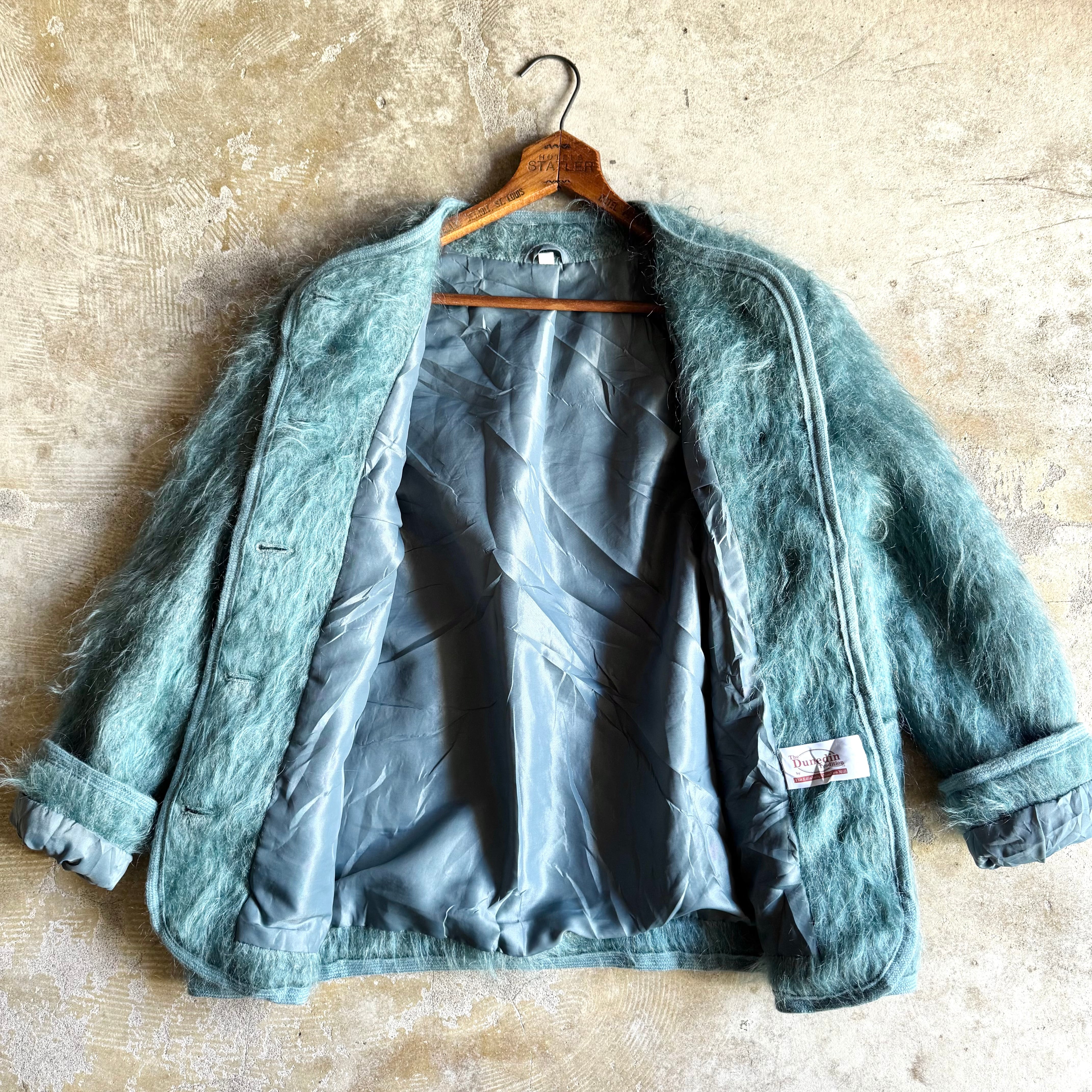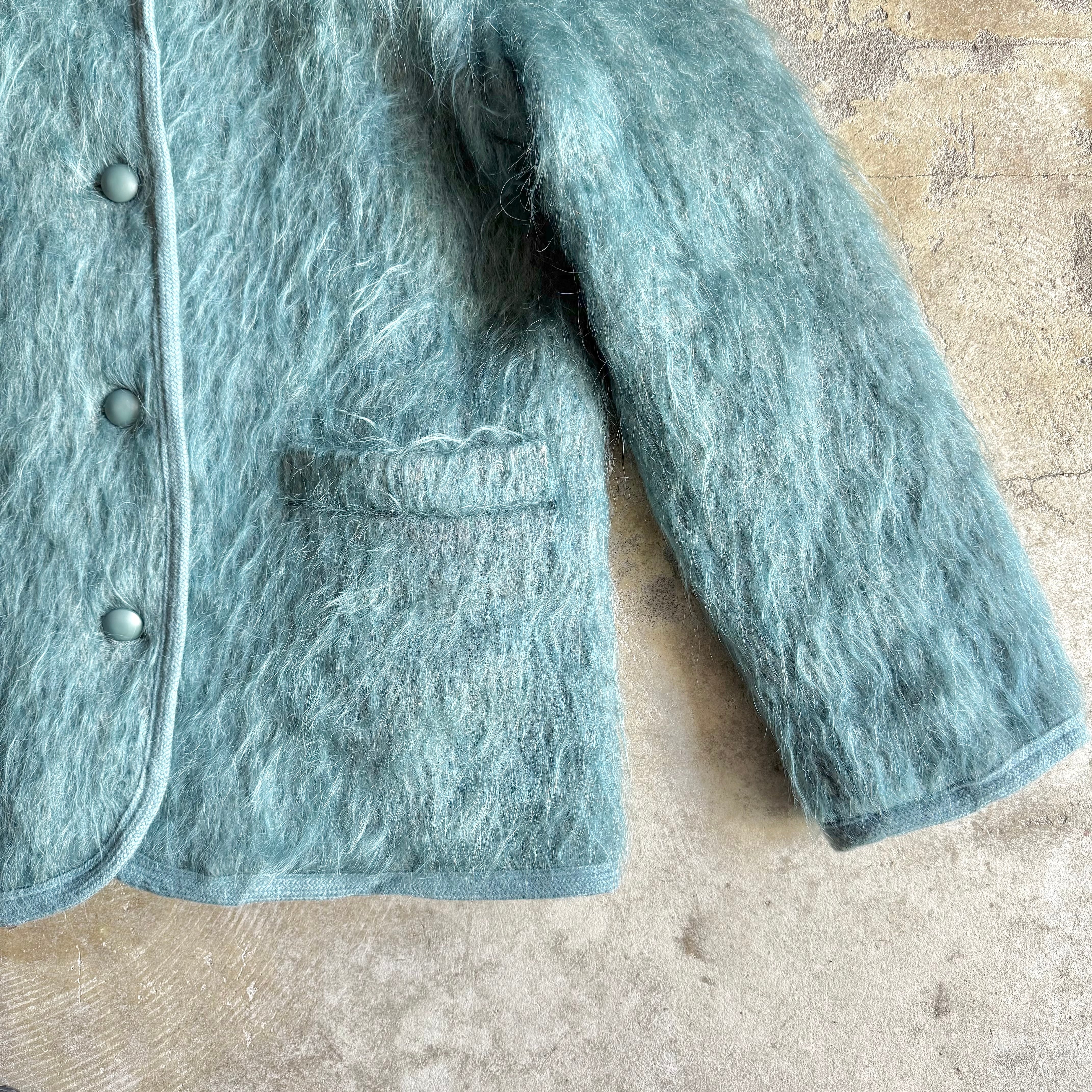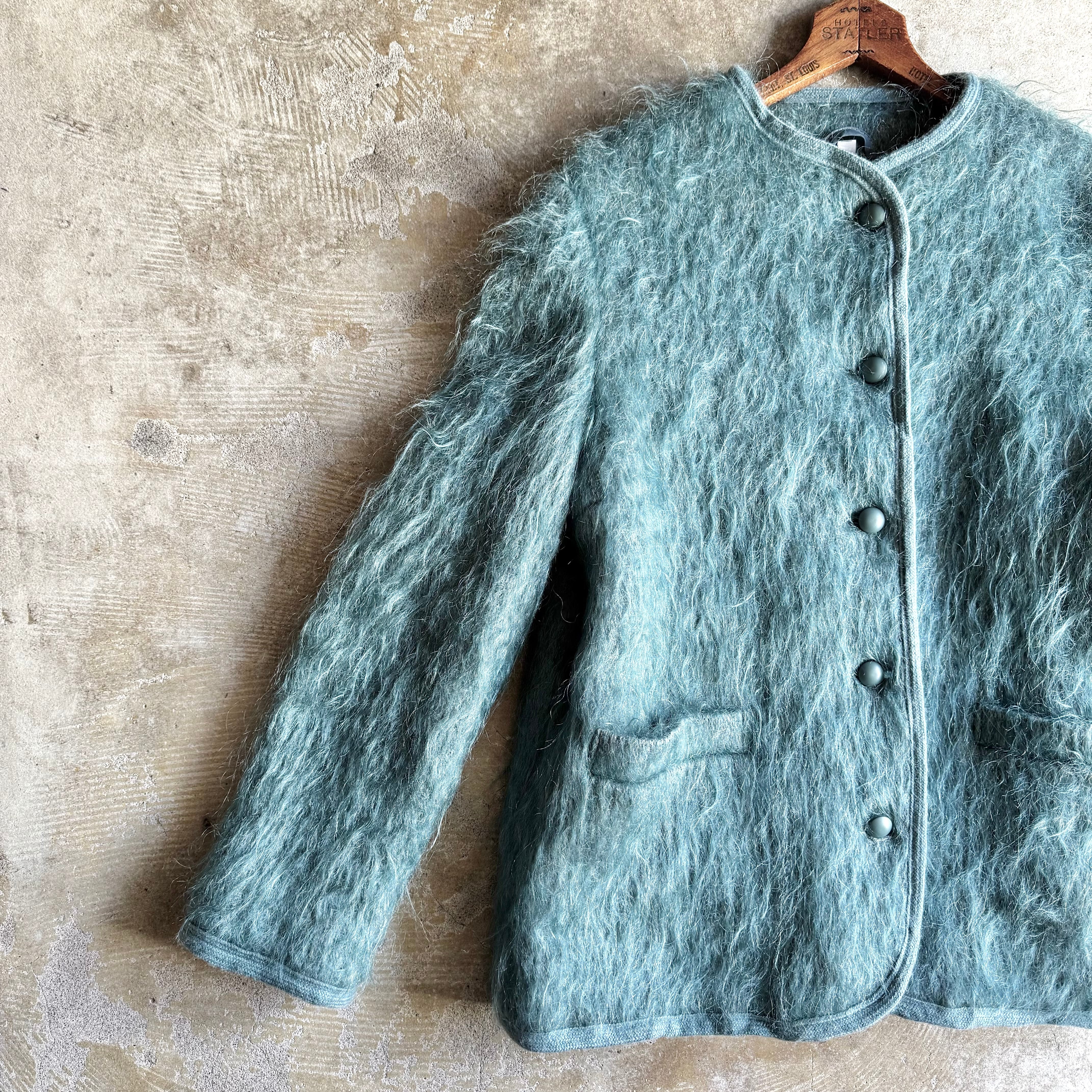 長い毛足のモヘアが素敵なノーカラージャケット。控えめながら存在感のある色合いが印象的です。袖も含めて、全体的に裏地が付いています。暖かさはもちろん、ニット等の上に羽織る時にもゴロゴロしにくく着やすいのも魅力的です。