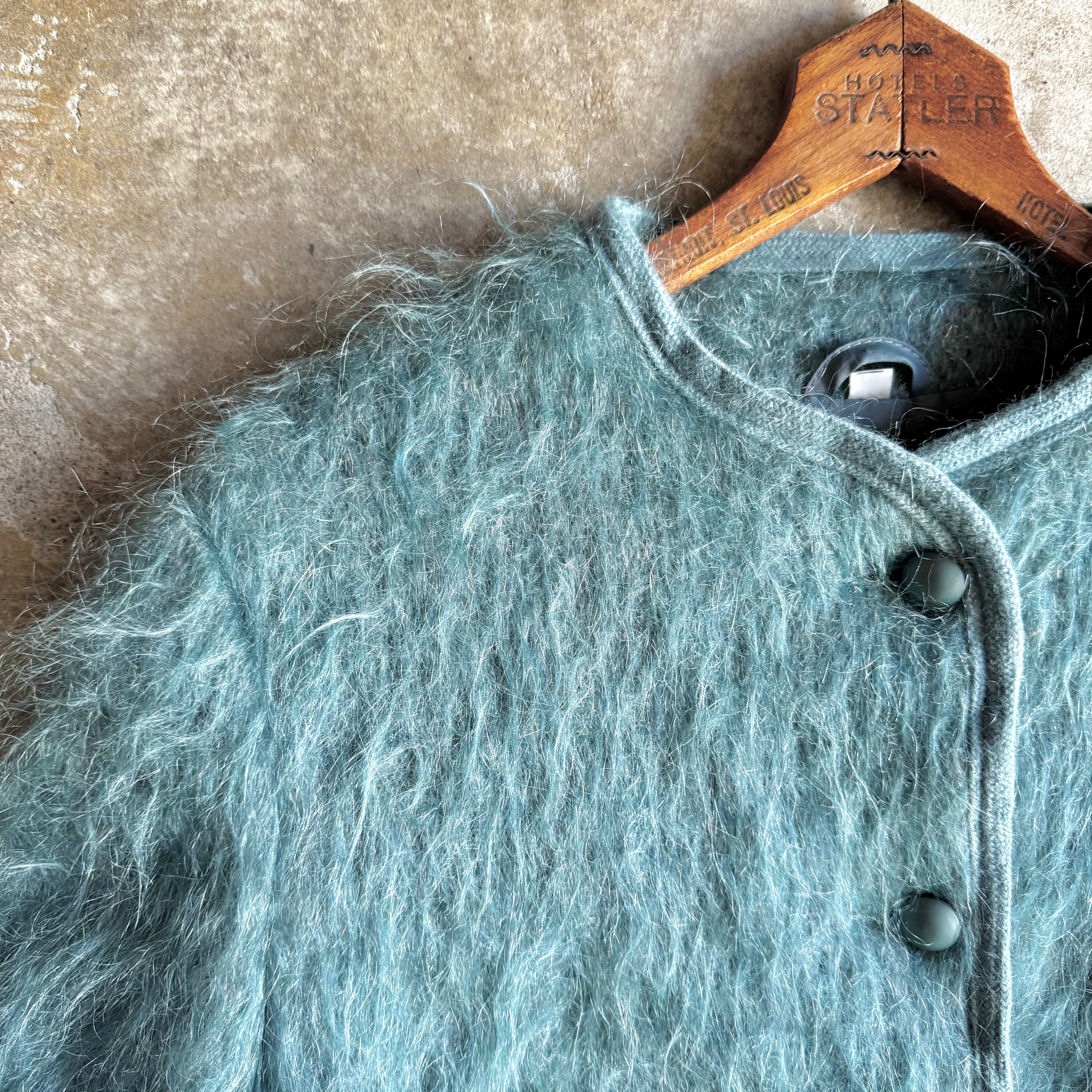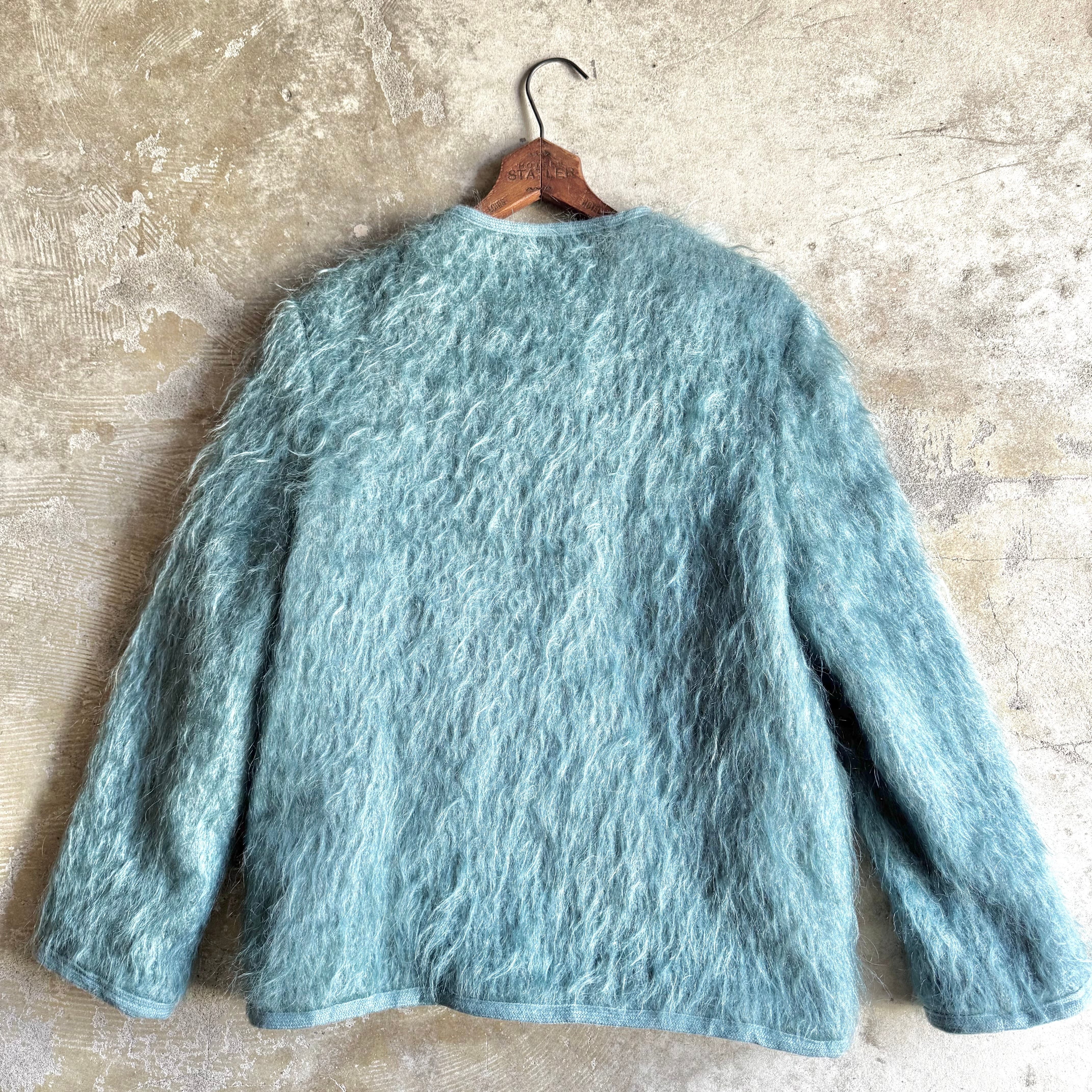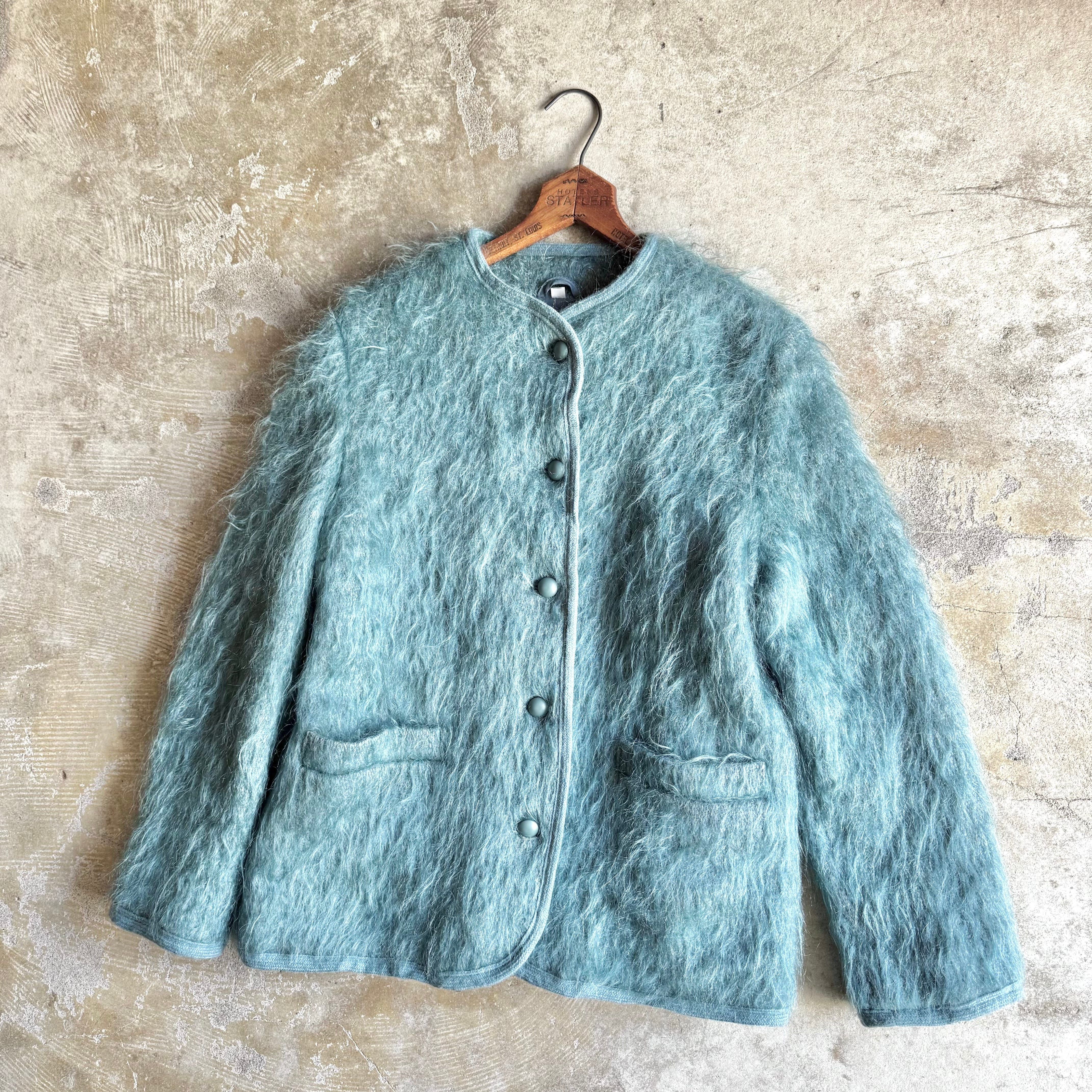 長い毛足のモヘアが素敵なノーカラージャケット。控えめながら存在感のある色合いが印象的です。袖も含めて、全体的に裏地が付いています。暖かさはもちろん、ニット等の上に羽織る時にもゴロゴロしにくく着やすいのも魅力的です。