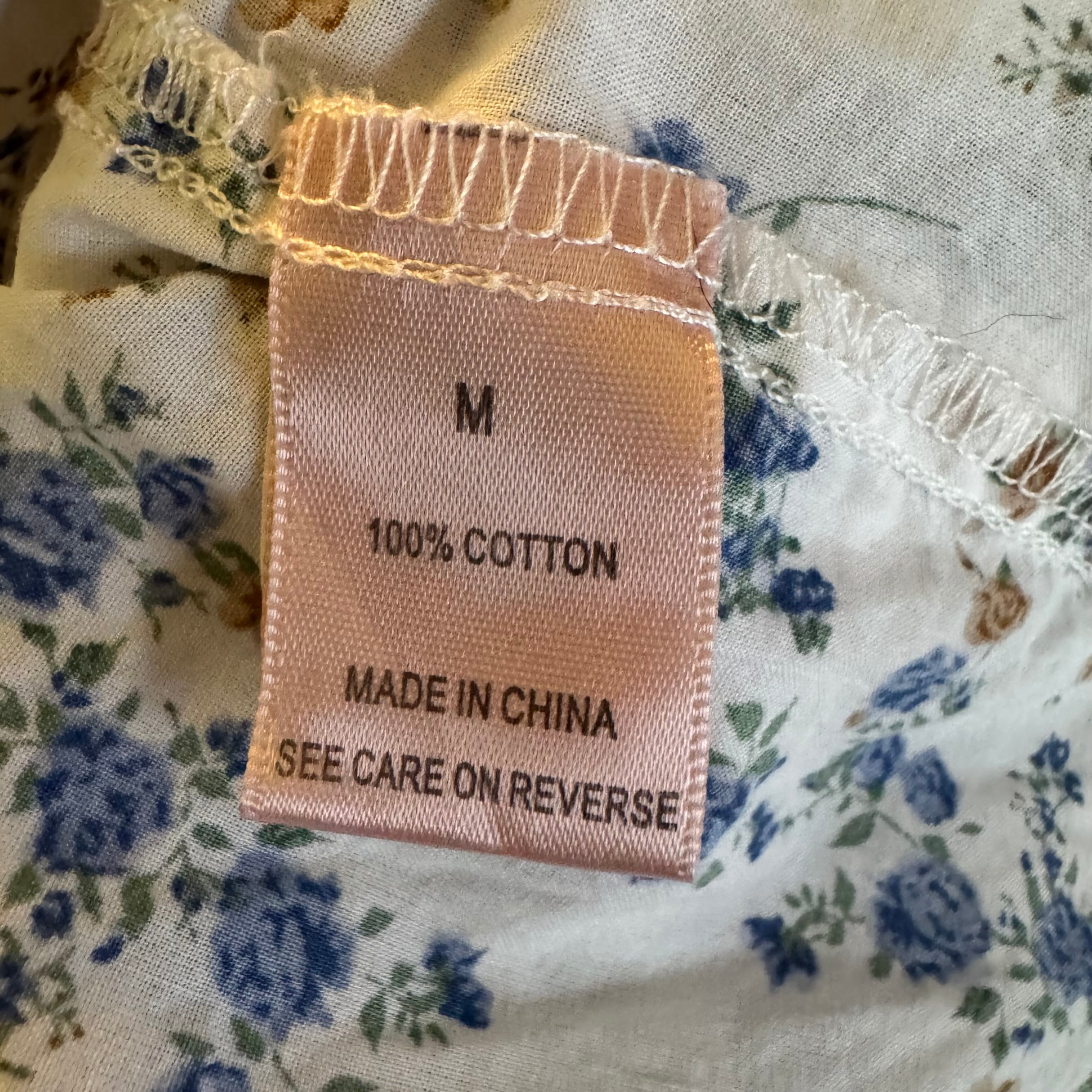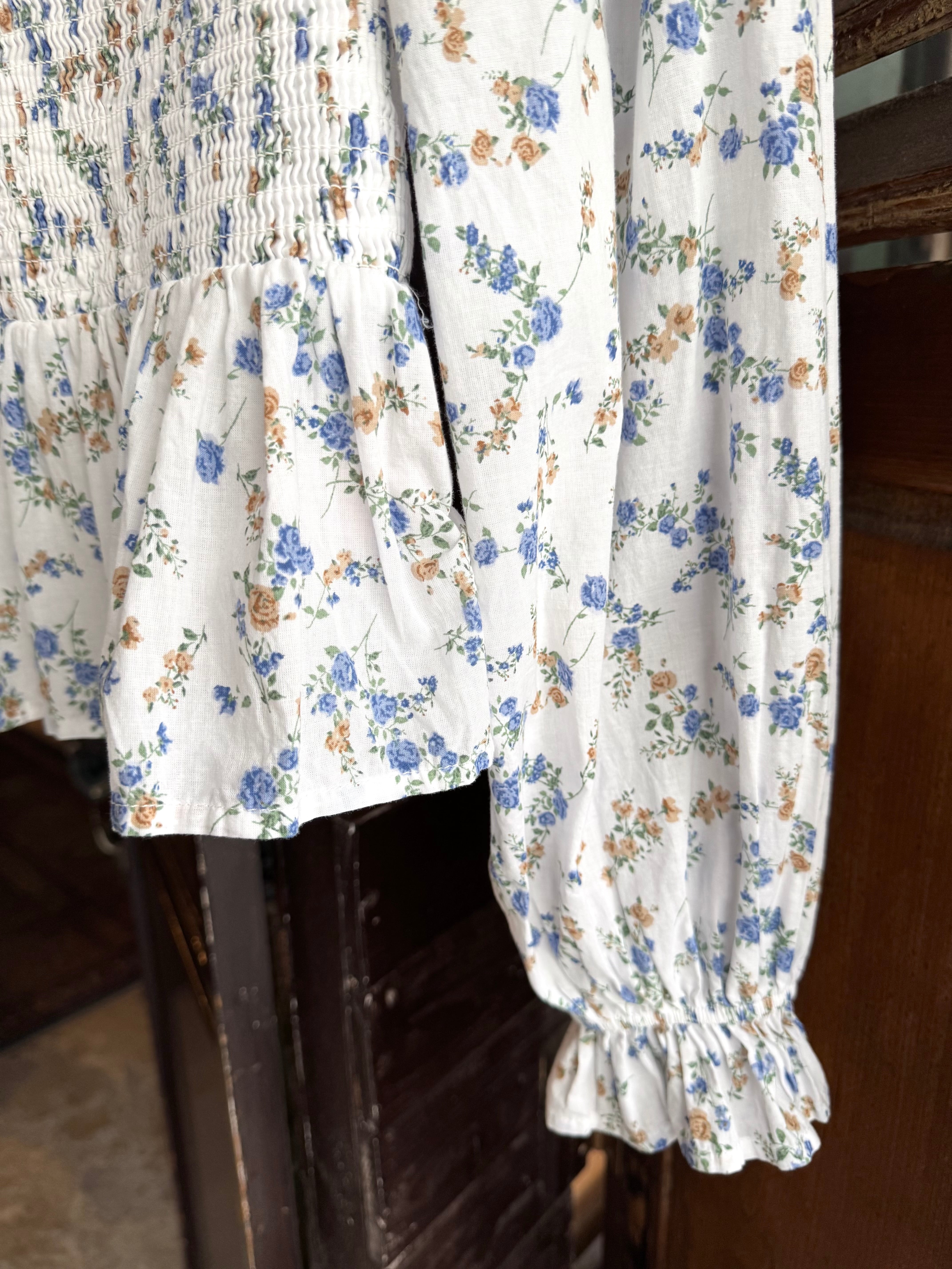 ホワイトベースにブルー系で描かれた小花柄が素敵なプルオーバートップス。少し短めな丈がブラウスやTシャツ、ワンピース等様々なアイテムと合わせやすく、幅広い雰囲気のコーディネートで活躍してくれそうです。柔らかなコットン素材です。