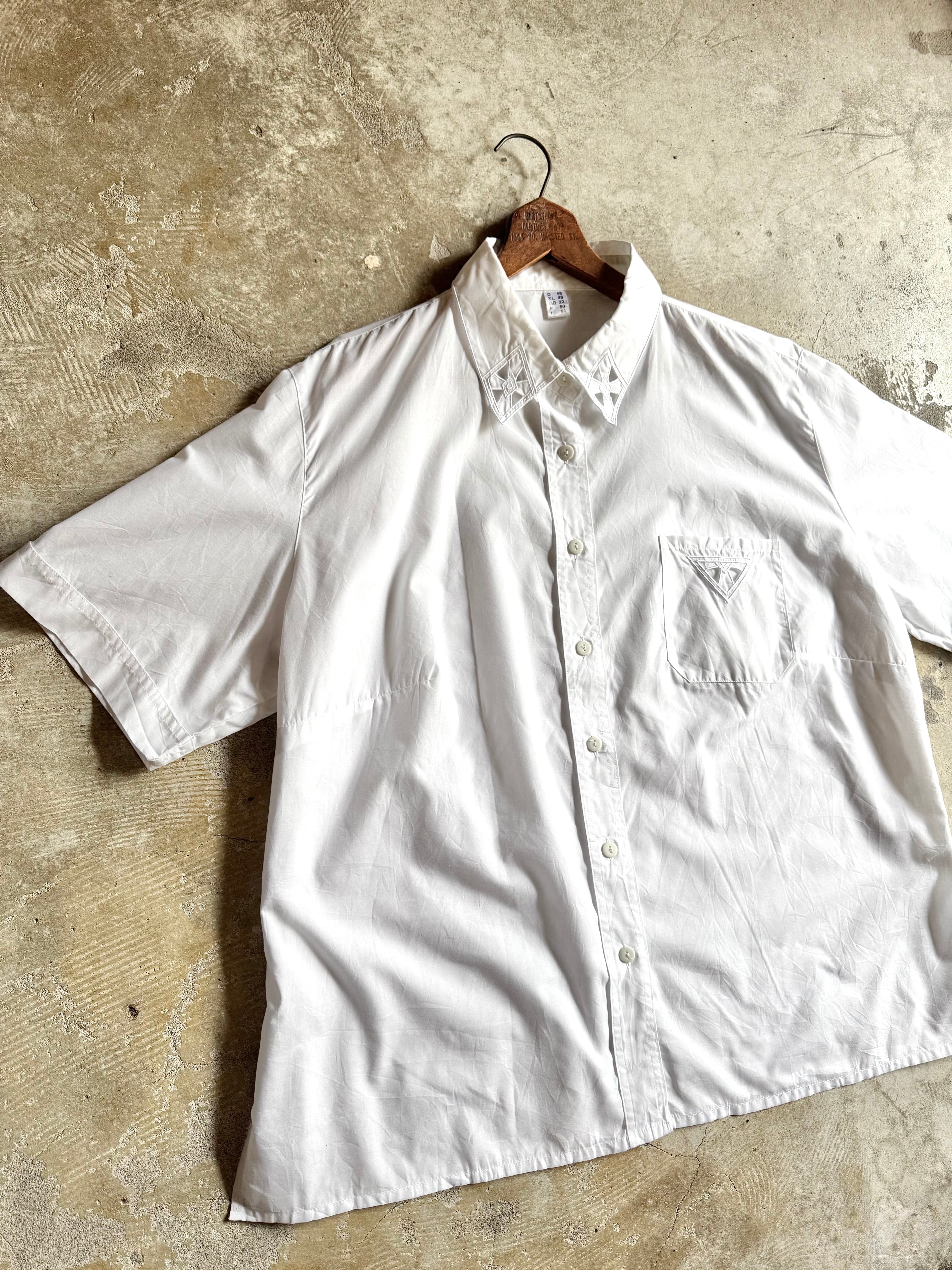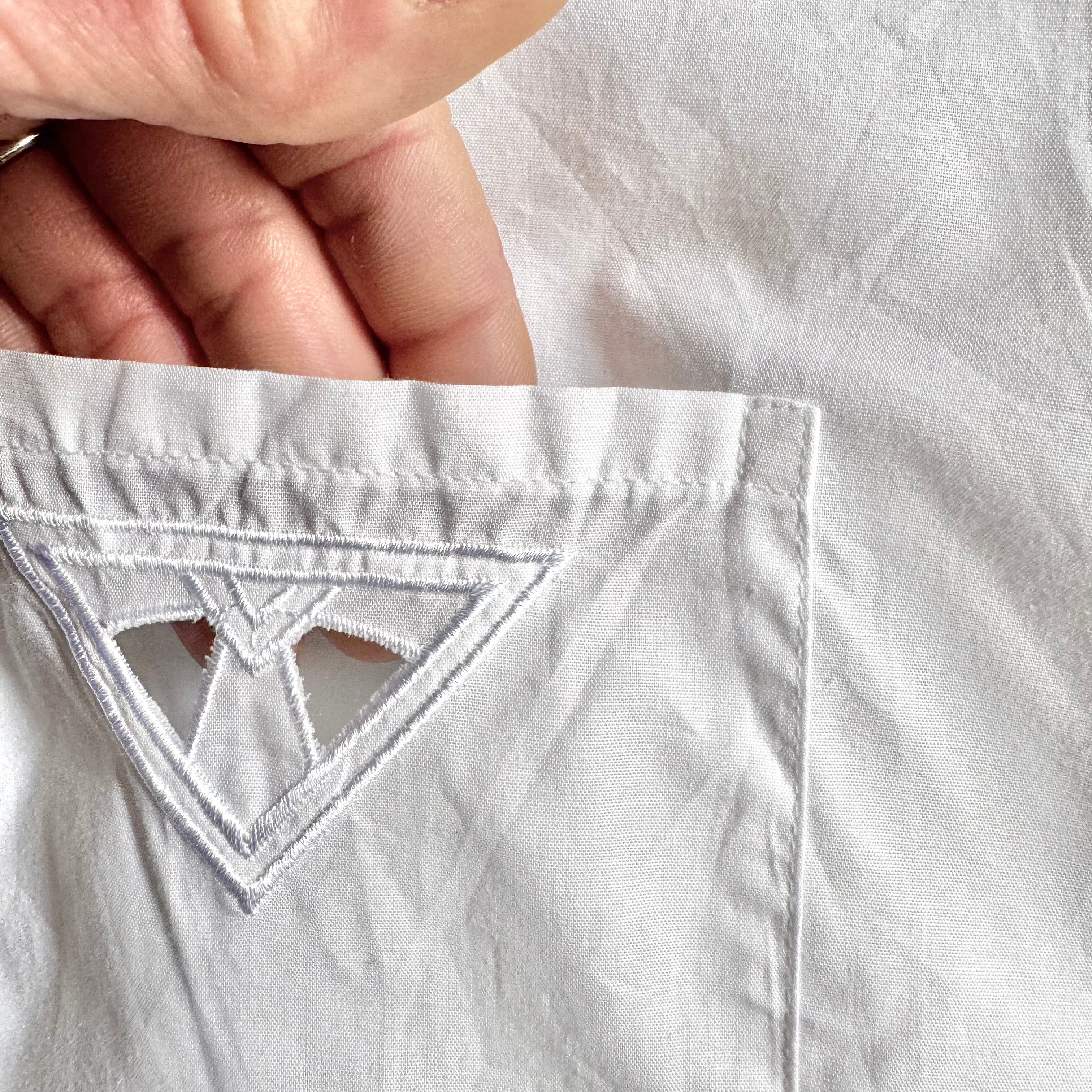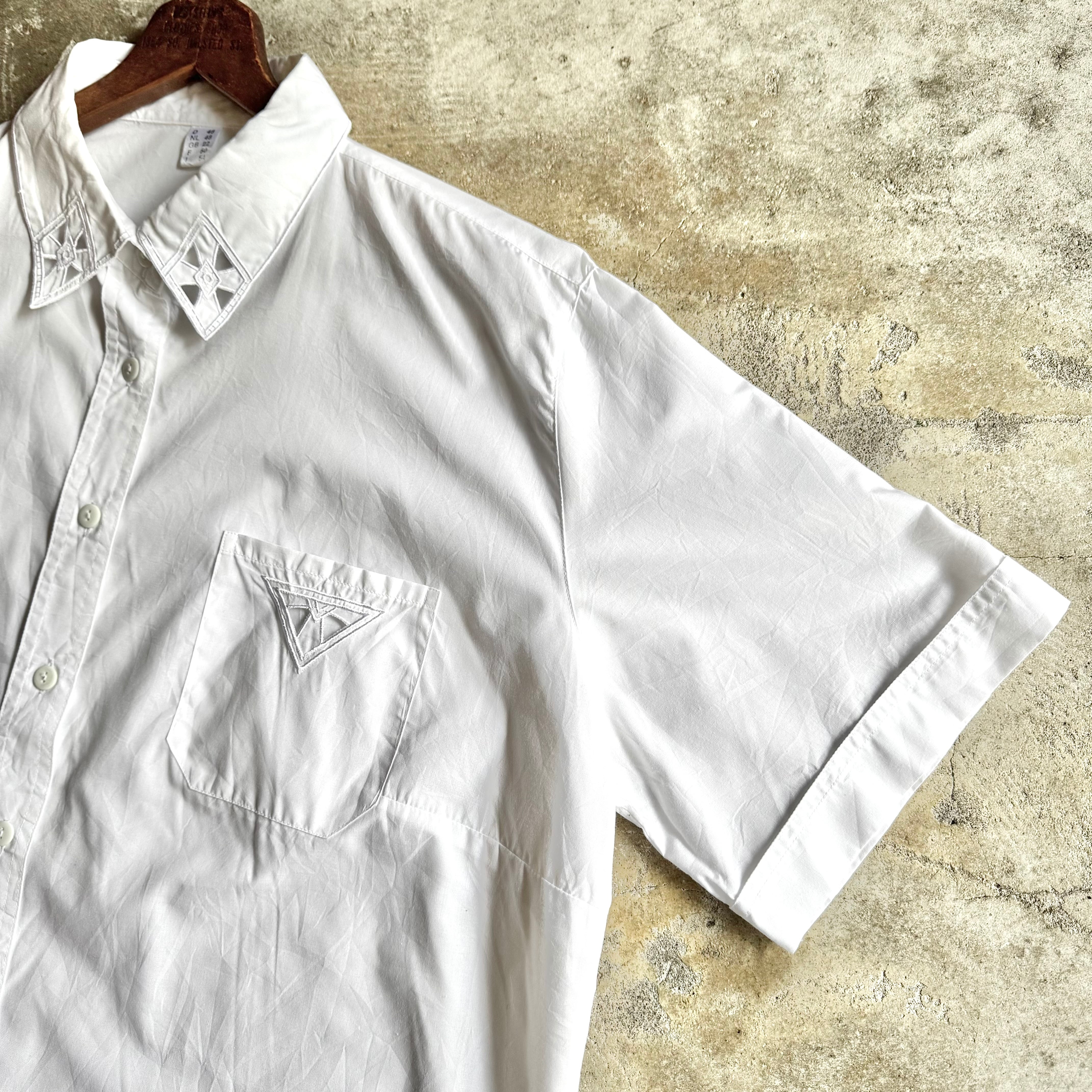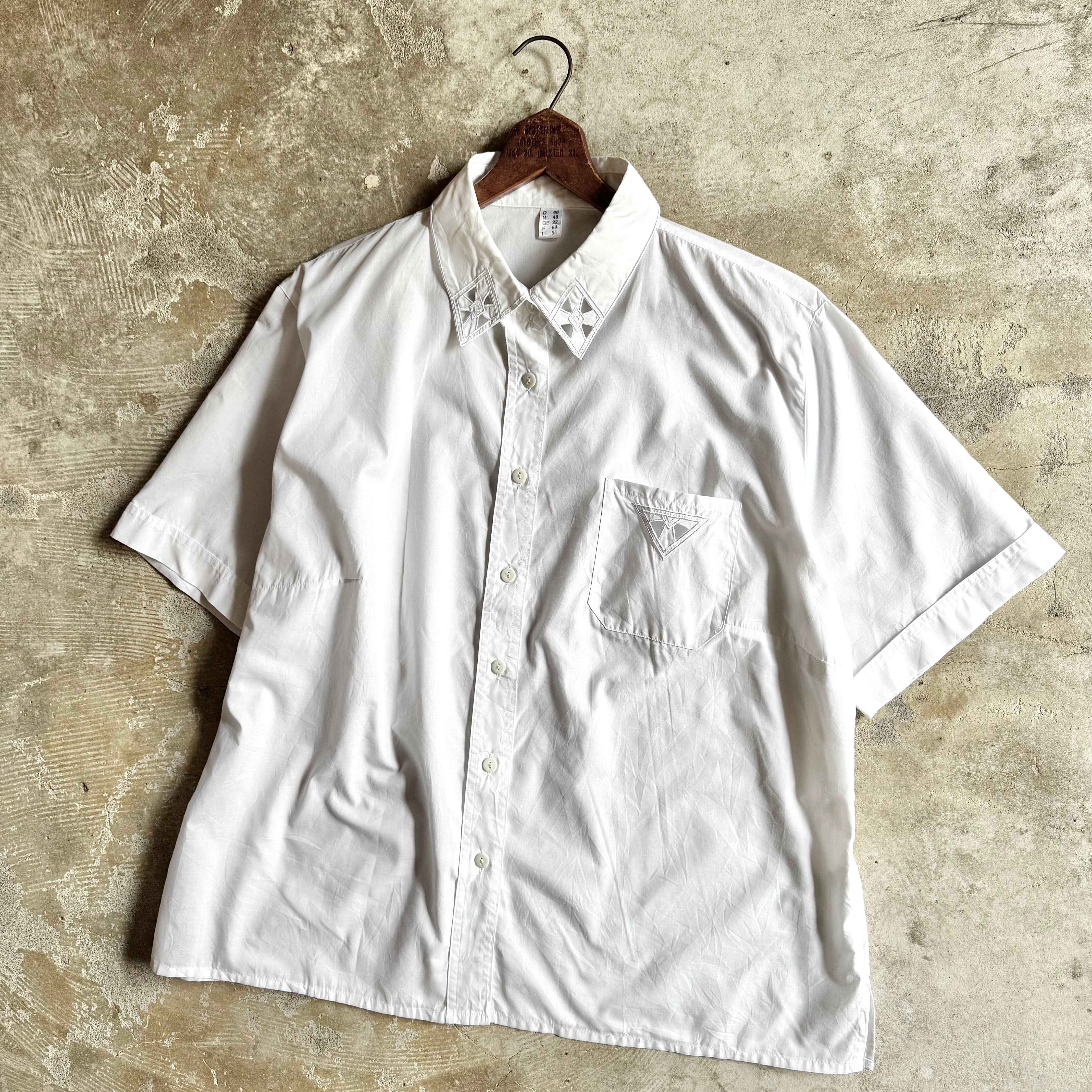 襟と胸ポケットのモチーフがアクセントになっているホワイトシャツ。身幅のたっぷりあるボックスに近いゆるやかなシルエット。シンプルにそのままはもちろん、ジャケット等のインナーや、Tシャツ等にふわっと重ねる羽織りアイテムとしてもオススメです。きれいめにもカジュアルにも、様々なシーンでご着用いただけます。コットンとポリエステル混合の少しハリのある、しなやかな素材感です。