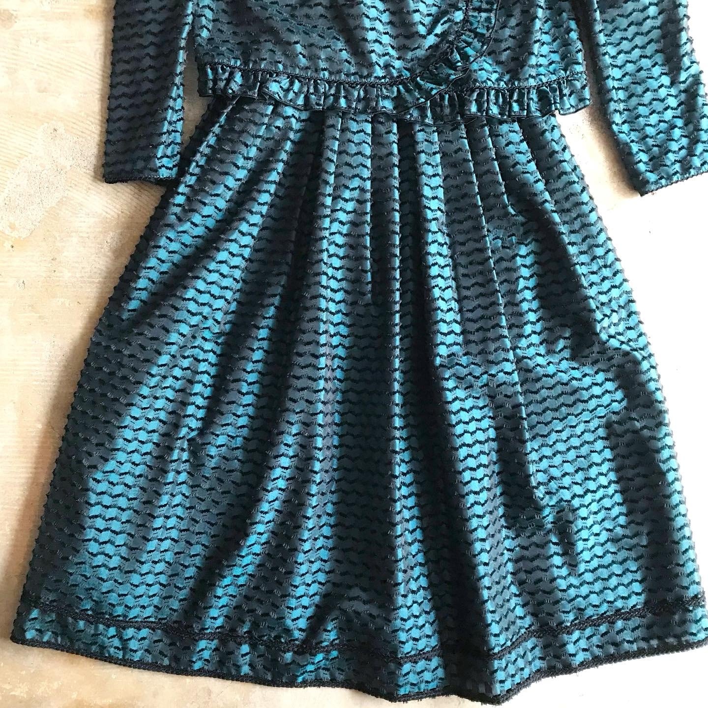 ショート丈ジャケットとスカートのセットアップのようなデザインが素敵なワンピース。少し光沢のあるシックな色合いが印象的です。フロントのベロア素材のボタンも、控えめながらさりげないアクセントになっていますね。透け感のない、さらりとしたしなやかな素材感です。袖部分以外に裏地が付いています。