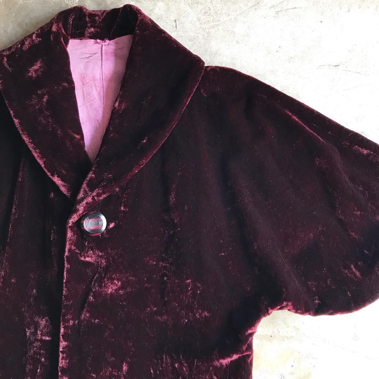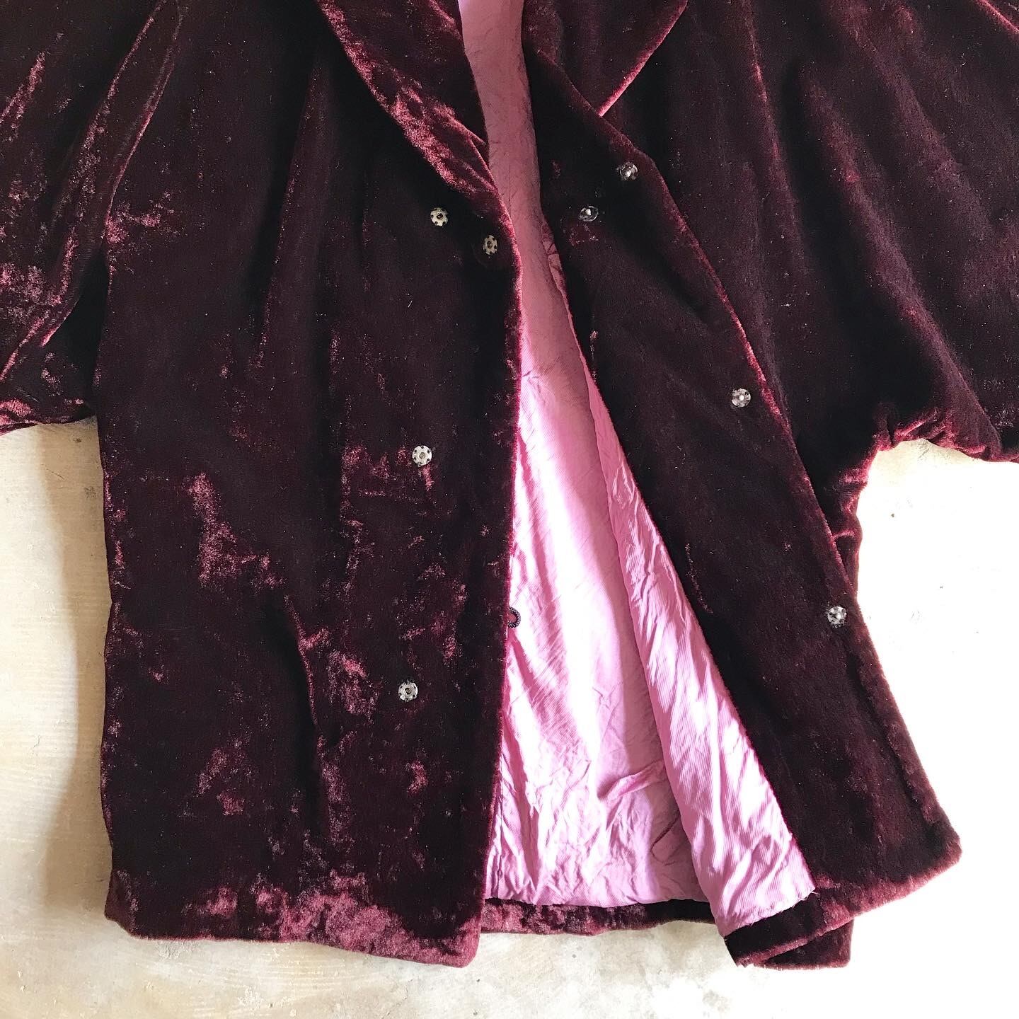 深いボルドーの色合いが素敵なこちら。着物の羽織りのようなデザインのベロアハーフコートです。肩にかかる襟とゆるやかな袖のシルエットが印象的です。きれいめにもカジュアルにも、様々なコーディネートでお楽しみいただけます。暖かみのあるベロアの素材感です。全体に裏地が付いています。