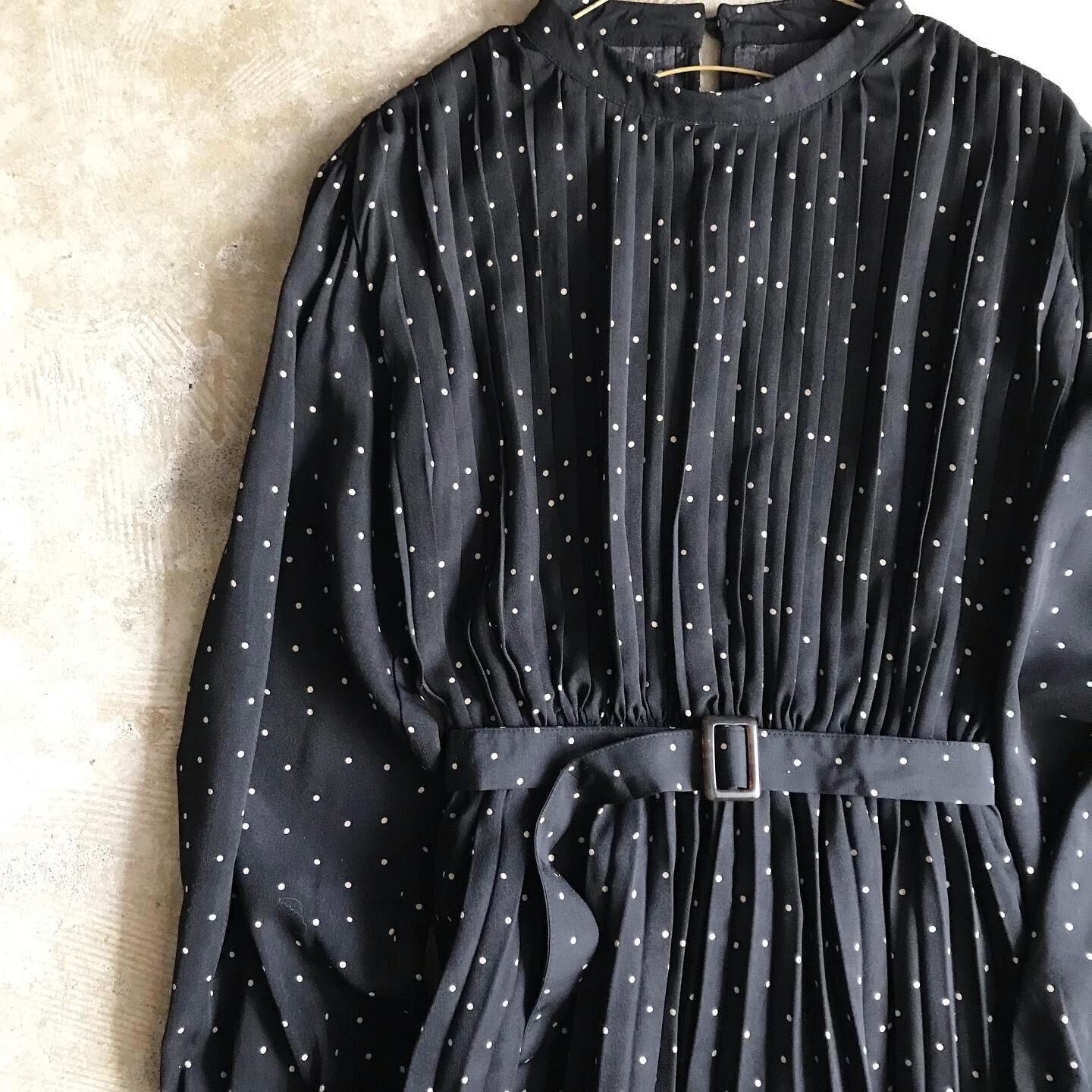 【SOLD OUT】プリーツワンピース ブラック 総柄 ベルト付き USED