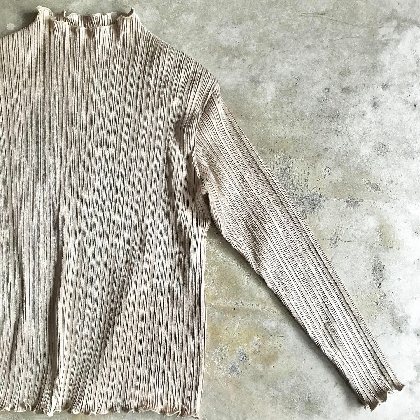 プリーツのデザインが素敵なプルオーバートップス。ほんのり光沢のあるベージュ系の色合いが大人っぽい雰囲気です。インナーとしてはもちろん、ぴったりしすぎないサイズ感としっかりした素材感なので、1枚でお楽しみいただくのもオススメです。少しハリのある、さらりとした素材感です。透け感はありません。
