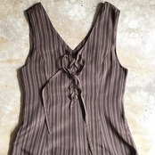 ブラウン系のシックな色合いが素敵なノースリーブワンピース。胸元のレースアップとストライプ柄が印象的です。自然に下に落ちるすっきりとしたシルエットが大人っぽい雰囲気です。ノースリーブや長袖インナーを合わせたり、パンツとのレイヤードスタイルもオススメです。さらりとしたしなやかな素材感です。全体に裏地が付いています。