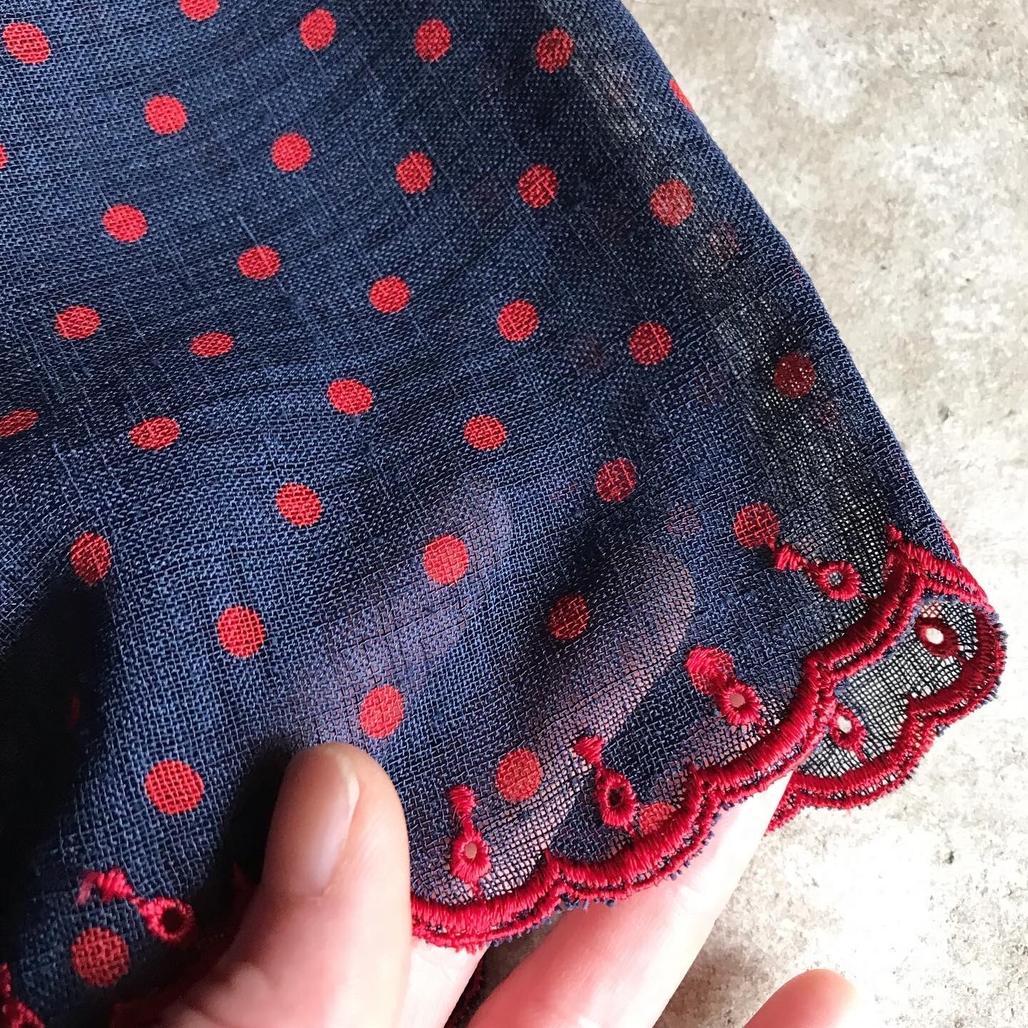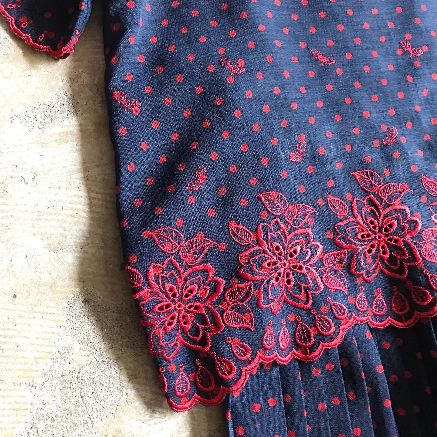 裾と袖に美しい刺繍が施されたトップスと、プリーツスカートのセットアップのようなデザインのワンピース。シックなネイビーの色合いが印象的です。ウエストの両サイドにはベルトループが付いているので、お持ちのベルトでウエストマークすることによって、雰囲気を変えてお楽しみいただけます。少しハリのある、さらりとしたしなやかな素材感です。袖以外に裏地が付いています。