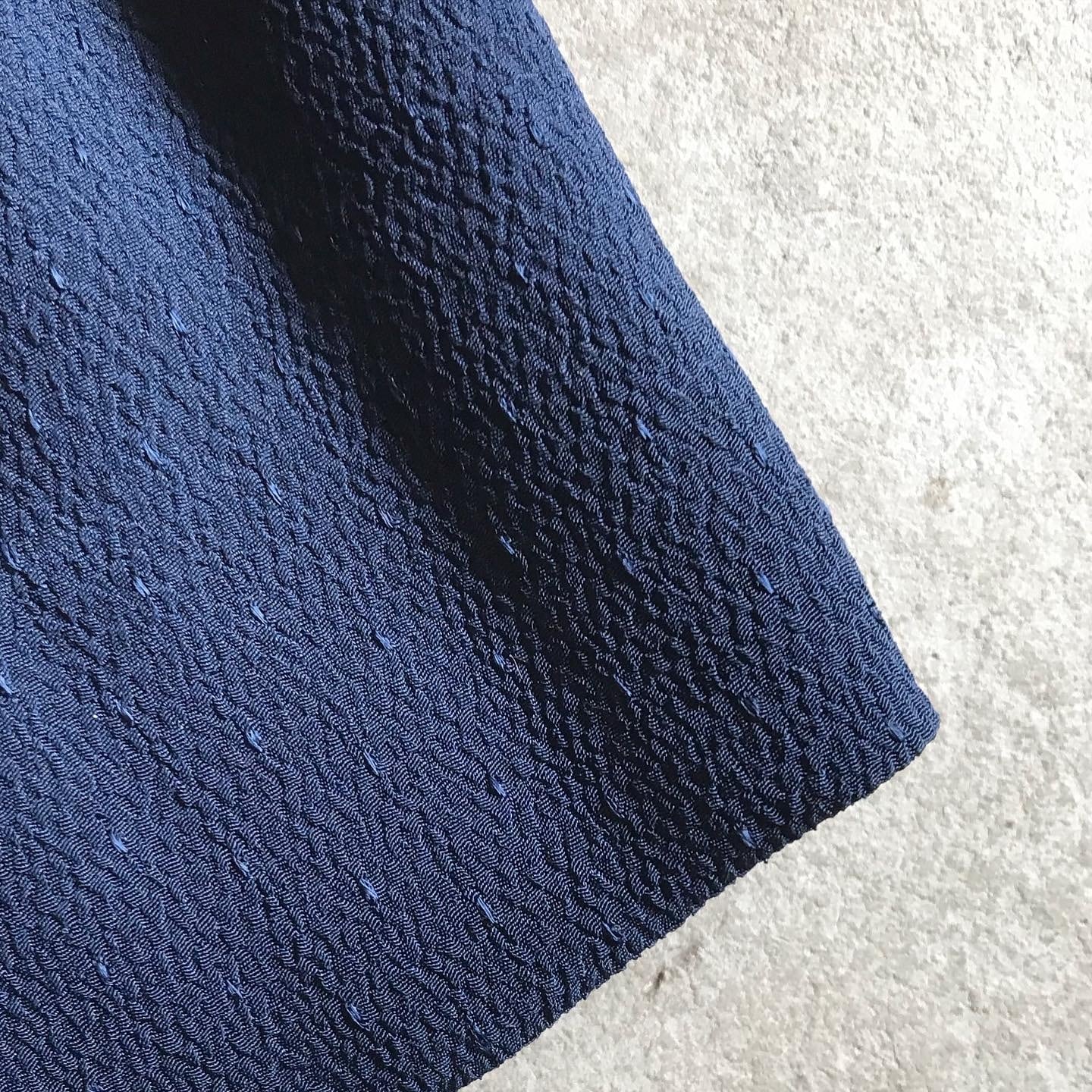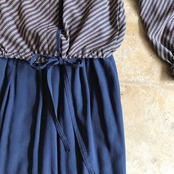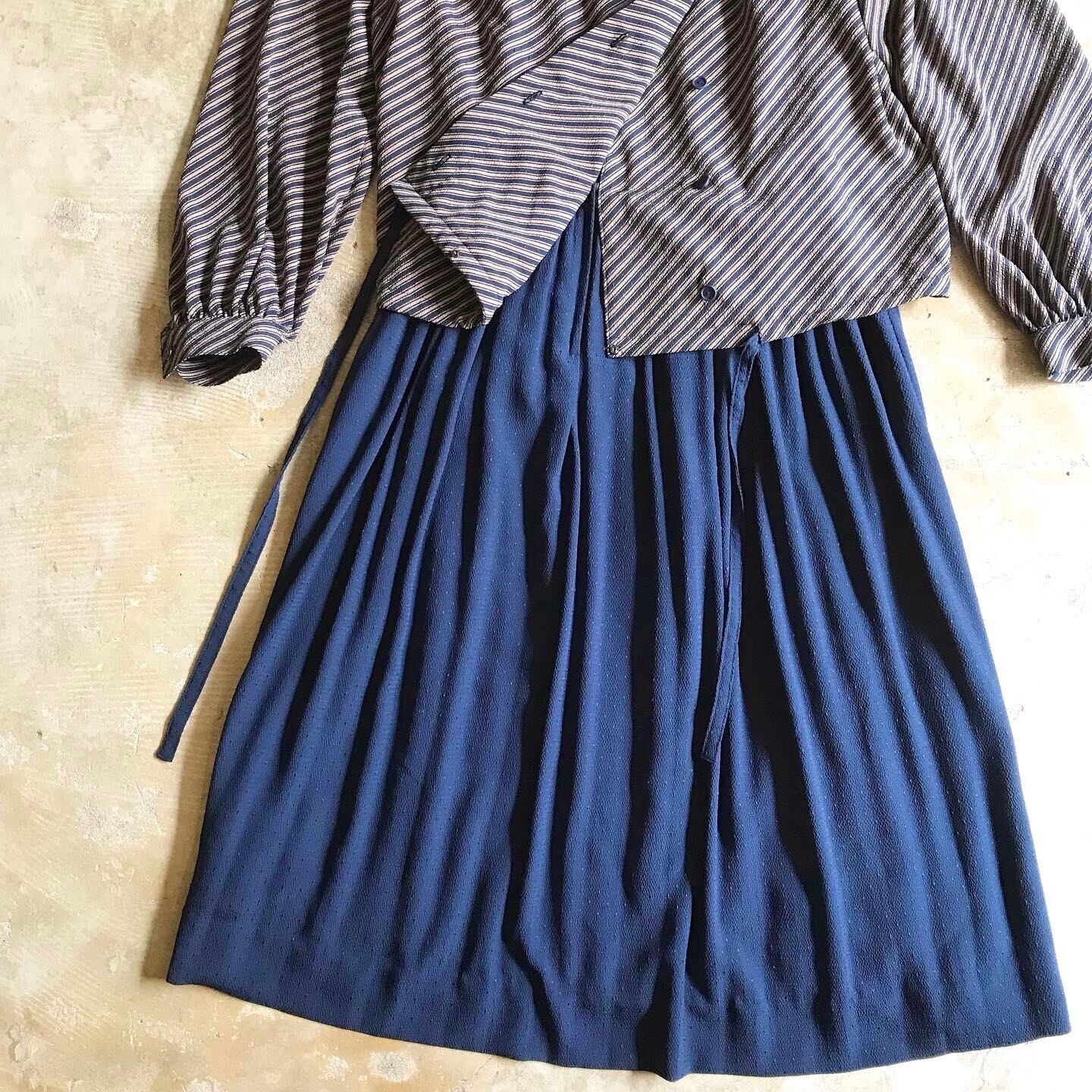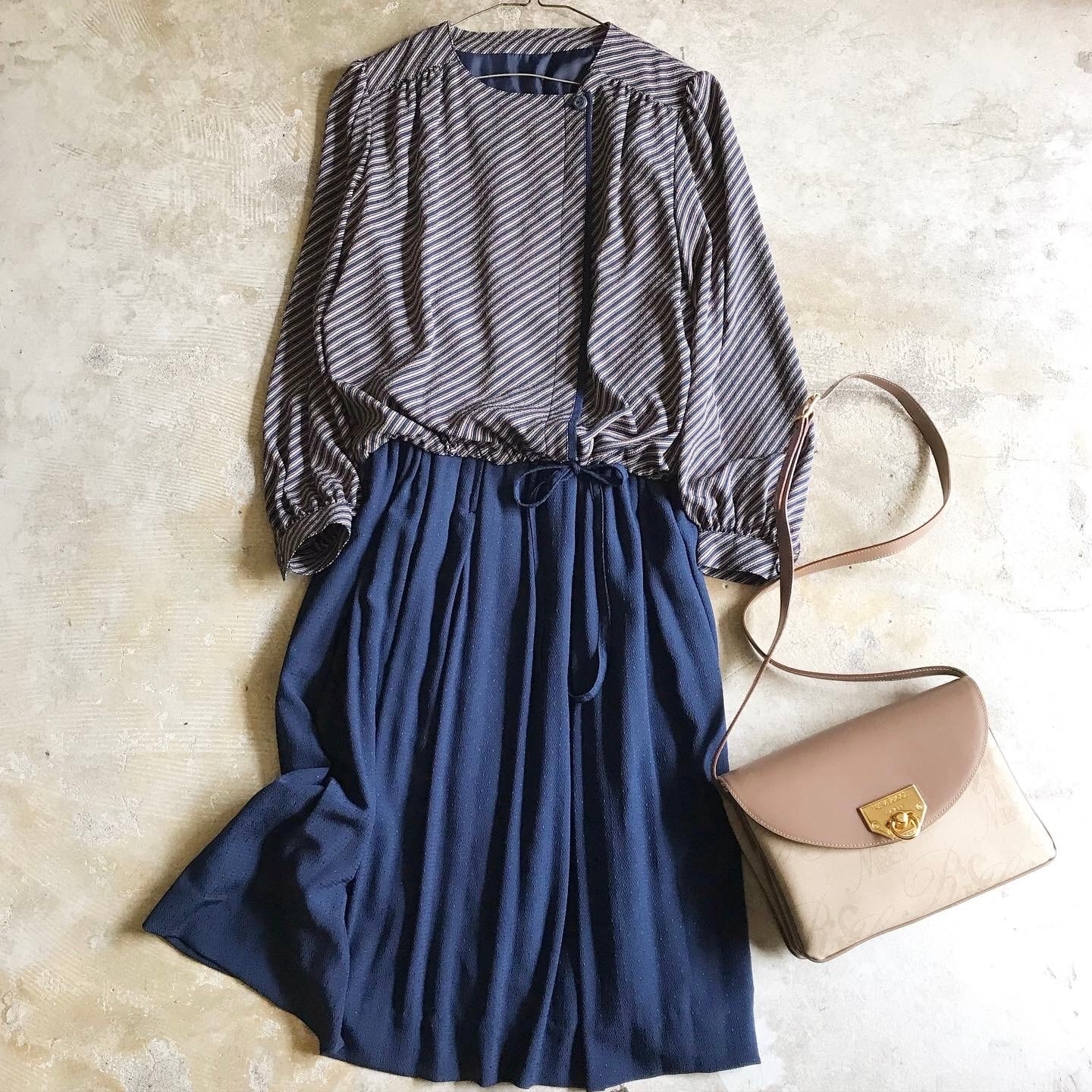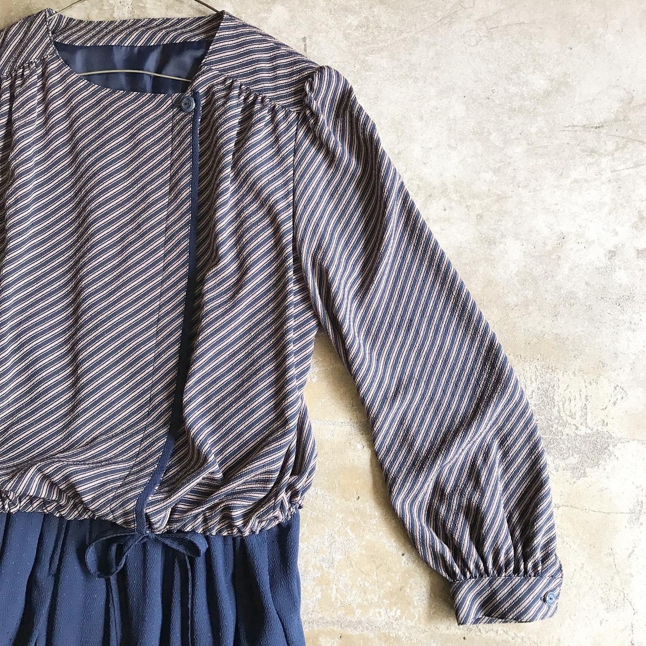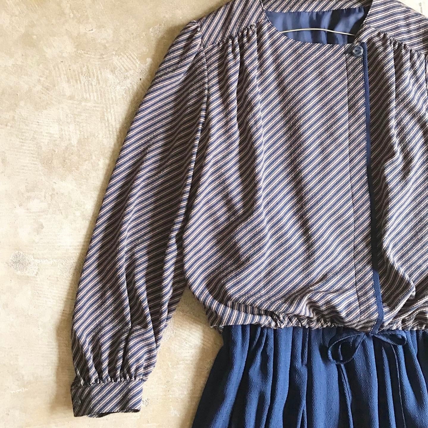 ブラウスとシンプルなネイビースカートを合わせたようなデザインのワンピース。落ち着いた色合いが大人っぽい雰囲気です。すっきりとした首元なので、ハイネック等インナーをレイヤードするコーディネートもオススメです。さらりとしたしなやかな素材感です。袖部分以外に裏地が付いています。