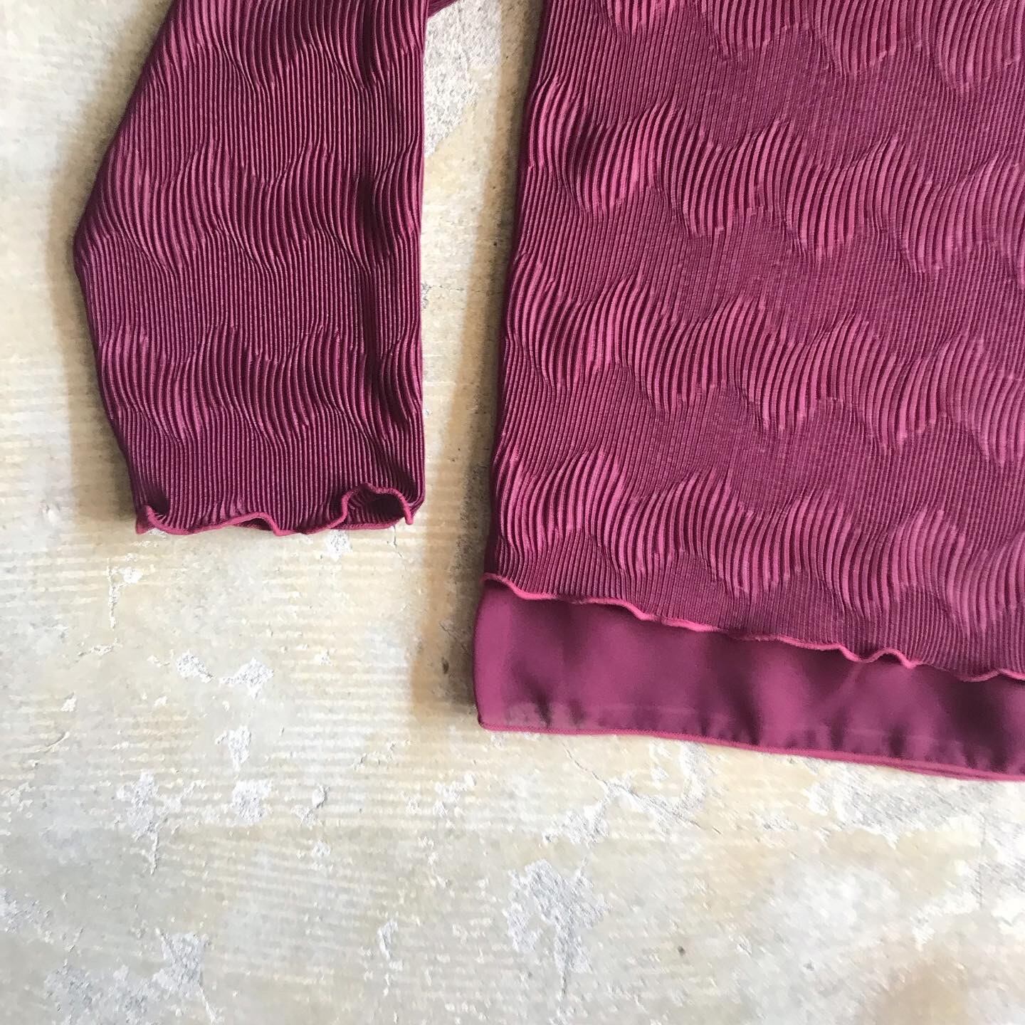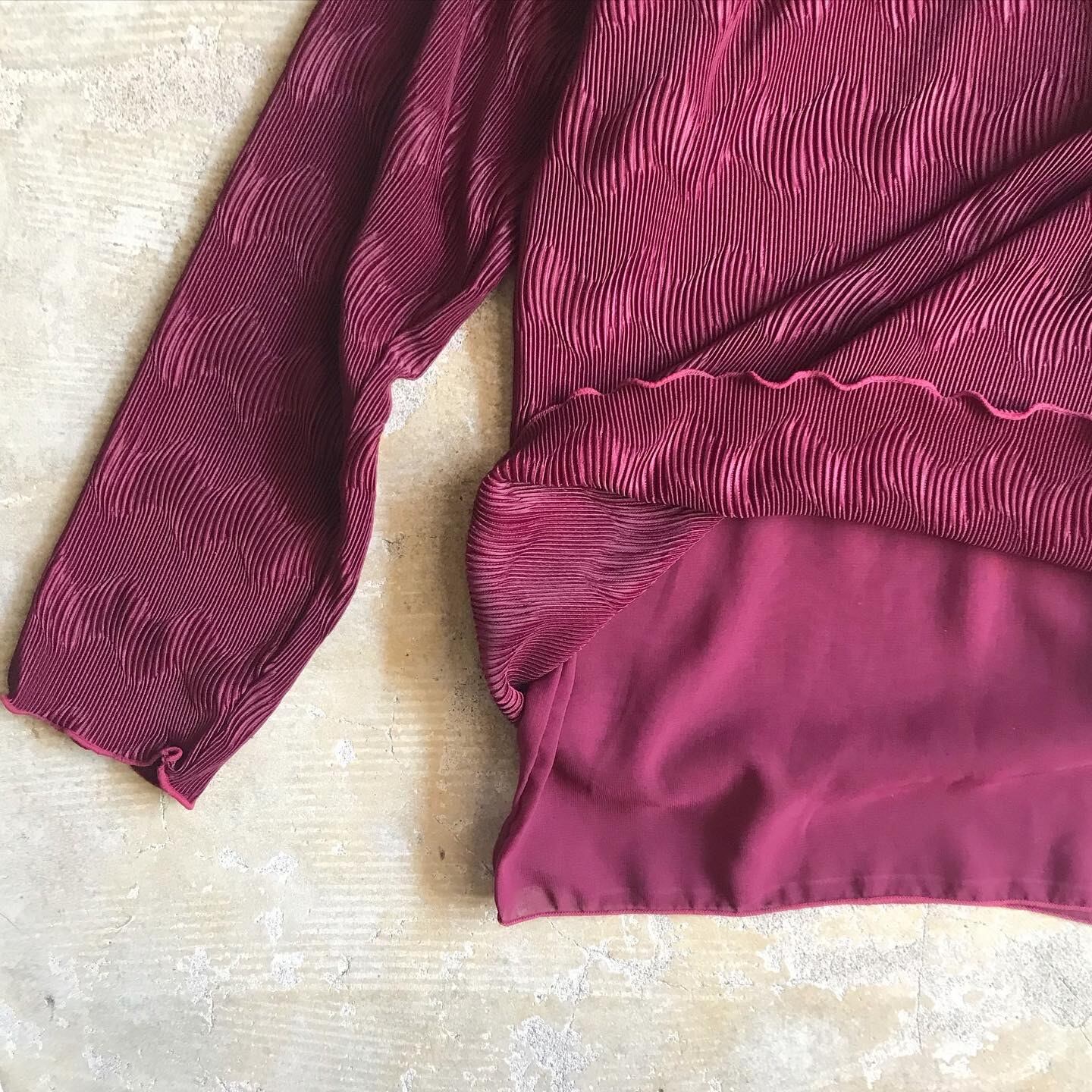 シックな色合いが素敵なプリーツプルオーバーブラウス。ハイネックの首元と、裾から少し見える2枚生地が重なったデザインが印象的です。きれいめな女性らしいデザインですが、デニムパンツ等と合わせてカジュアルにお楽しみいただくのもオススメです。少し光沢のある、さらりとしたしなやかな素材感です。