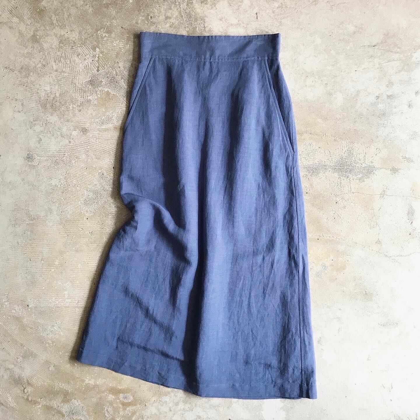 くすんだブルー系の絶妙な発色が素敵なロングスカート。リネンとレーヨンの柔らかくしなやかな素材感です。しっかり長めな丈感と、ふんわり広がりすぎず、すとんと下に落ちるシルエットか大人っぽい雰囲気です。きれいめな女性らしいコーディネートはもちろん、スウェットやTシャツとカジュアルにお楽しみいただくのもオススメです。裏地が付いています。