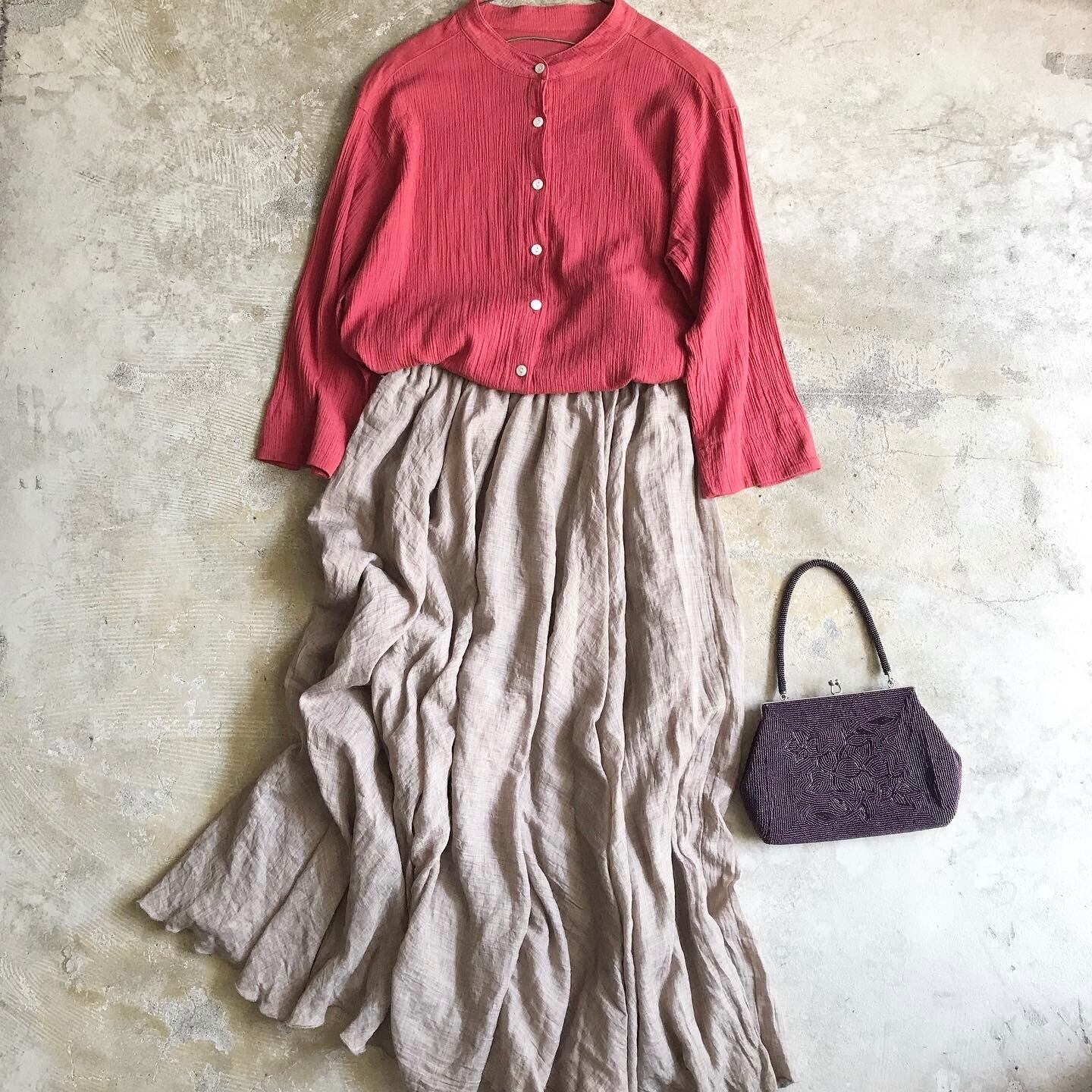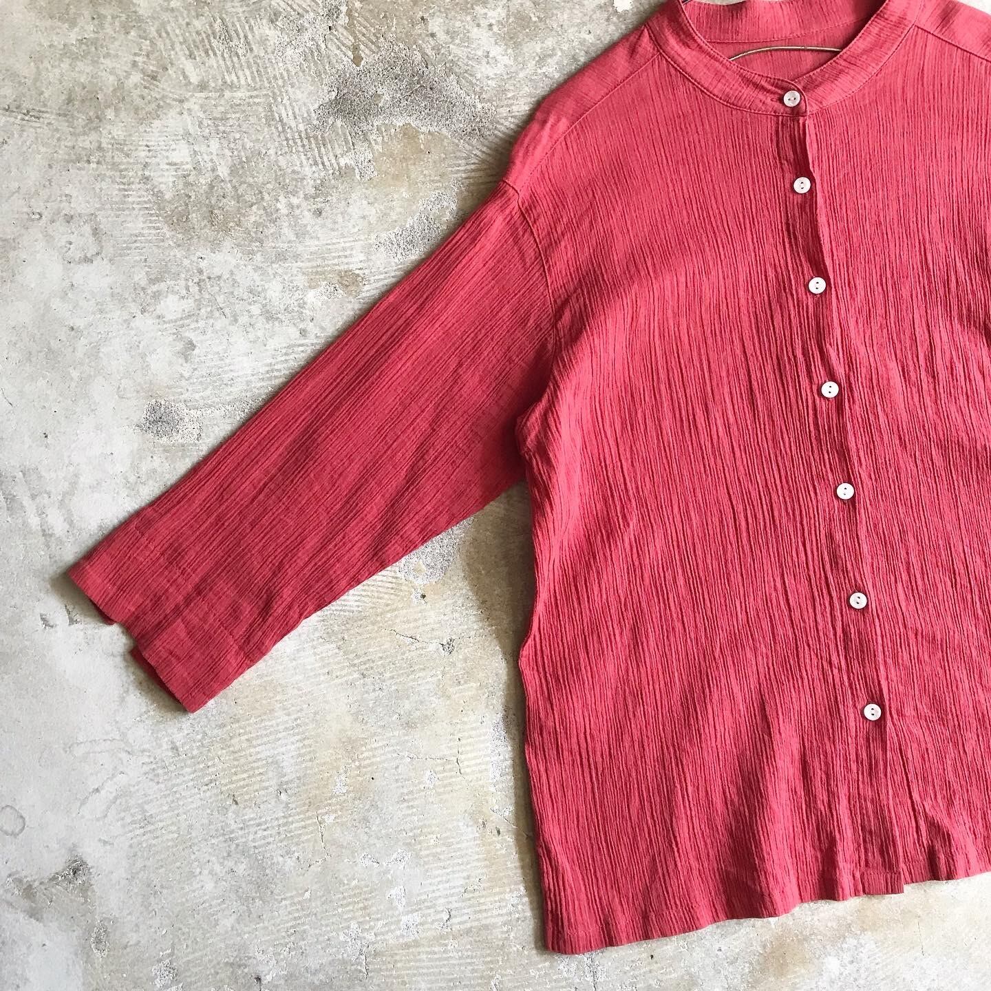 落ち着いた大人っぽい色味と、柔らかな肌触りのコットンの風合いが素敵な七分袖シャツ。すっきりとしたスタンドカラーが印象的です。ゆるやかなサイズ感なので、羽織りアイテムとしてもオススメです。きれいめにもカジュアルにも、様々な雰囲気でお楽しみいただけます。ほんのり透け感のある、さらりとしコットン素材です。