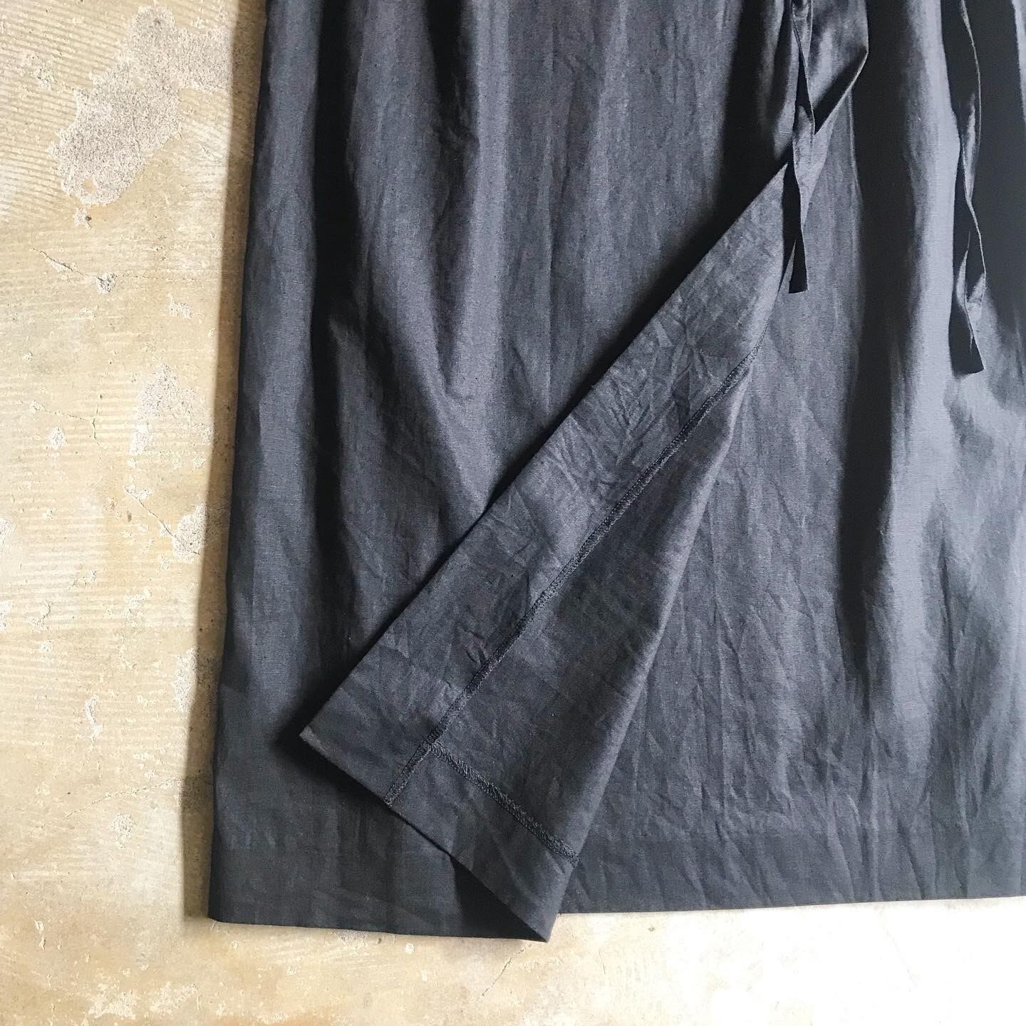 柔らかなブラックの風合いが雰囲気のある巻きスカート。すっきりとしたストレートに近い大人っぽいシルエットが印象的です。さっとパンツに重ねるコーディネートもオススメです。肌触りのよい、さらりとした綿麻の素材感です。裏地は付いていません。光の当たり方によっては、少しだけ透けることがありますので、インナーやボトムス等との重ね着をおすすめ致します。