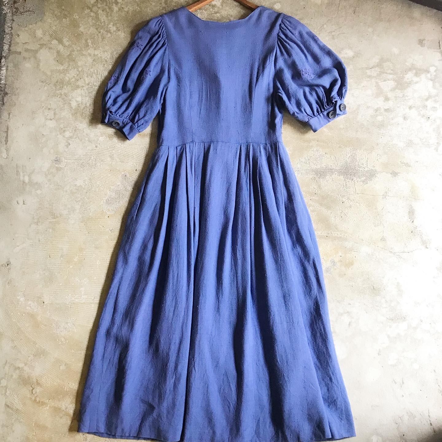 少しくすんだブルー系の色合いが素敵なチロルワンピース。すっきりとした首元のカットとチロルらしいウッドボタン、袖の刺繍が印象的です。自然に下に落ちる少し重みのある生地がつくりだす、広がりすぎないシルエットが大人っぽい雰囲気です。そのまま1枚でワンピースとしてはもちろん、パンツを合わせたり、前を開けて軽く羽織るコーディネートもオススメです。リネン混のさらりとした素材感です。スカート部分に裏地が付いています。