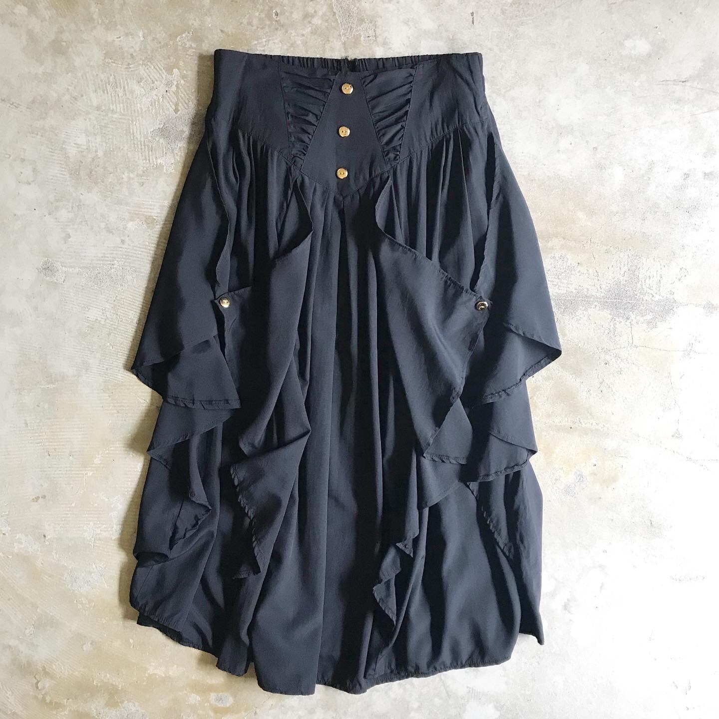クラシックな雰囲気が素敵なユーロブラックスカート。長めな丈感と、たっぷり生地を使ったドレープ、ふんわり広がりすぎず自然に下に落ちる大人っぽいシルエットか印象的です。きれいめな女性らしいコーディネートはもちろん、Tシャツとカジュアルにお楽しみいただくのもオススメです。ほぼ通年でご着用いただける、さらりとしたしなやかな素材感です。裏地は付いていませんが、透け感はありません。