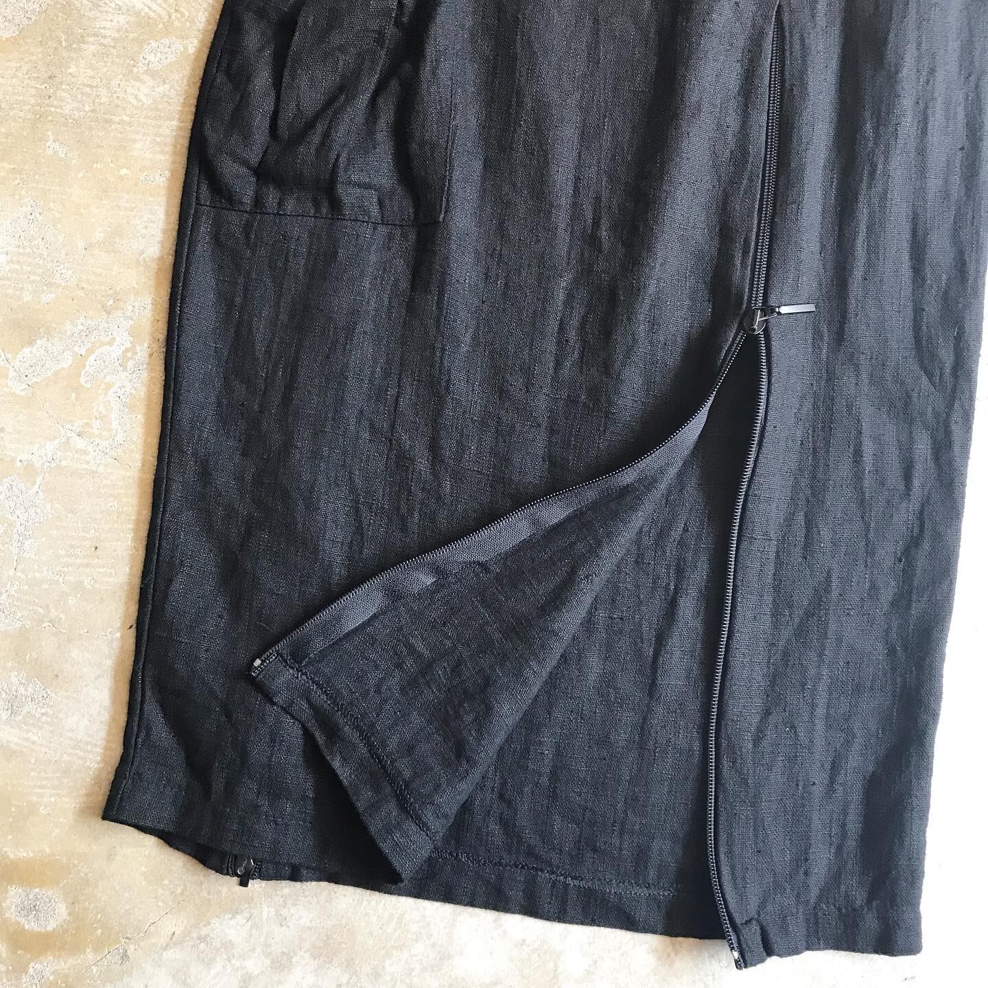 シックなブラックリネンが素敵なロングスカート。フロントのポケットがさりげないアクセントになっています。ストレートに近いすっきりとした、しっかり長めなデザインが大人っぽい雰囲気です。前と後ろそれぞれの裾に付いたジップを上げることで、シルエットの変化をお楽しみいただけます。少しハリのあるリネン素材です。裏地は付いていませんが、透け感はほぼありません。