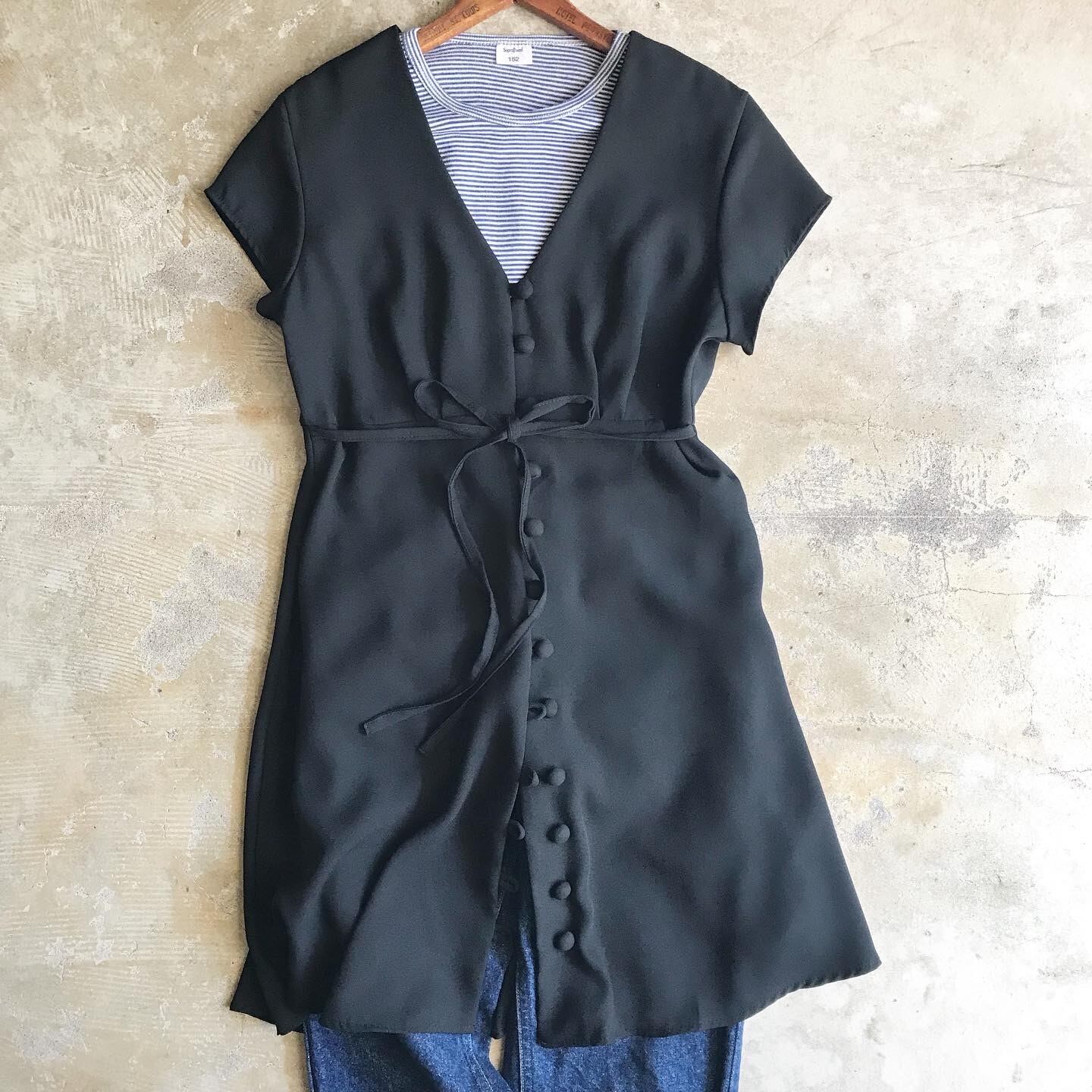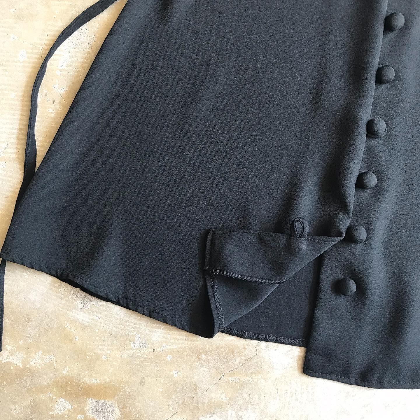 フロントのくるみボタンがクラシックな印象のブラックミニドレス。胸の下辺りで切り替えとなるハイウエストのデザインとなります。両サイドに付いた紐ベルトを前や後ろで結んで、雰囲気の変化もお楽しみいただけます。すっきりとミニドレスとしてはもちろん、パンツを合わせたレイヤードスタイルもオススメです。さらりとしたしなやかな素材感です。裏地は付いていませんが、ほぼ透け感はありません。