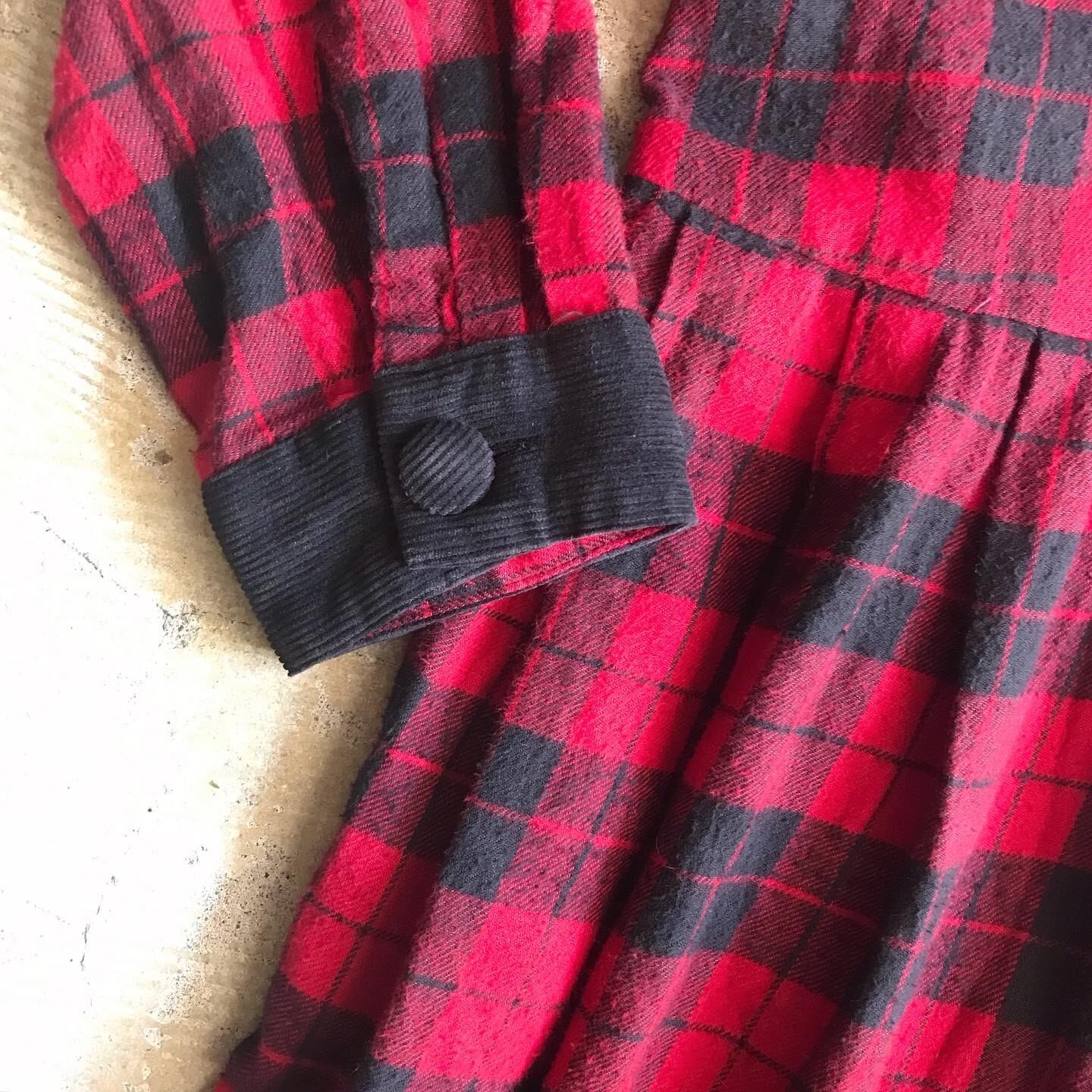 シックな色合いのチェックが印象的なワンピース。襟と袖口、くるみボタンのブラックコーデュロイがさりげないアクセントになっています。ゆるやかなシルエットと、ローウエストのデザインで、大人っぽい雰囲気でお楽しみいただけます。柔らかなネルシャツのような暖かみのあるコットン素材です。裏地は付いていませんが、透け感はありません。