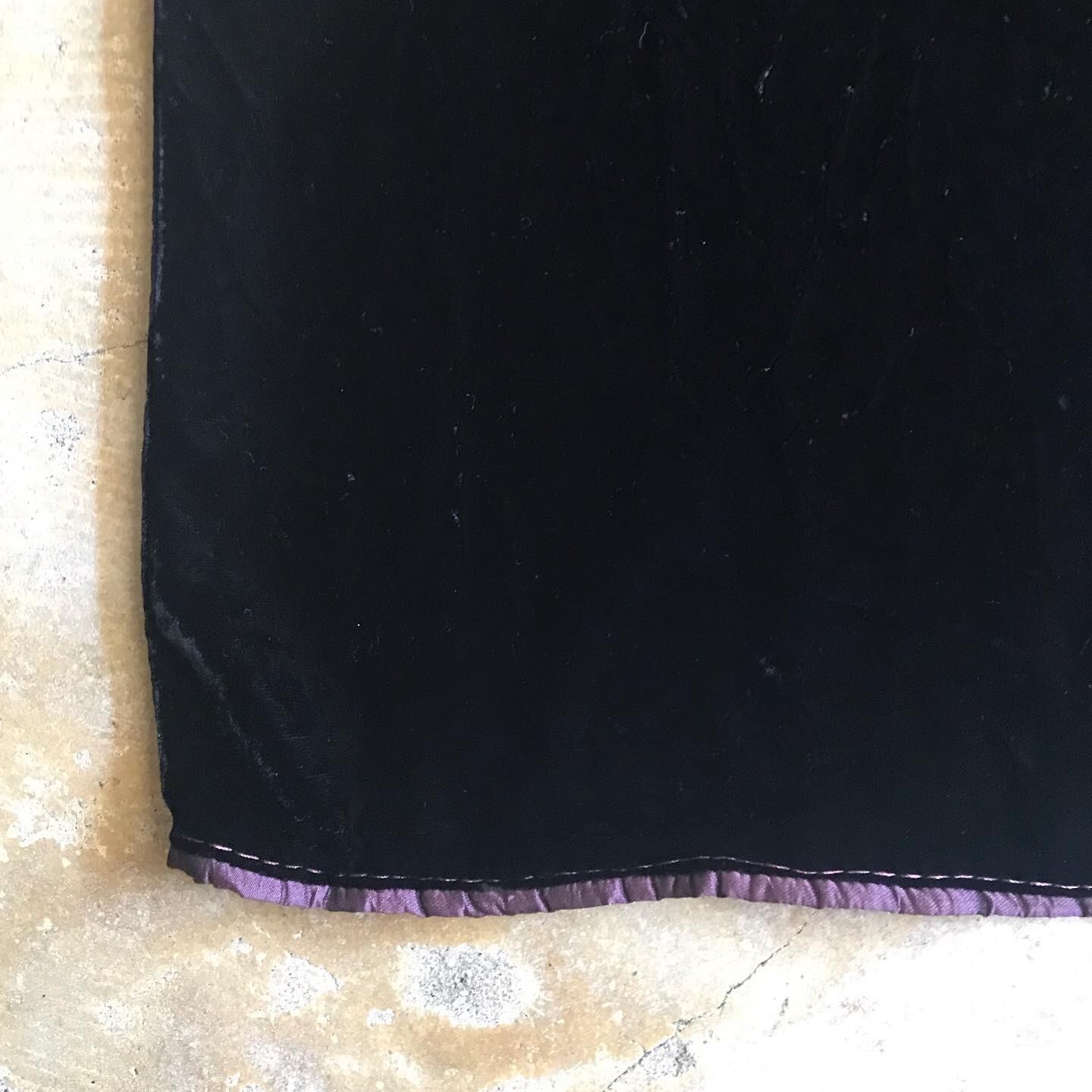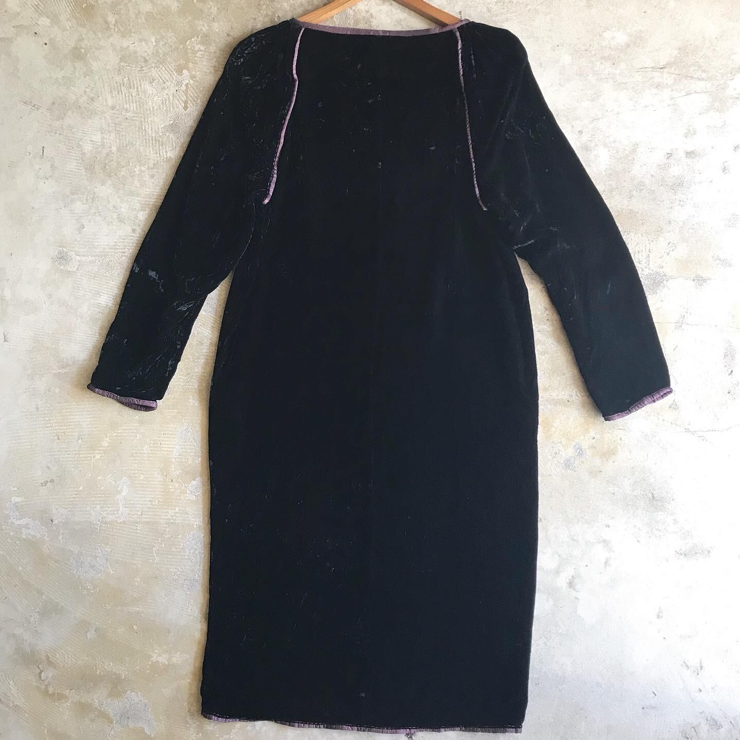 シックなブラックの色合いが素敵なベロアワンピース。すっきりとした首元と袖口・裾・背中にあしらわれたパープルのパイピングや、胸元のステッチ等、さりげなく凝ったディテールが印象的です。自然に下に落ちるストレートに近いシンプルなデザインですが、ベロアの持つ上品な光沢や、女性らしいボートネックが大人っぽく、存在感のある1着になっています。きれいめなドレスとしてはもちろん、パンツを合わせてカジュアルにお楽しみいただくのもオススメです。裏地は付いていませんが、透け感はありません。