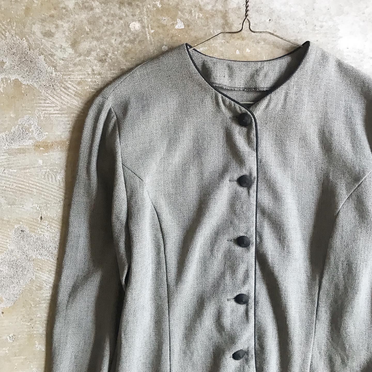 少し暖かみのあるグレーの色合いと、すっきりとしたノーカラーのデザイン。ブラックのパイピングと丸いボタンがアクセントになっています。短めな着丈が様々なコーデで合わせやすく、軽いジャケットとしてはもちろん、ブラウスとしてもお楽しみいただけます。さらりとしたしなやかな素材感です。