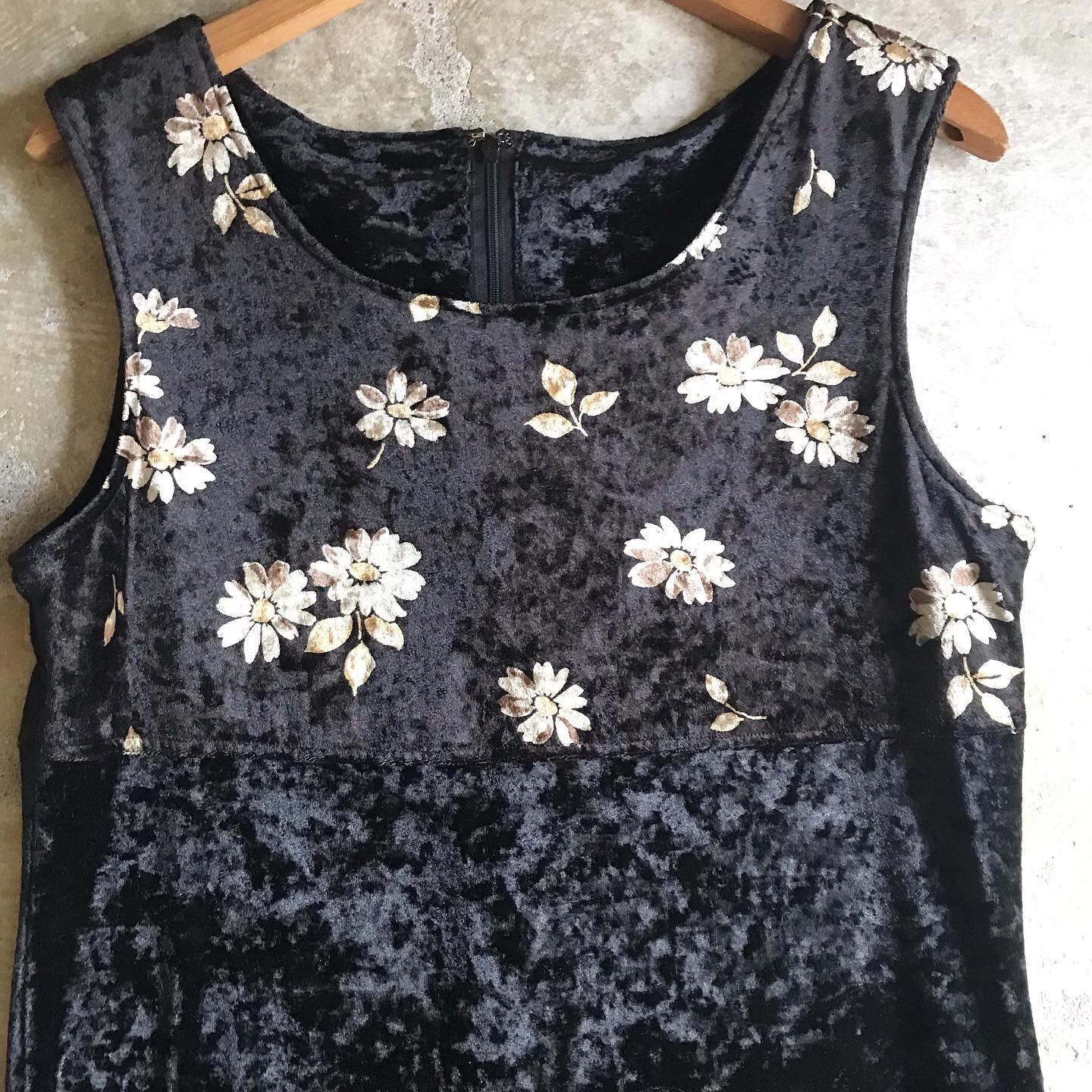 胸の下で切り替えられた花柄と無地のデザイン。ラグジュアリーな雰囲気のブラックベロアが素敵なノースリーブワンピース。広がりすぎず自然に下に落ちるシルエットが大人っぽく、様々なインナーと合わせて、きれいめにもカジュアルにもお楽しみいただけます。柔らかなベロア素材です。裏地は付いていませんが、透け感はありません。