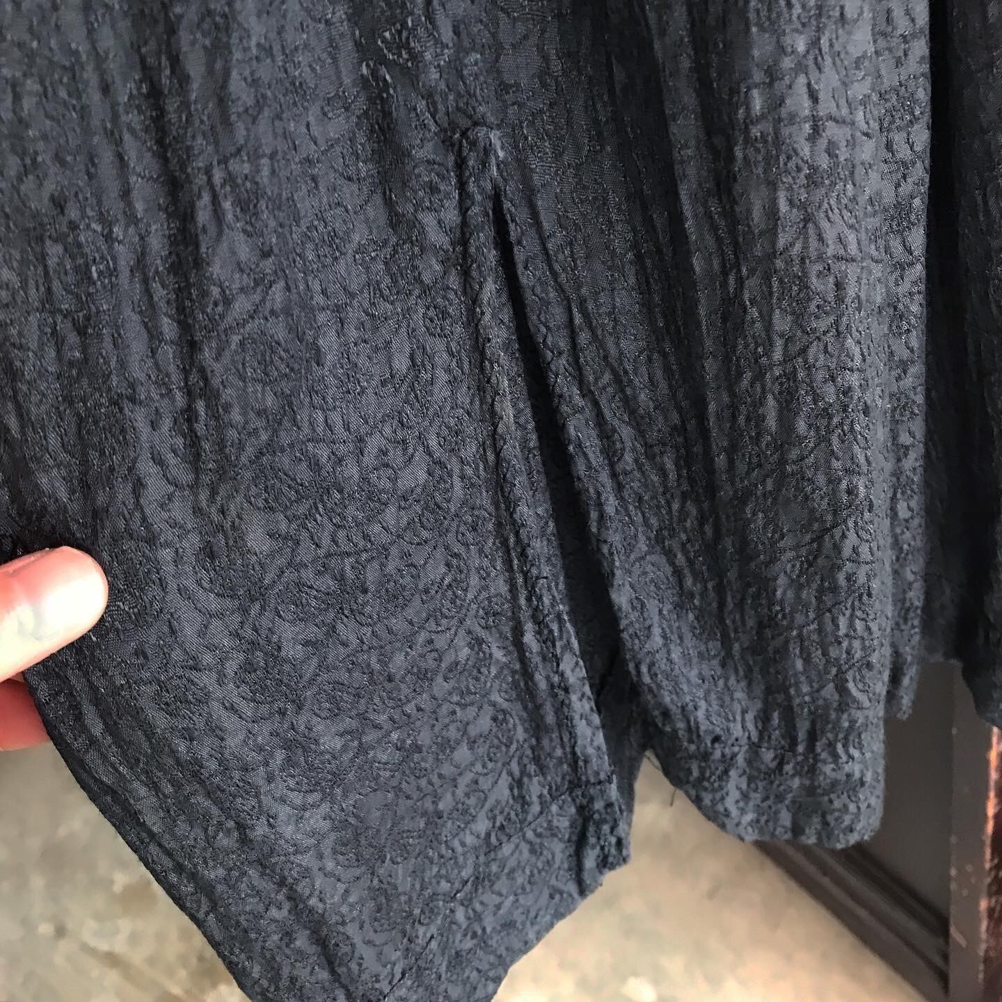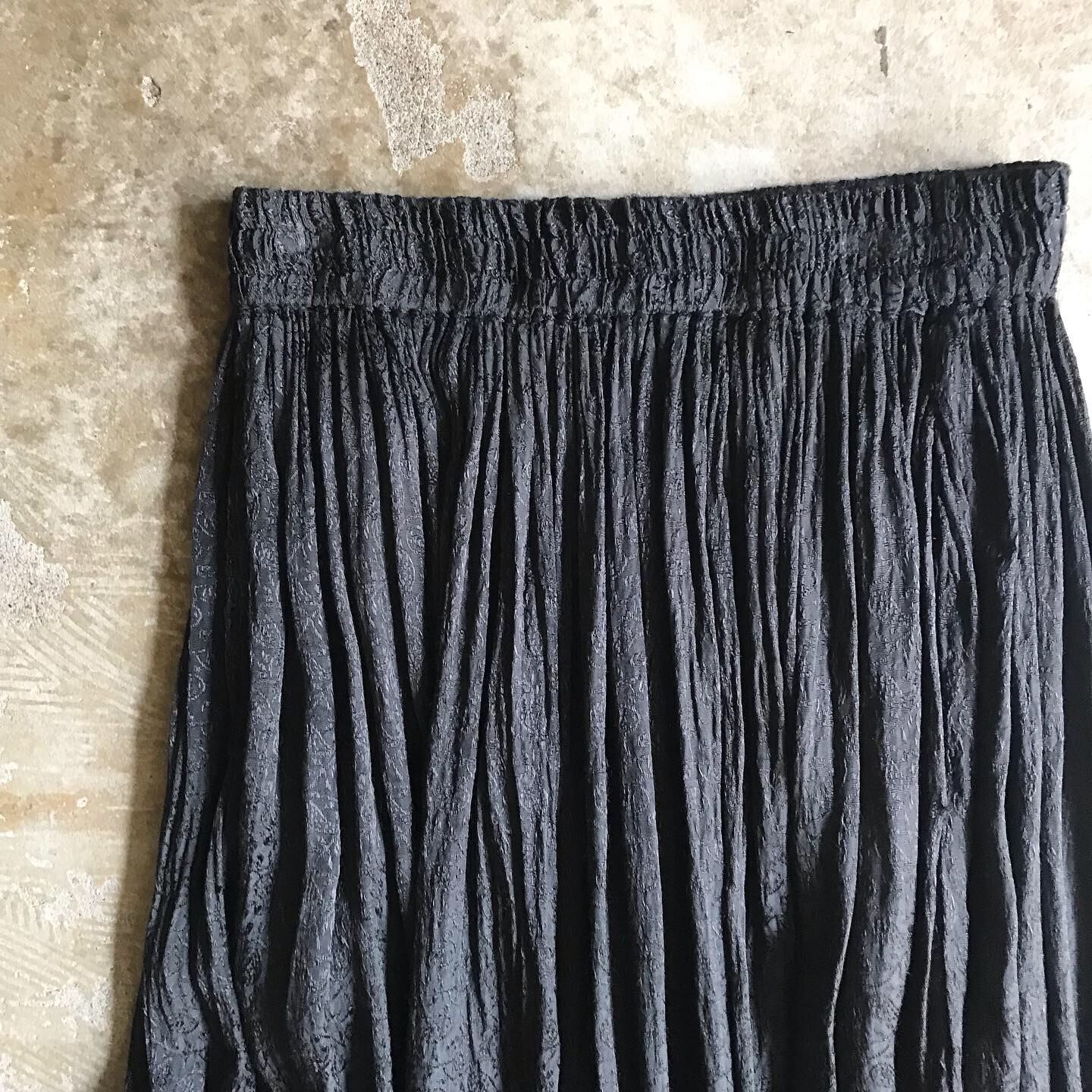 ブラックに近い深みのあるグレーの色合い。上品な地模様も素敵なロングスカート。たっぷり生地を使ったしなやかなレーヨンが作り出す、自然に下に落ちるシルエットが大人っぽい雰囲気です。フロントの左右に入ったスリットがさりげないアクセントになっています。裏地は付いていません。光の当たり方によっては、少しだけ透けることがありますので、インナーやボトムス等との重ね着をお薦め致します。