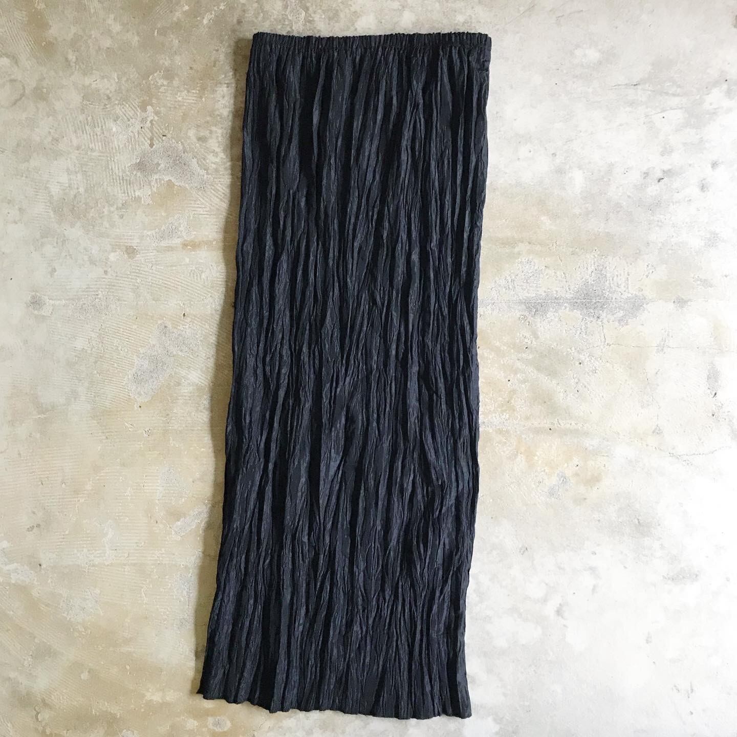 すっきりストレートなシルエットが大人っぽいブラックスカート。クシュクシュでシャカシャカな伸縮性のあるデザイン。身長の高い方にもオススメなしっかり長めな丈感です。ざっくりニットやスウェット等、カジュアルなアイテムをクールな雰囲気にまとめてくれます。ほぼ通年でお楽しみいただける、ハリのある素材感です。裏地は付いていませんが、透け感はありません。