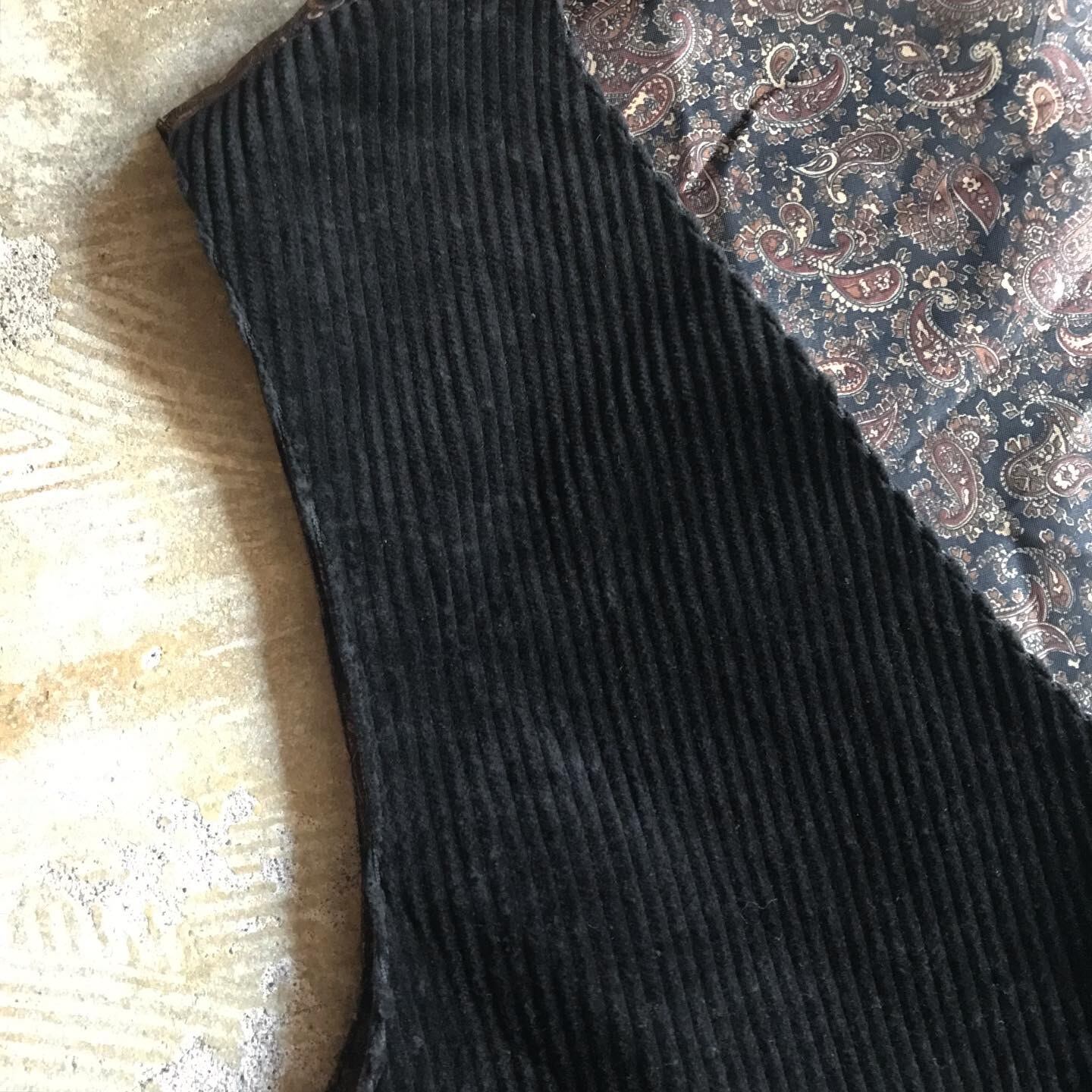 フロントの部分は、柔らかな発色のブラックコーデュロイ。背中の部分はさらりとした少し光沢のあるペイズリー柄。フロントと背中で異なる雰囲気を持つデザインが印象的なベストです。厚手すぎないコーデュロイが使いやすく、様々なコーディネートで活躍してくれそうです。