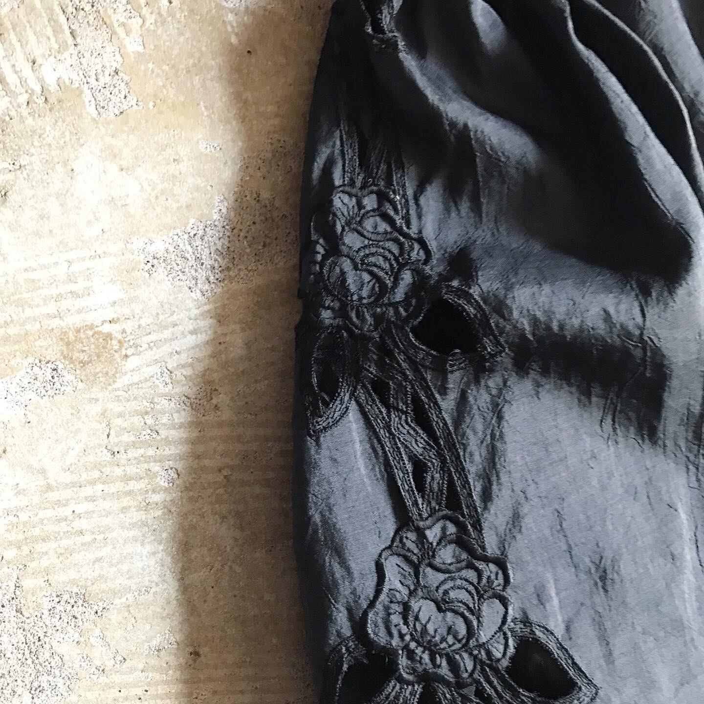 ボリュームのある袖にあしらわれた花の透かし刺繍が素敵なブラックブラウス。透かし刺繍を活かしたインナーとのレイヤードコーデもオススメです。付属のボウタイはリボン結びにしたり、ネクタイのようにしたり、ボウタイ無しでシンプルにもお楽しみいただけます。少し光沢とハリのある、しなやかでさらりとした素材感です。