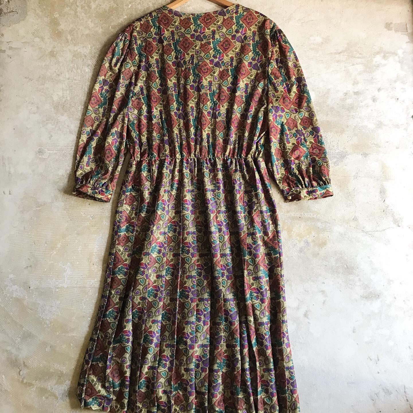 落ち着いた色合いで描かれた柄が大人っぽい雰囲気のワンピース。小さな金ボタンがさりげないアクセントになっています。すっきりとした首元と、ゆるやかなデザインを活かして、ハイネック等との重ね着もオススメです。少し光沢のある、さらりとしたしなやかな素材感です。裏地は付いていませんが透け感はありません。